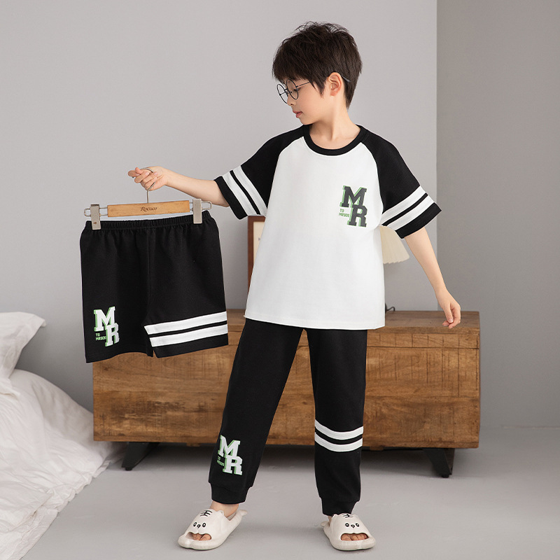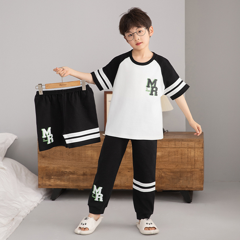 소년 잠옷 봄과 여름 새로운 반팔 바지 순수 코튼 3 피스 세트 십대 소년 어린이 가정 의류 세트