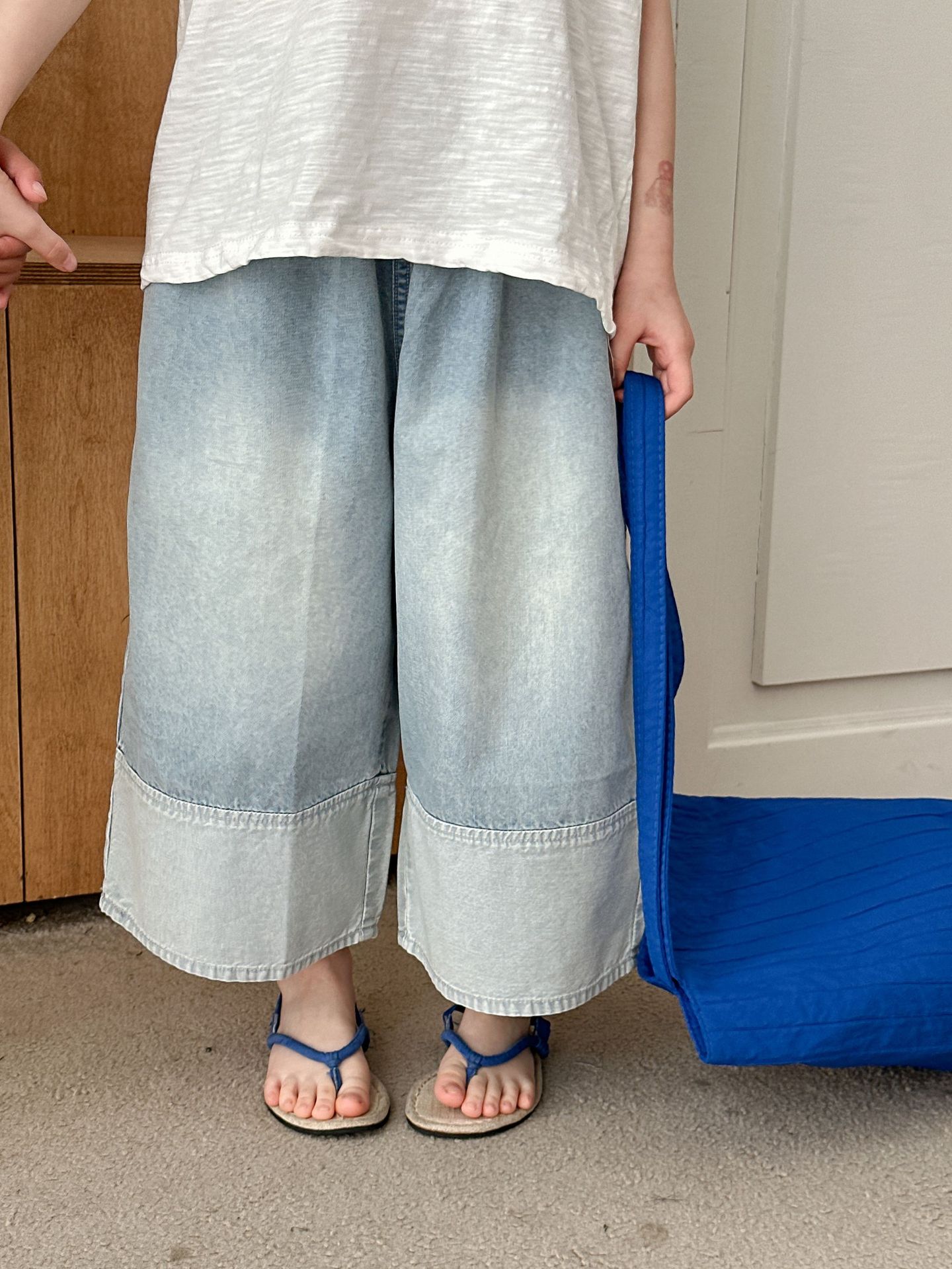 어린이 여름 한국식 캐주얼 느슨한 스티칭 청바지 소년 소녀를위한 얇은 올매치 스트레이트 와이드 레그 바지