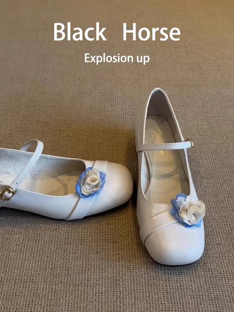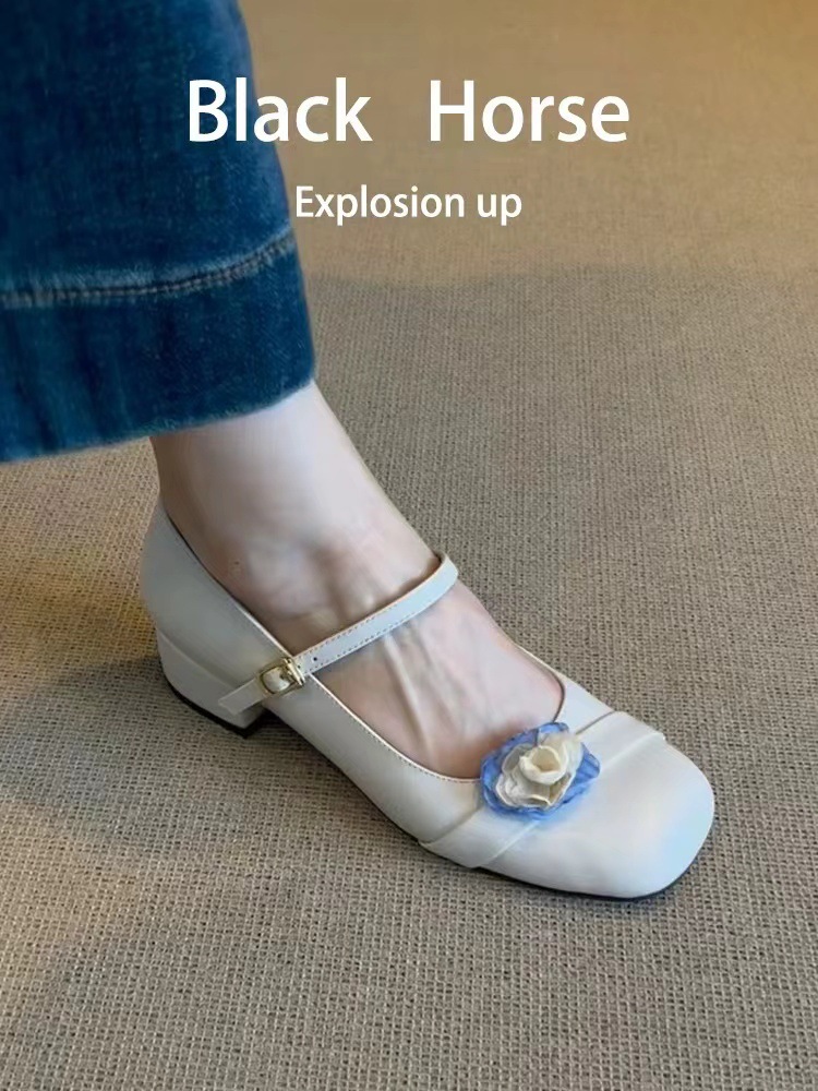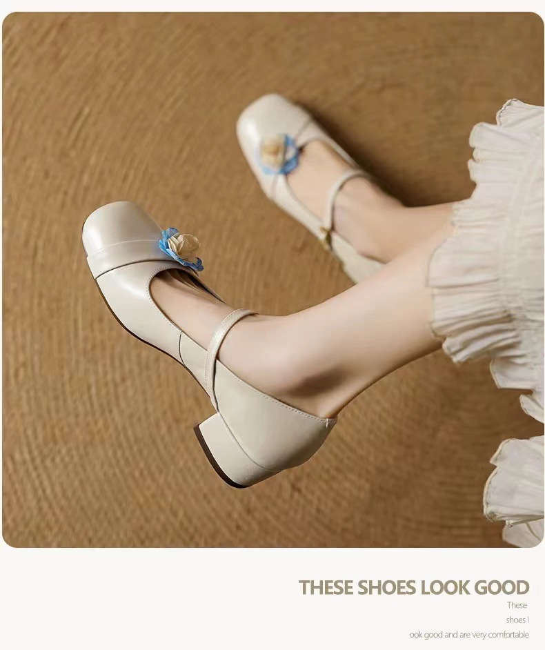 프랑스 스타일 스퀘어 헤드 큰 꽃 얕은 입 메리 제인 신발 여성 패션 올 매치 통근 두꺼운 힐 소프트 가죽 스커트 여성 싱글 레이어 신발스토어 가기