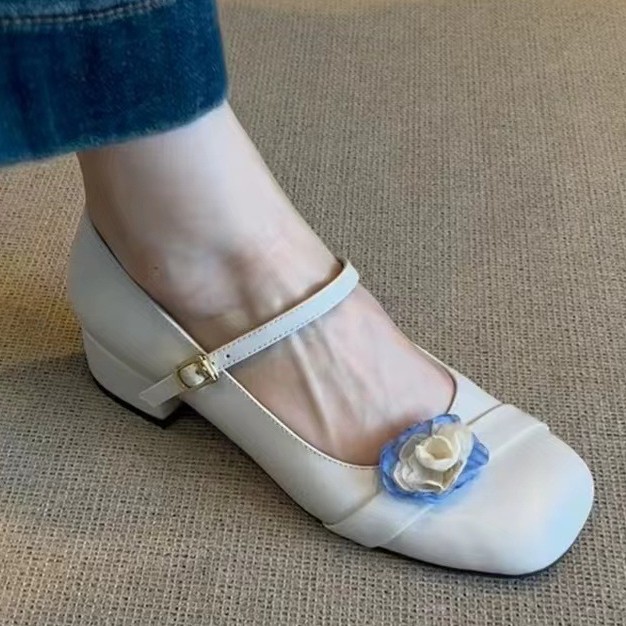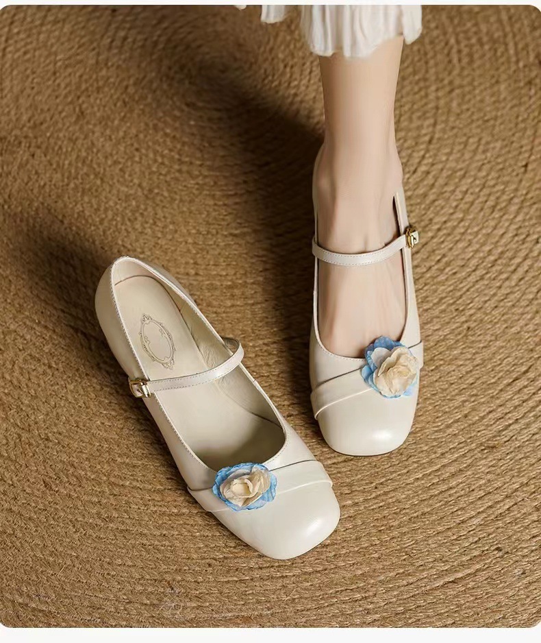 프랑스 스타일 스퀘어 헤드 큰 꽃 얕은 입 메리 제인 신발 여성 패션 올 매치 통근 두꺼운 힐 소프트 가죽 스커트 여성 싱글 레이어 신발