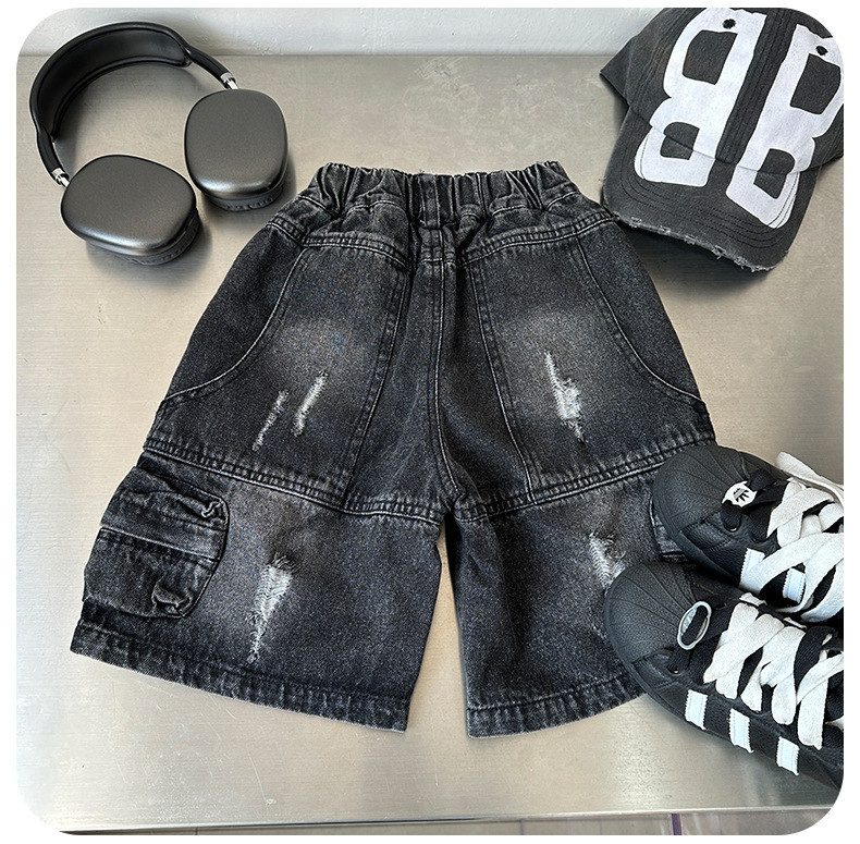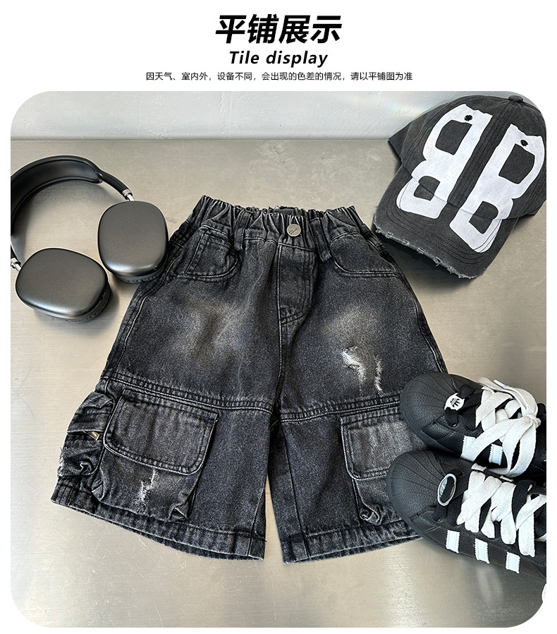 2025 새로운 어린이 아메리칸 스타일 레트로 멀티 포켓 착용 데님 반바지 여름 중공업 느슨한 바지