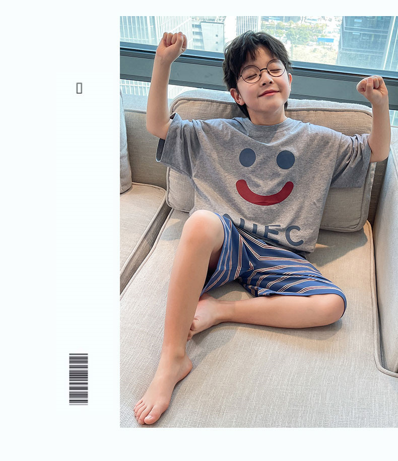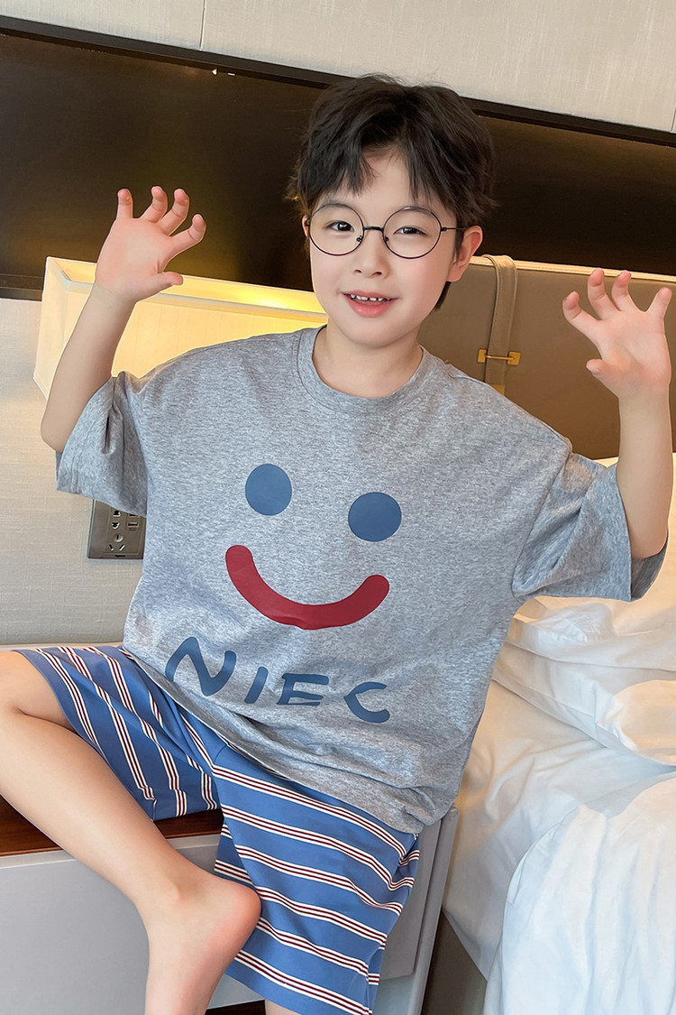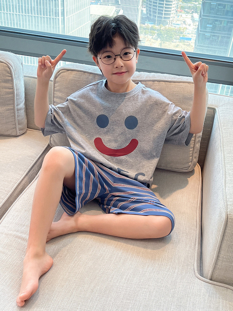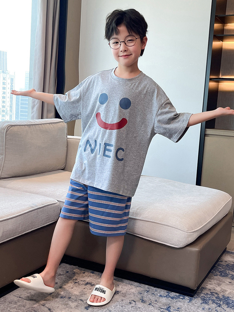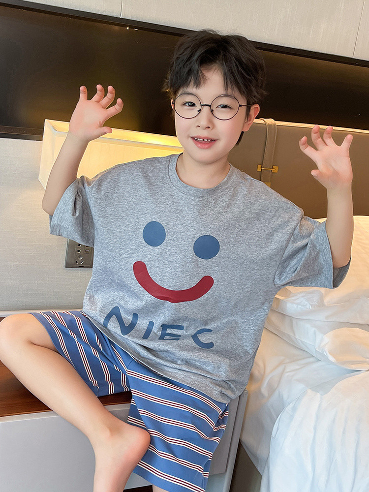 소년 짧은 소매 잠옷 세트 여름 소년 웃는 줄무늬 홈 옷 캐주얼 어린이 복장 2 피스 세트 도매