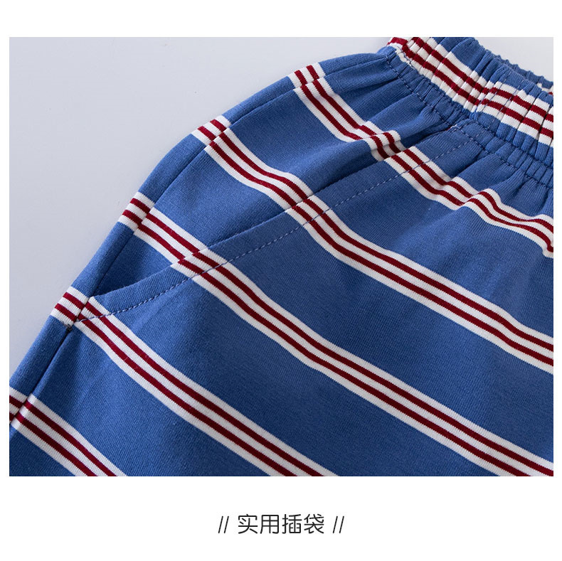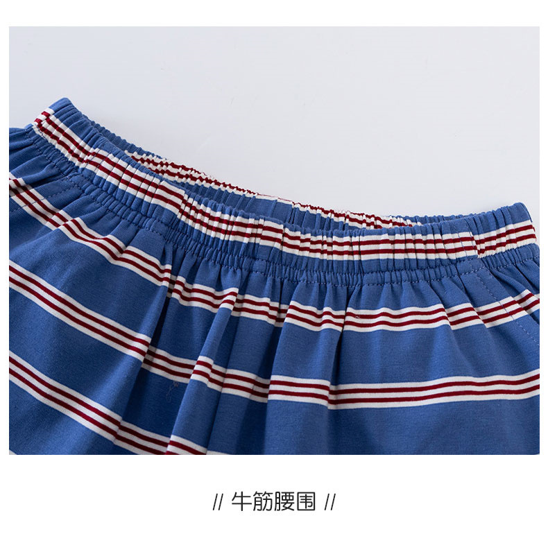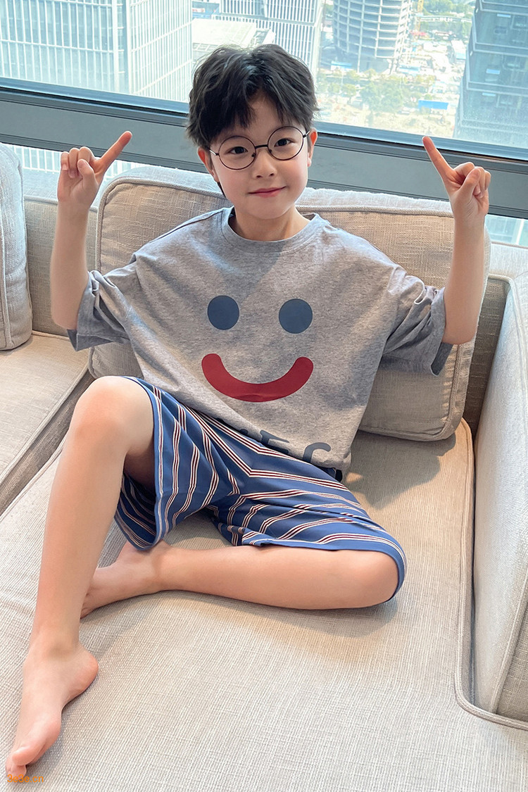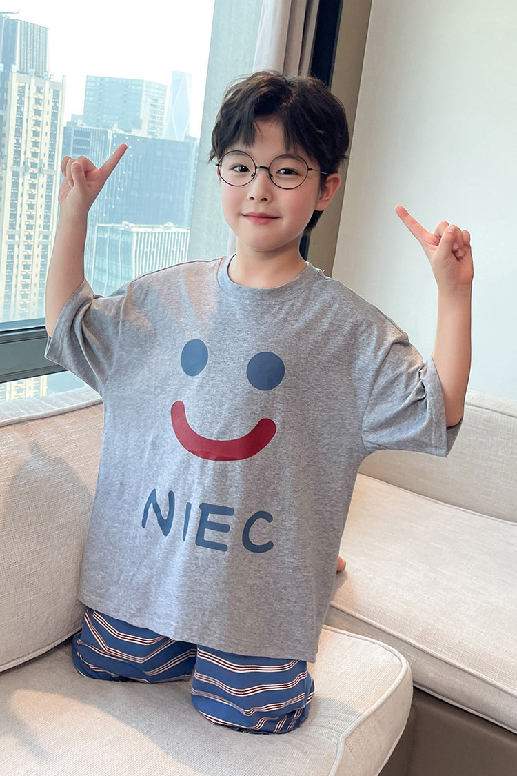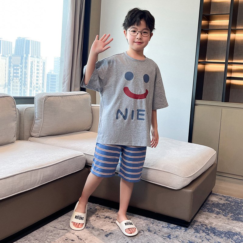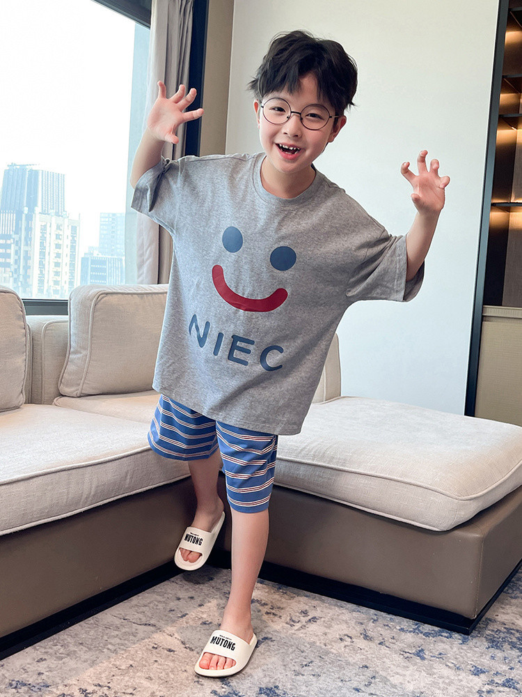 소년 짧은 소매 잠옷 세트 여름 소년 웃는 줄무늬 홈 옷 캐주얼 어린이 복장 2 피스 세트 도매