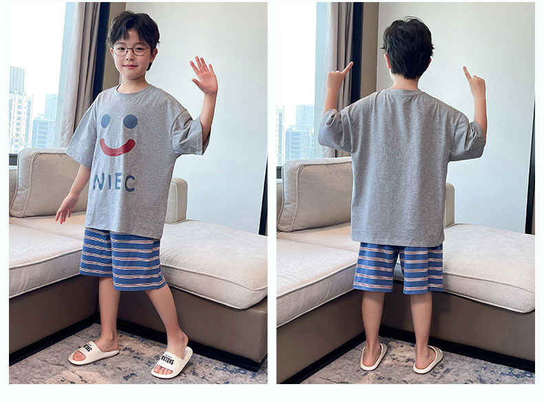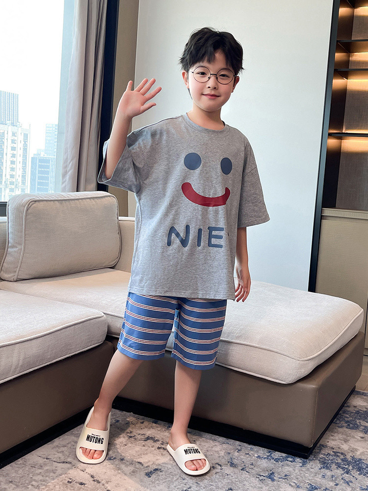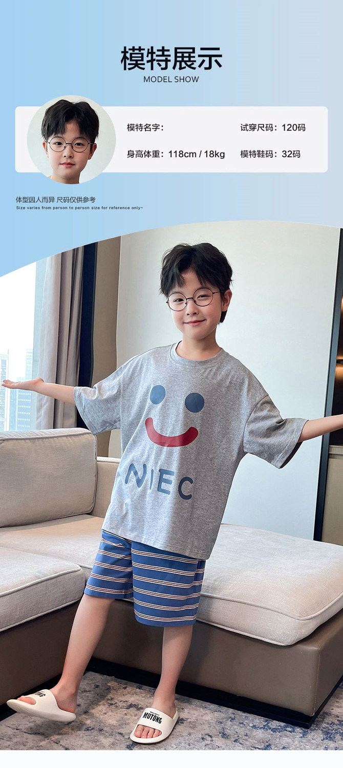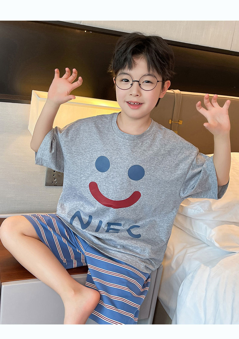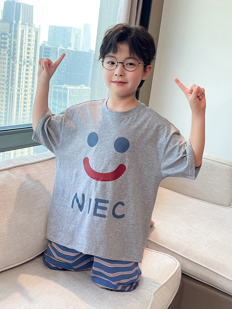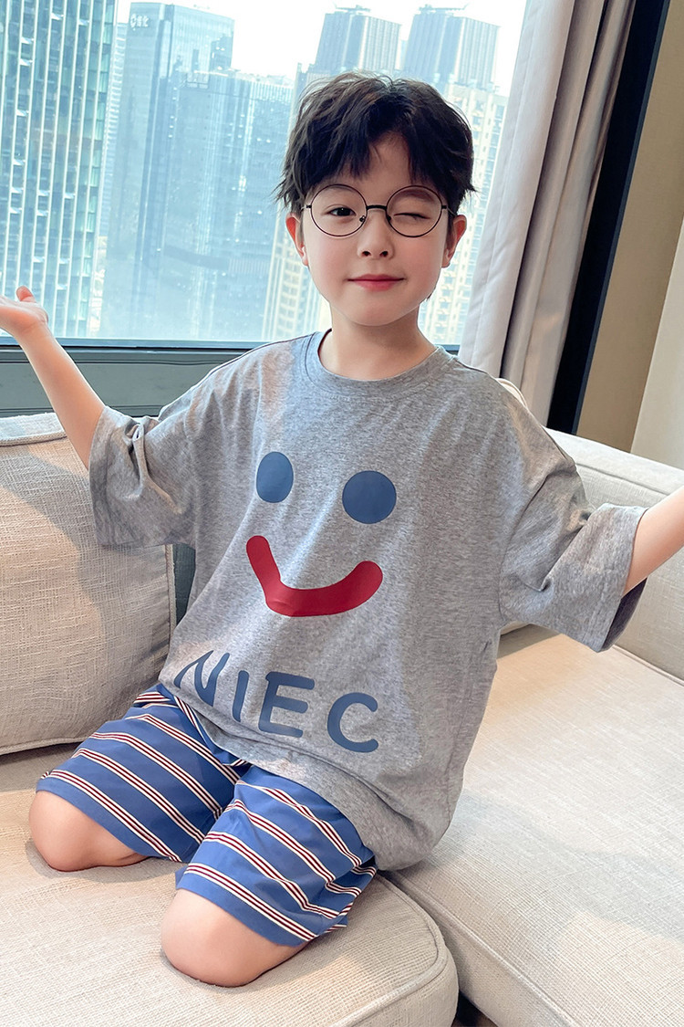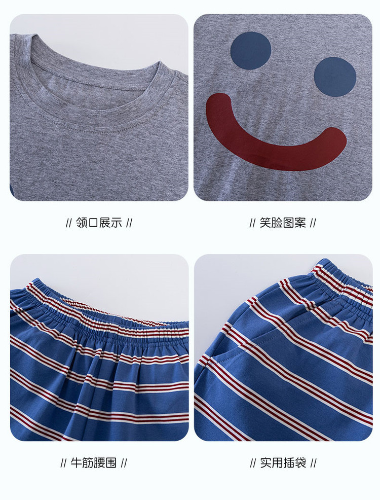 소년 짧은 소매 잠옷 세트 여름 소년 웃는 줄무늬 홈 옷 캐주얼 어린이 복장 2 피스 세트 도매스토어 가기