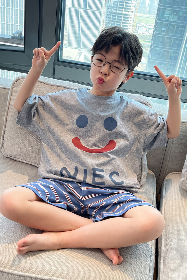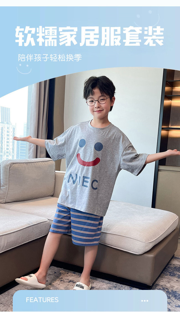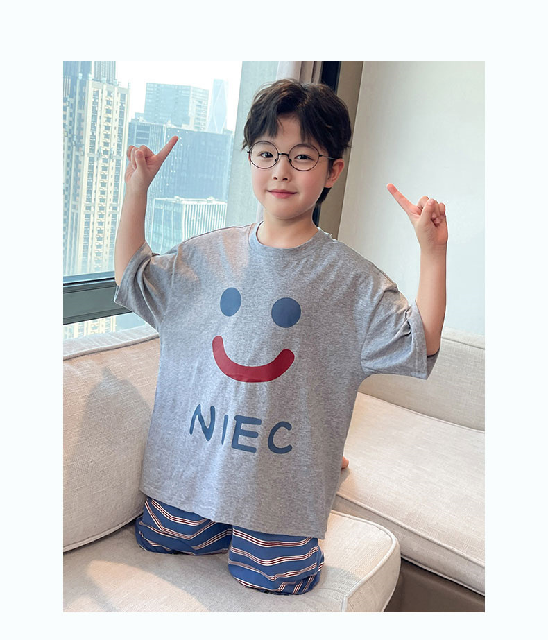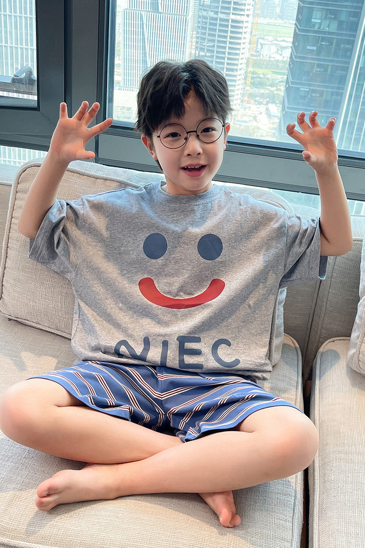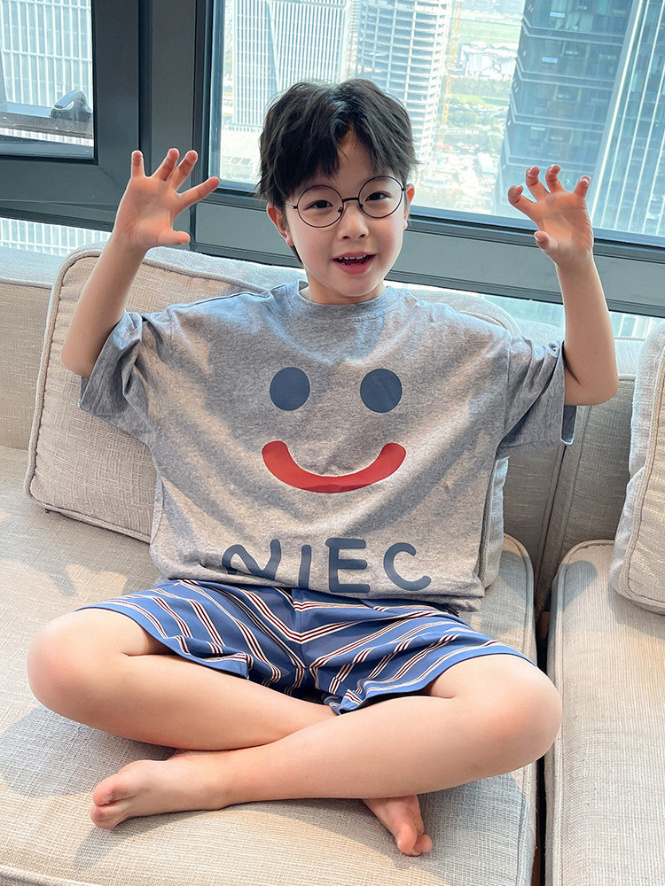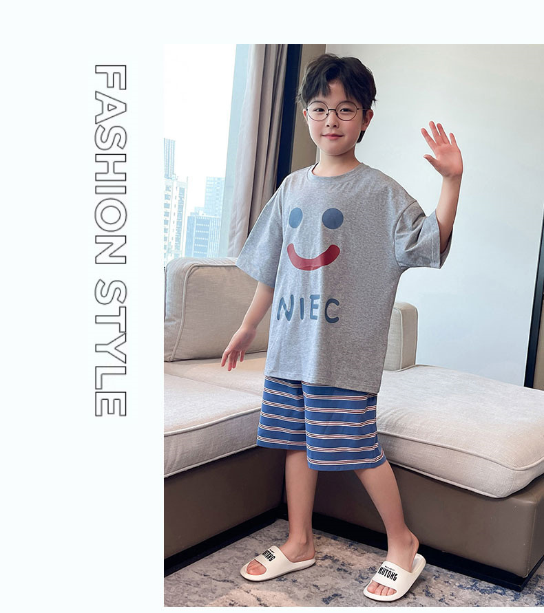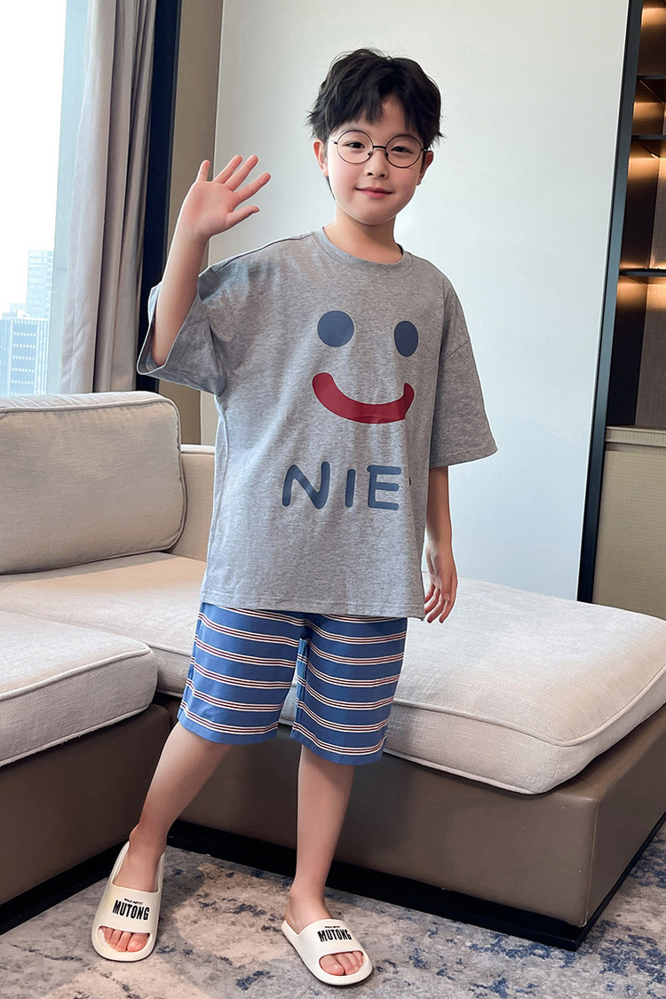 소년 짧은 소매 잠옷 세트 여름 소년 웃는 줄무늬 홈 옷 캐주얼 어린이 복장 2 피스 세트 도매스토어 가기
