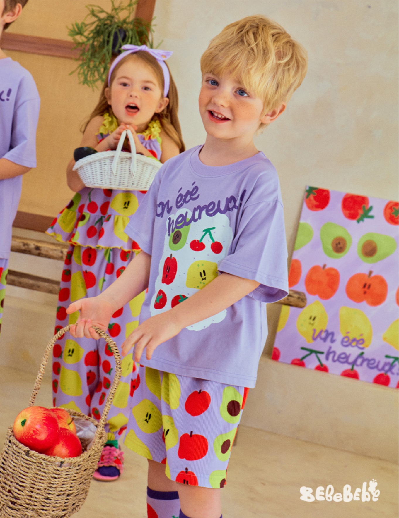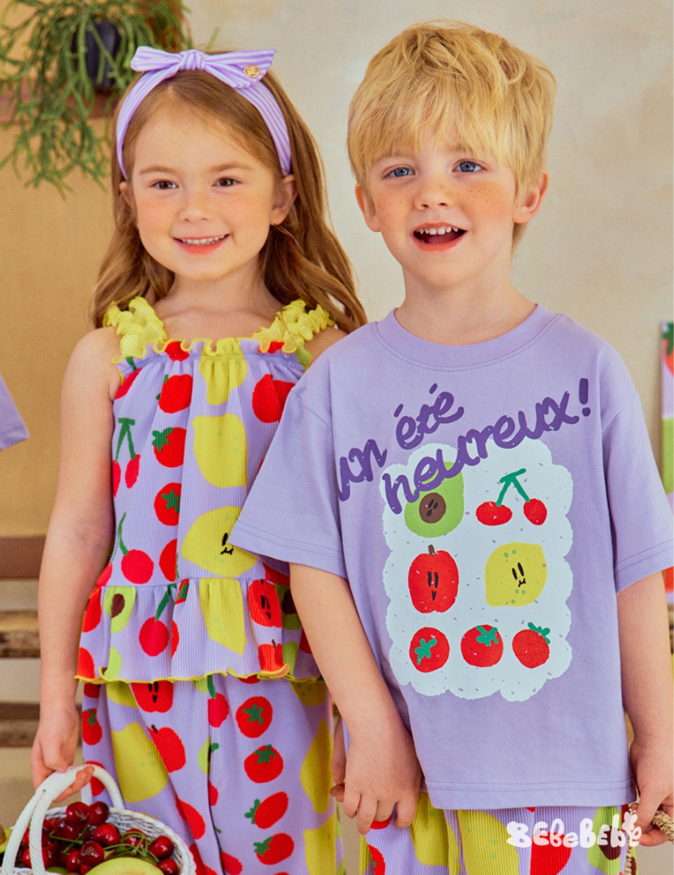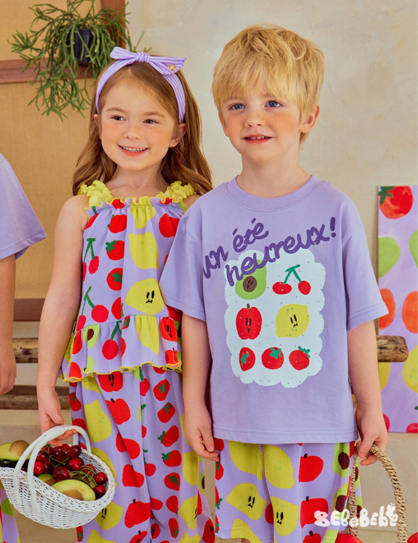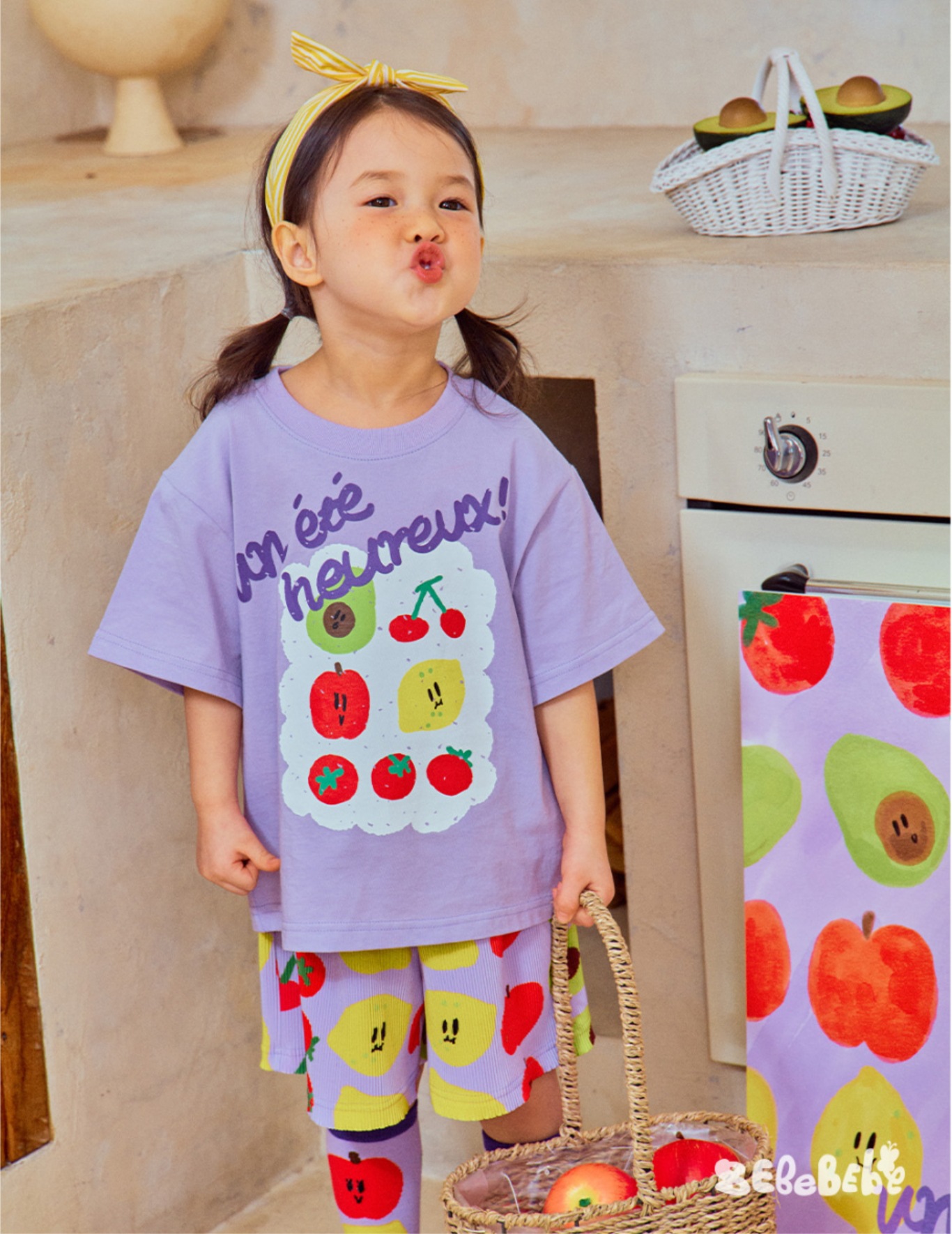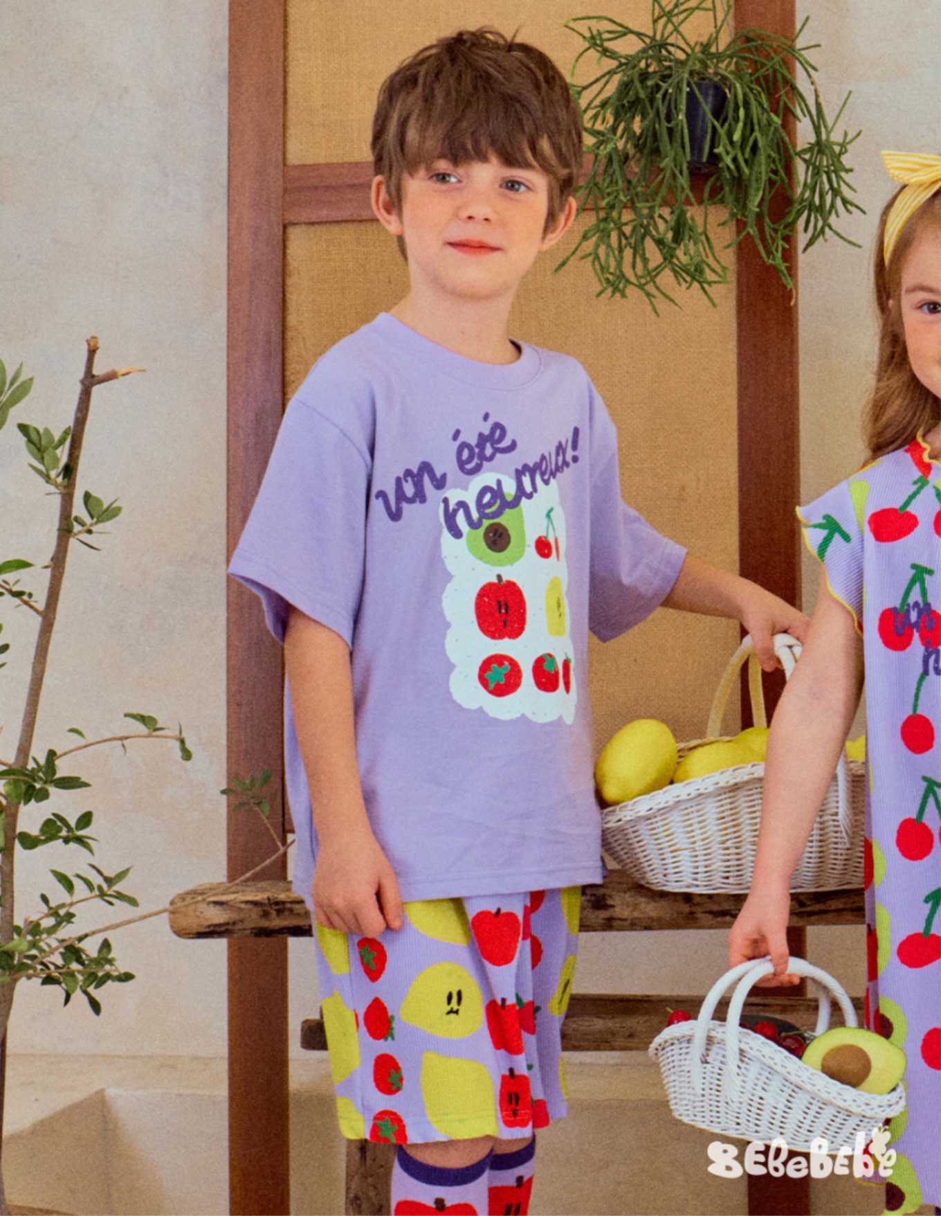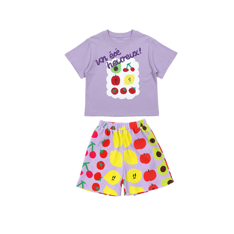 • BE 보라색 과일 프린트 티셔츠 + 반바지 세트