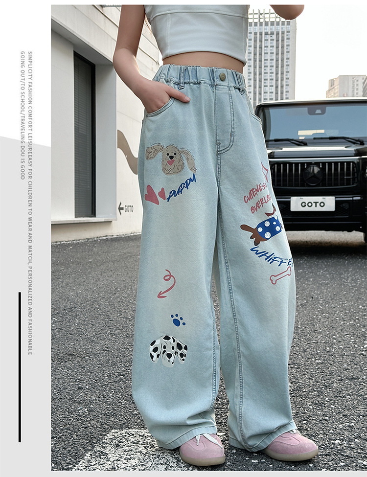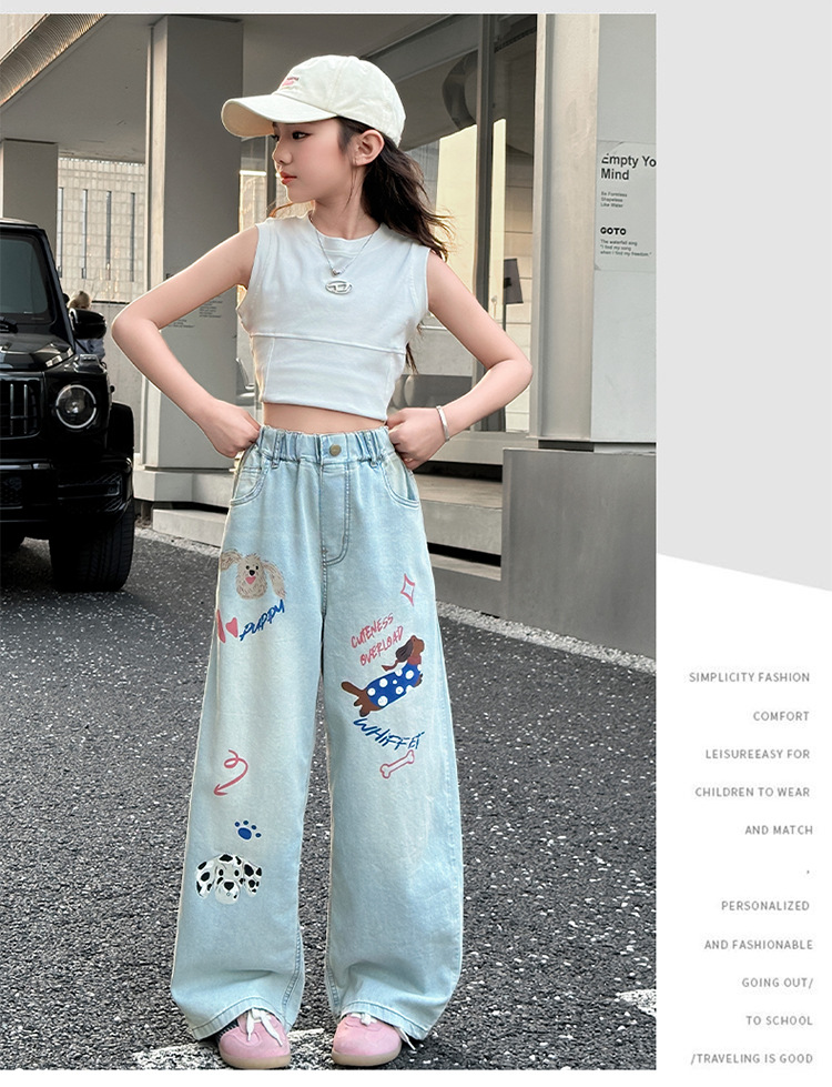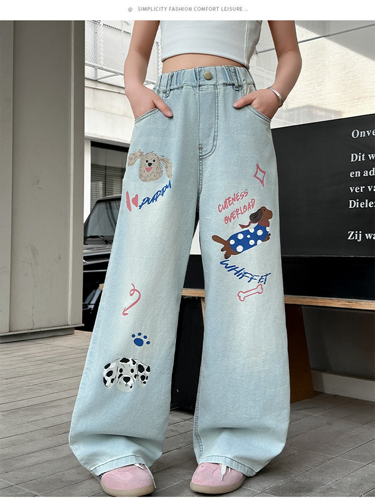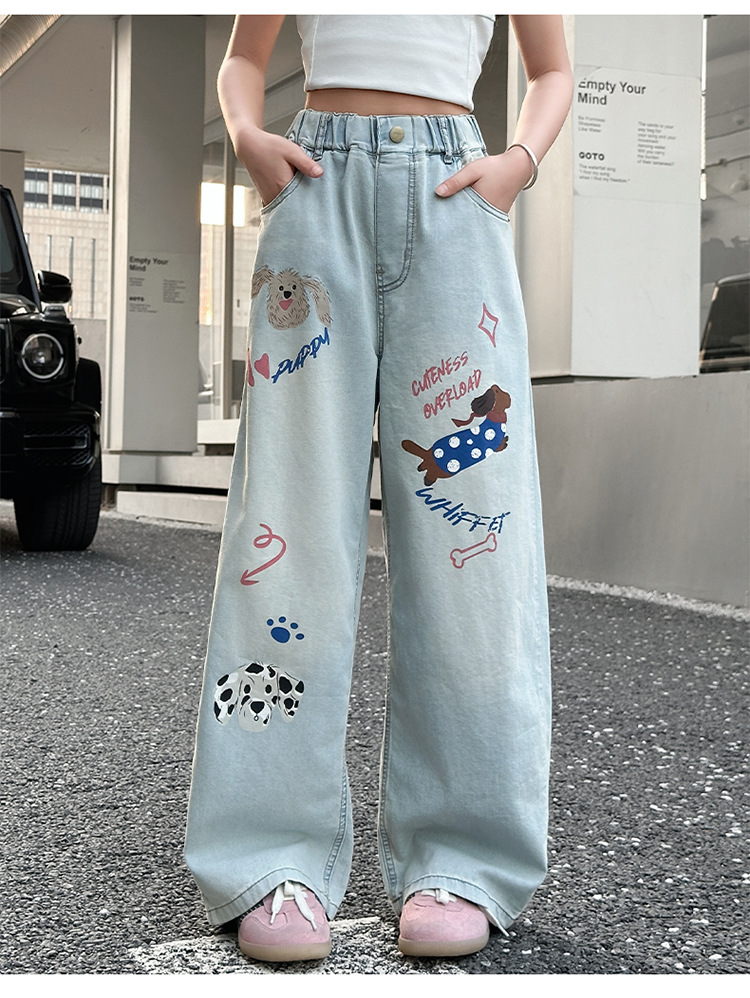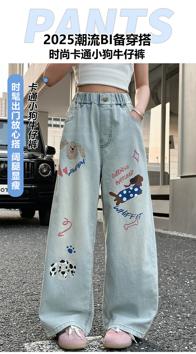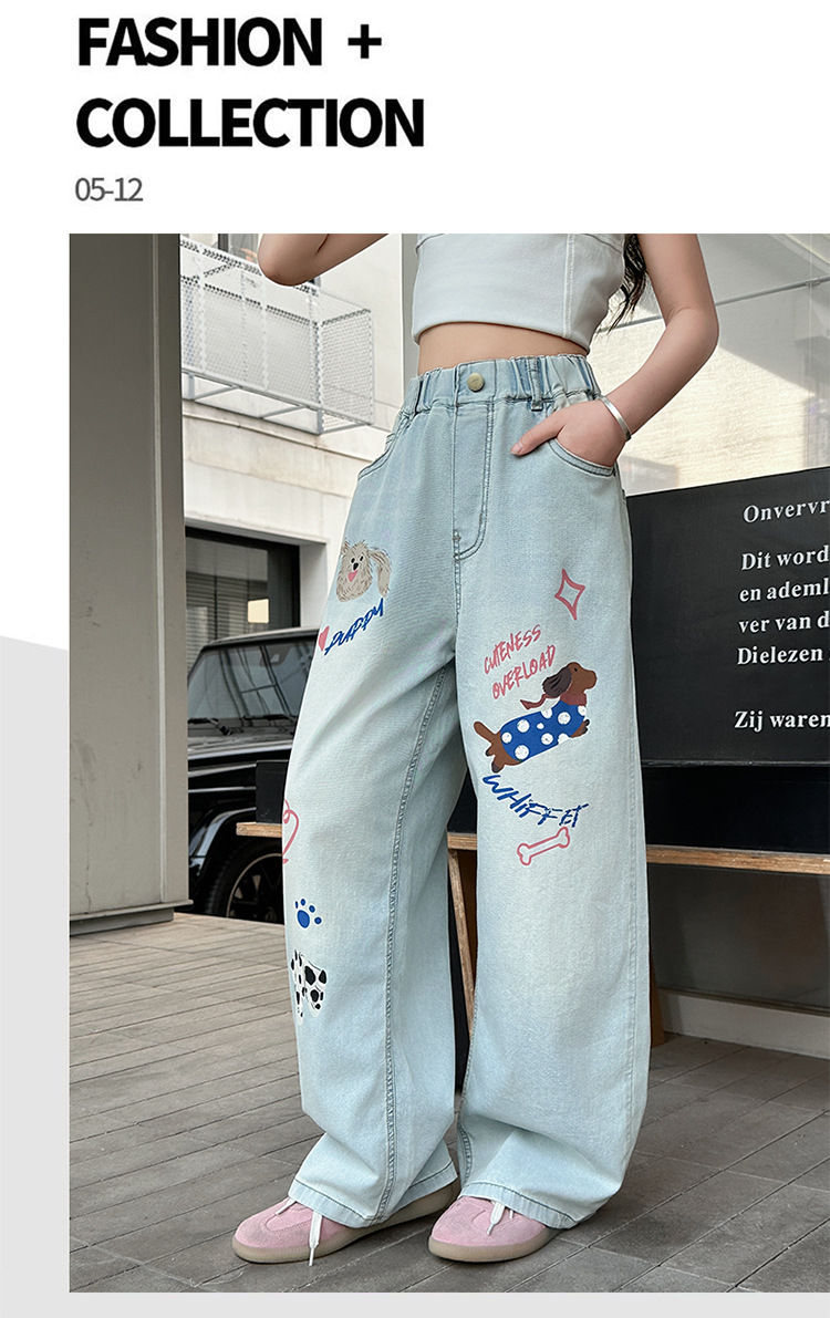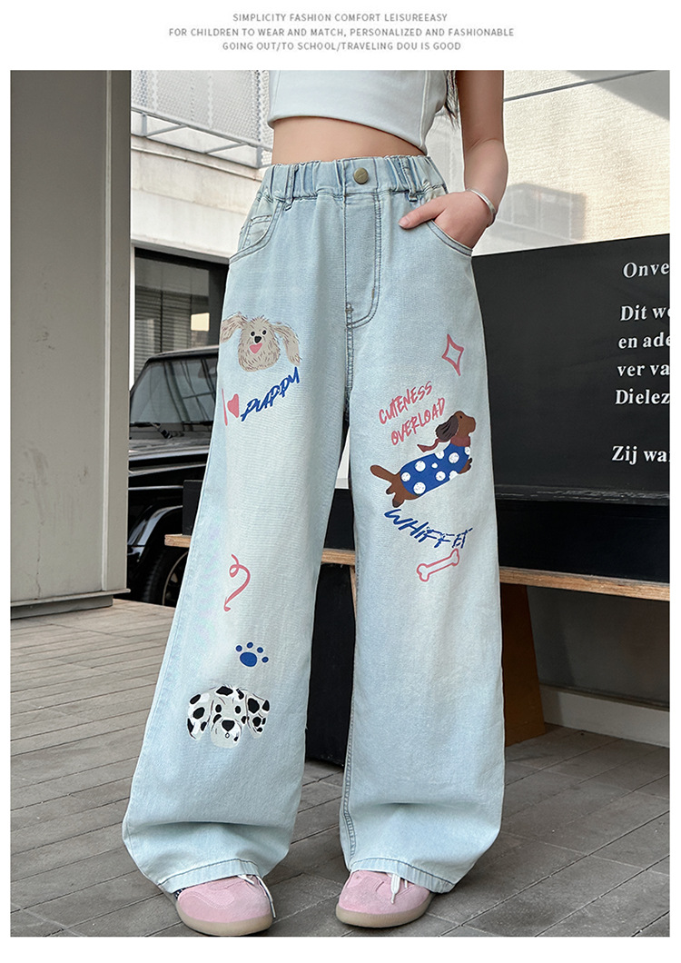 여아 얇은 청바지 2025 새로운 스타일 어린 소녀의 세련된 루즈한 와이드 팬츠 중대형 아동용 프린트 스트레이트 팬츠 트렌디스토어 가기