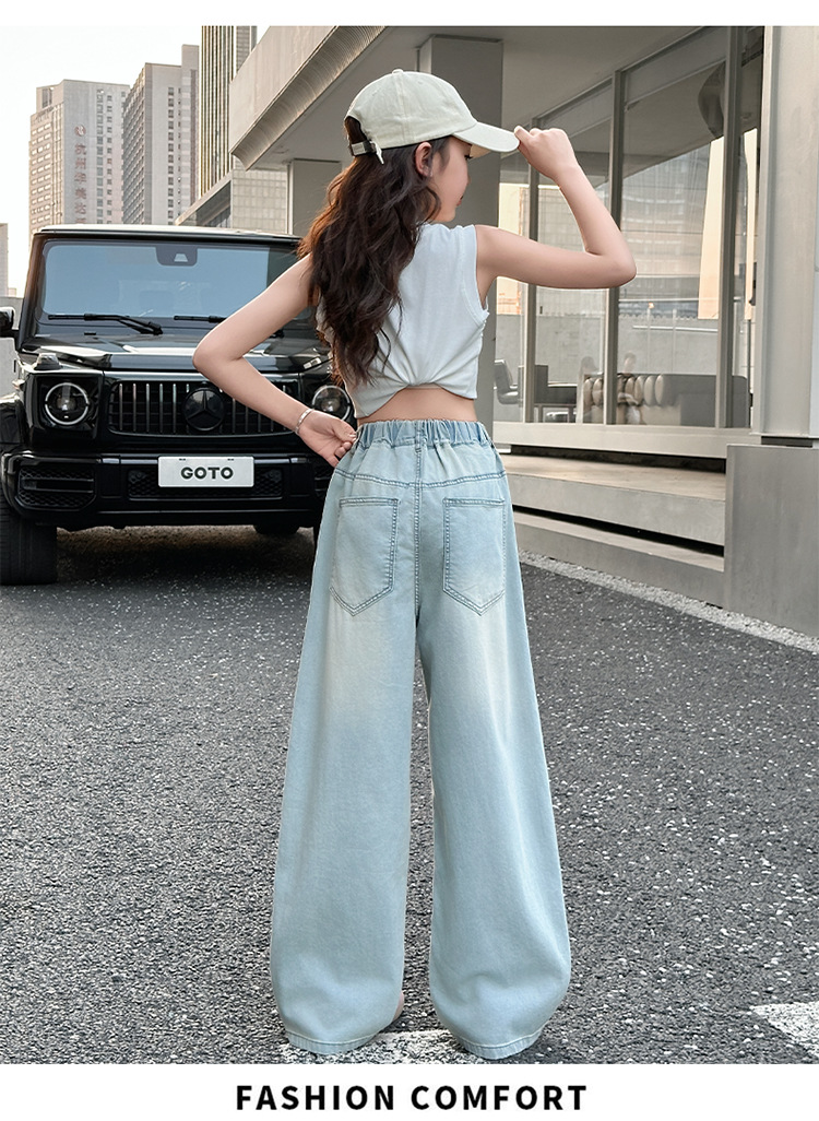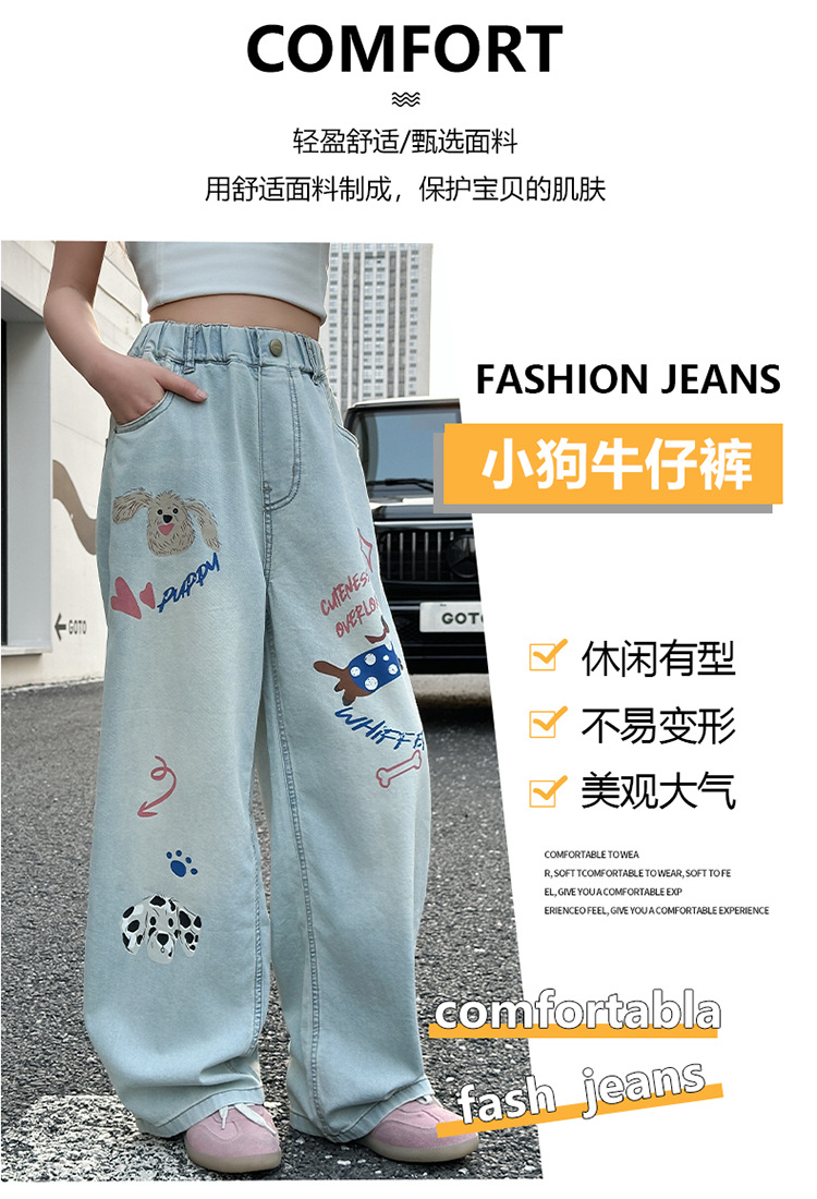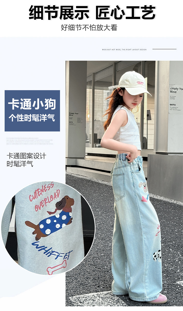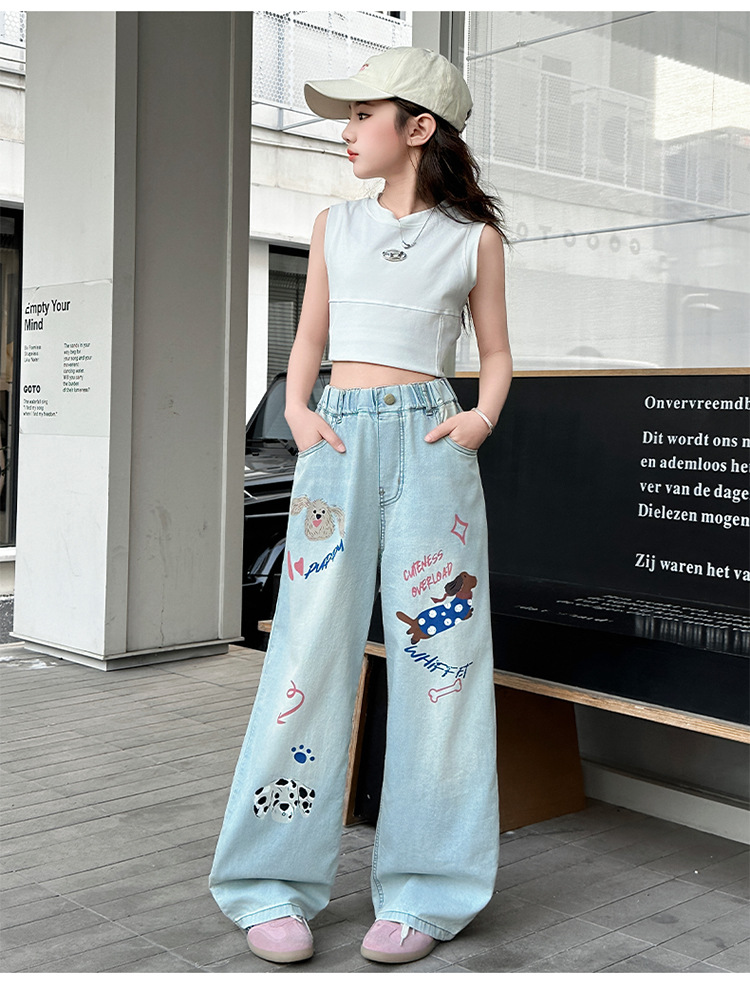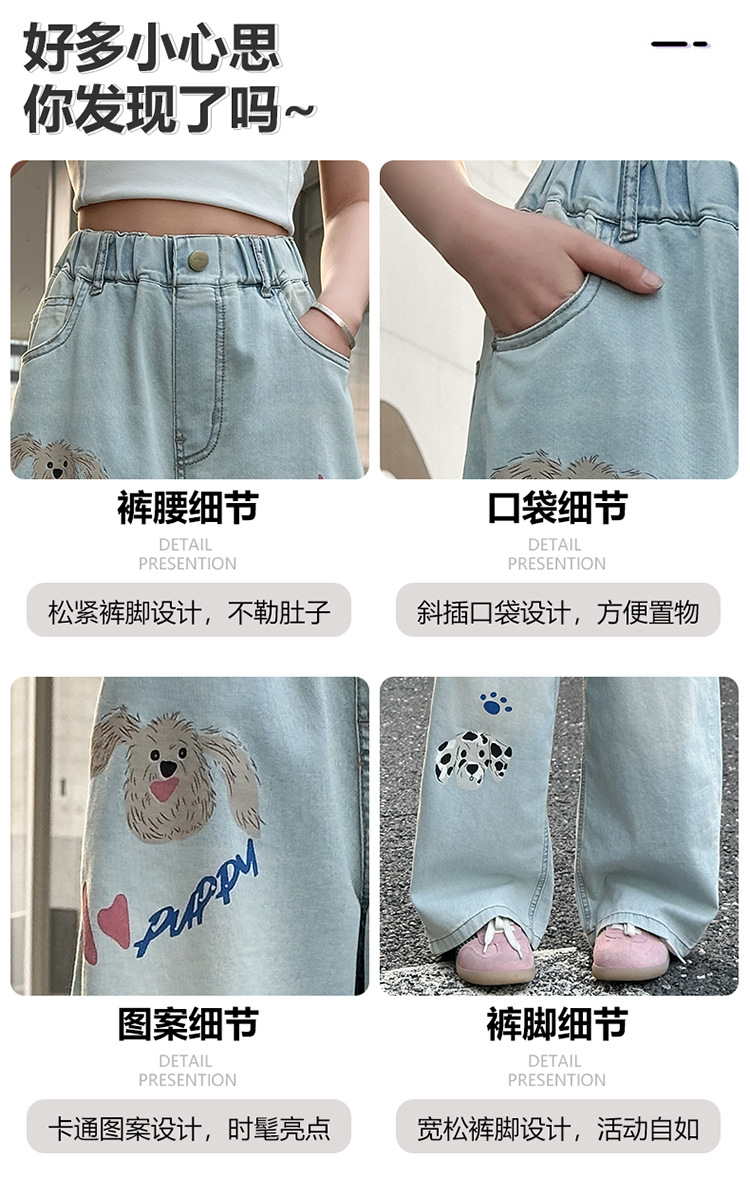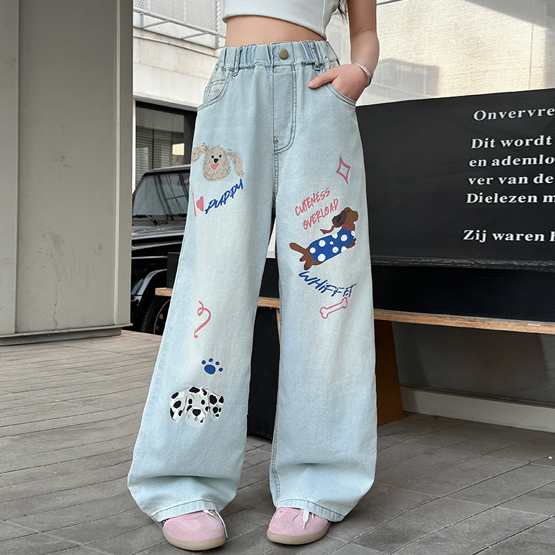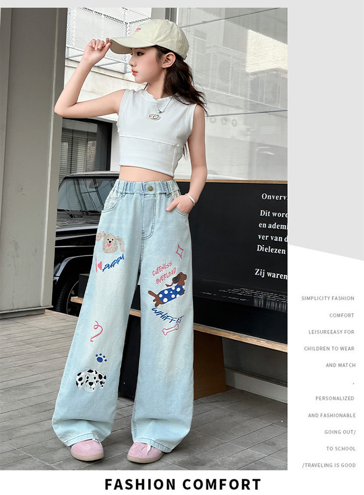 여아 얇은 청바지 2025 새로운 스타일 어린 소녀의 세련된 루즈한 와이드 팬츠 중대형 아동용 프린트 스트레이트 팬츠 트렌디스토어 가기