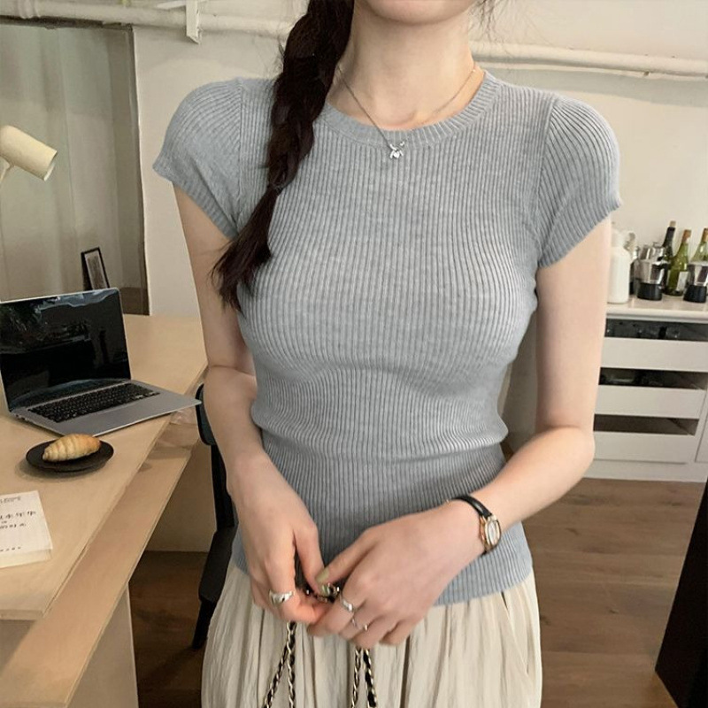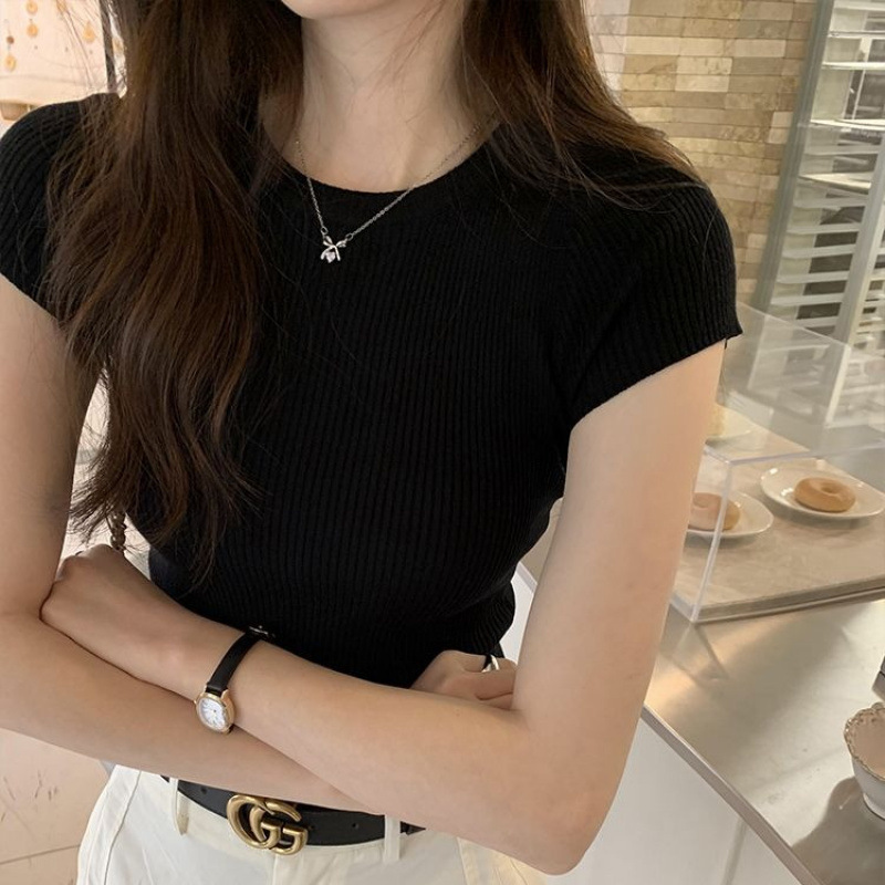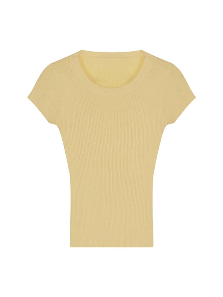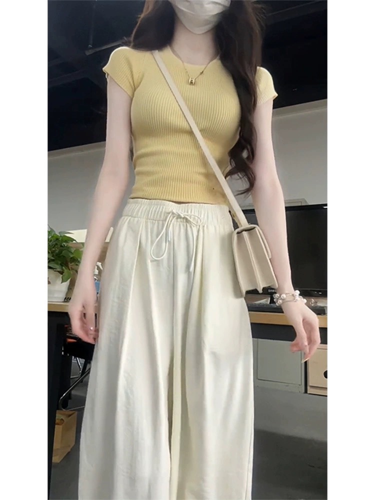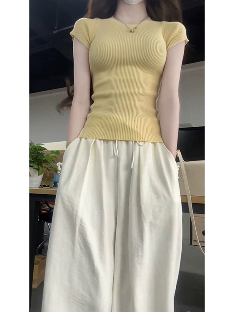 도파민 노란색 니트 아이스 실크 반팔 티셔츠 여성의 새로운 프랑스 스타일 아름다운 꽉 허리 작은 셔츠 중단 된 허리 탑 여름