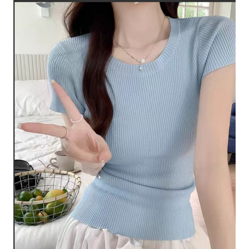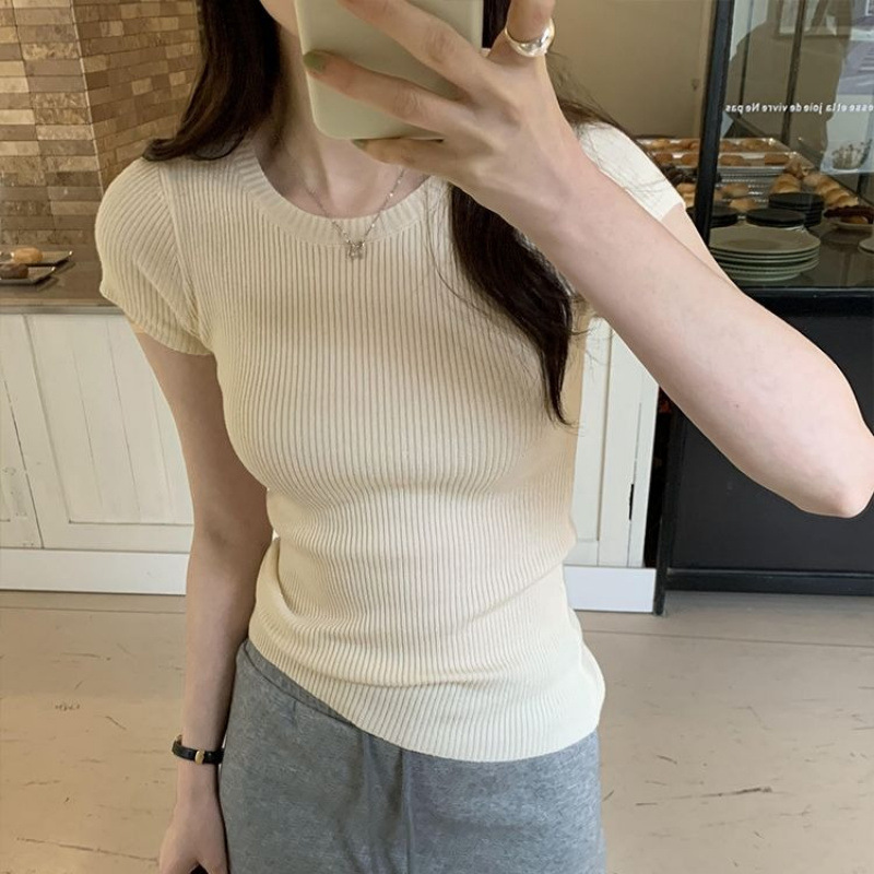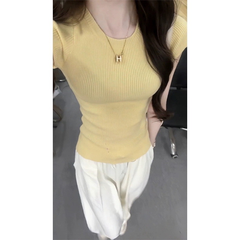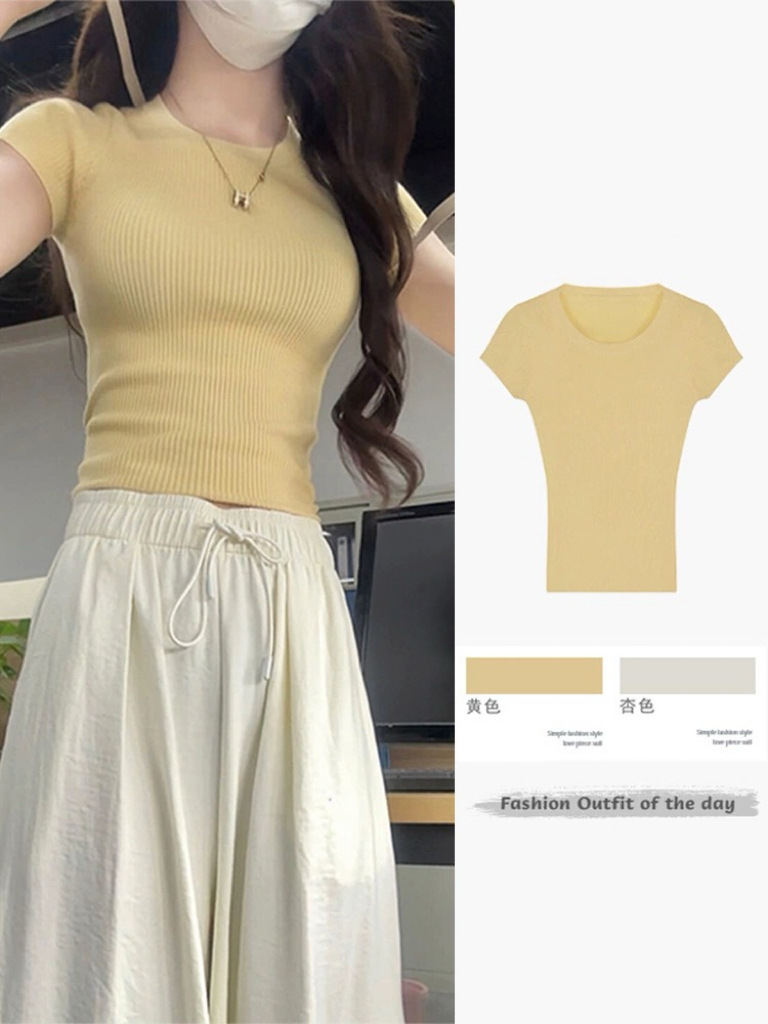 도파민 노란색 니트 아이스 실크 반팔 티셔츠 여성의 새로운 프랑스 스타일 아름다운 꽉 허리 작은 셔츠 중단 된 허리 탑 여름스토어 가기