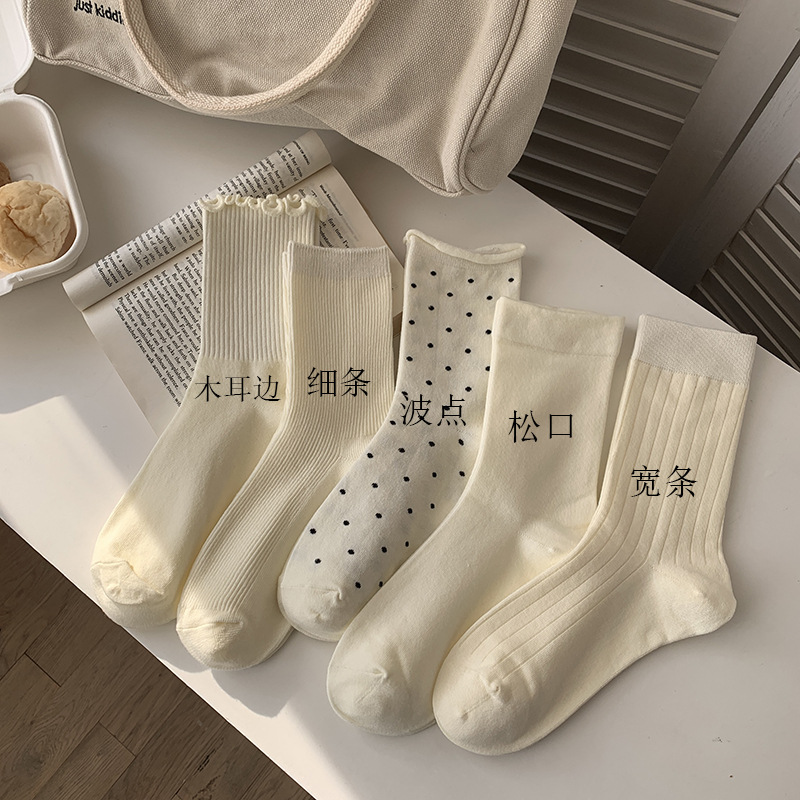 밀키 화이트 신장면 종아리 양말 봄 여름 다용도 단색 양말 긴 양말 한국식 폴카 도트 귀 양말