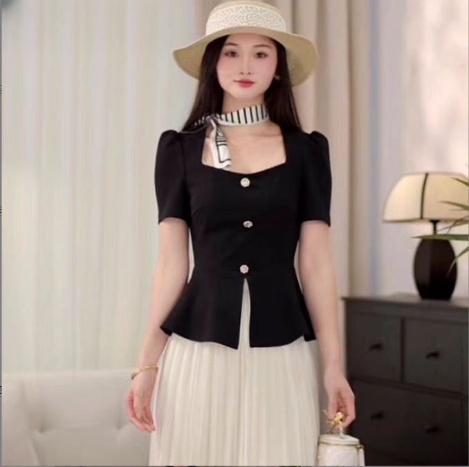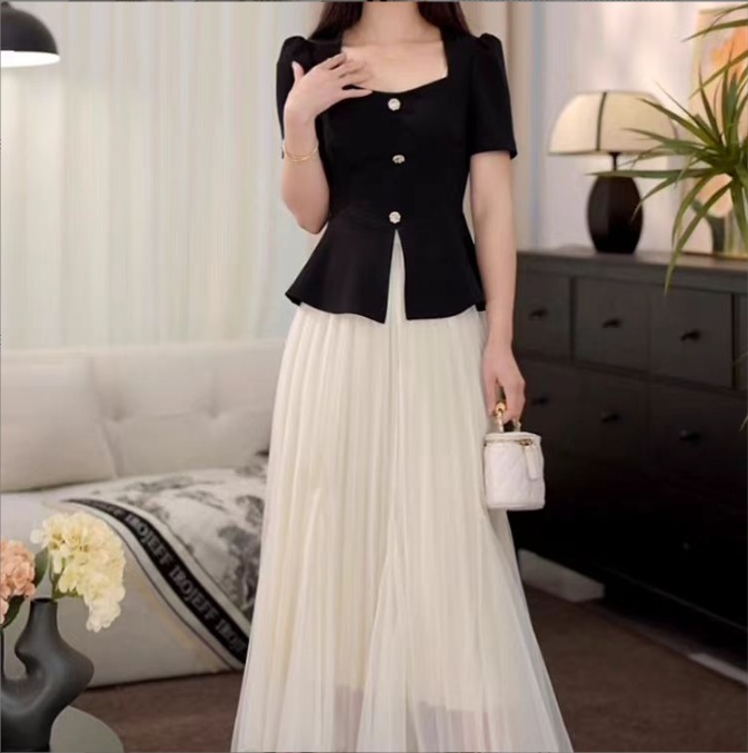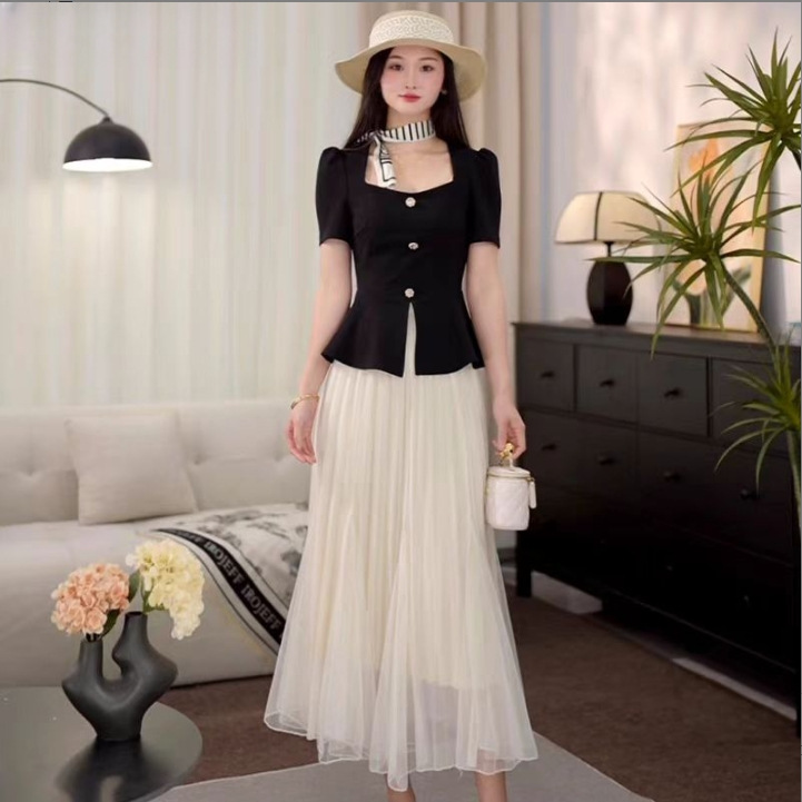 2025 년 여름 플러스 사이즈 사각 칼라 세트 스커트 여성 기질 고급 프렌치 메쉬 오버 스커트 세트 착용합니다.스토어 가기