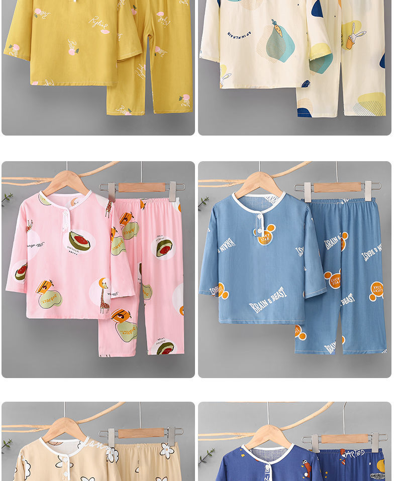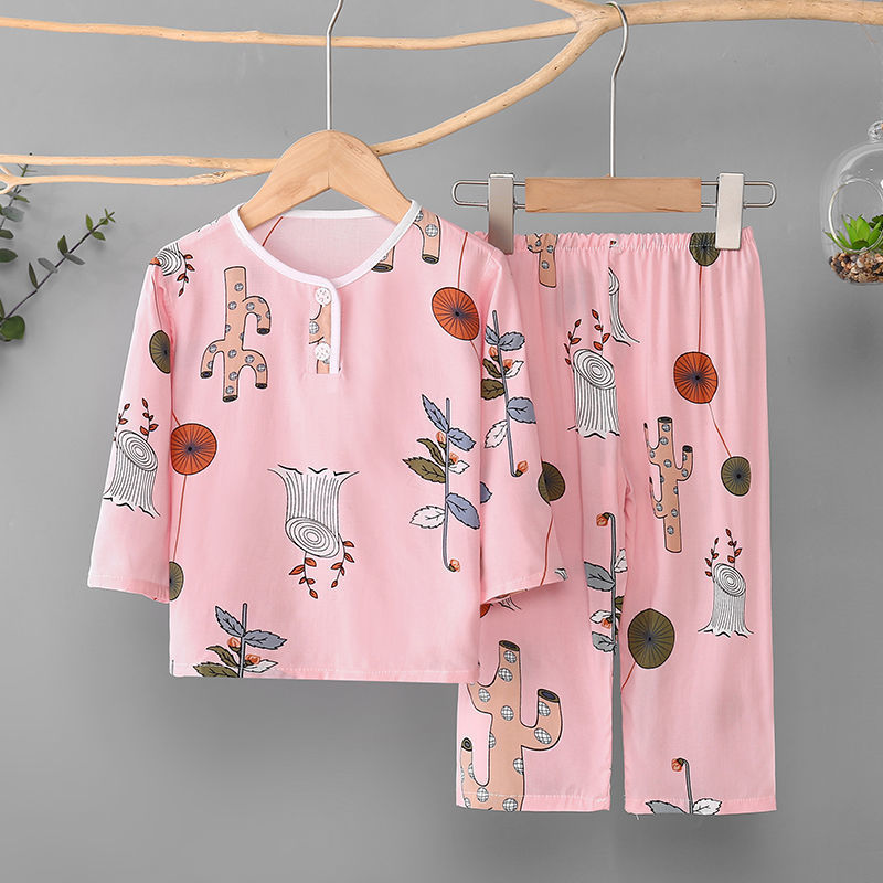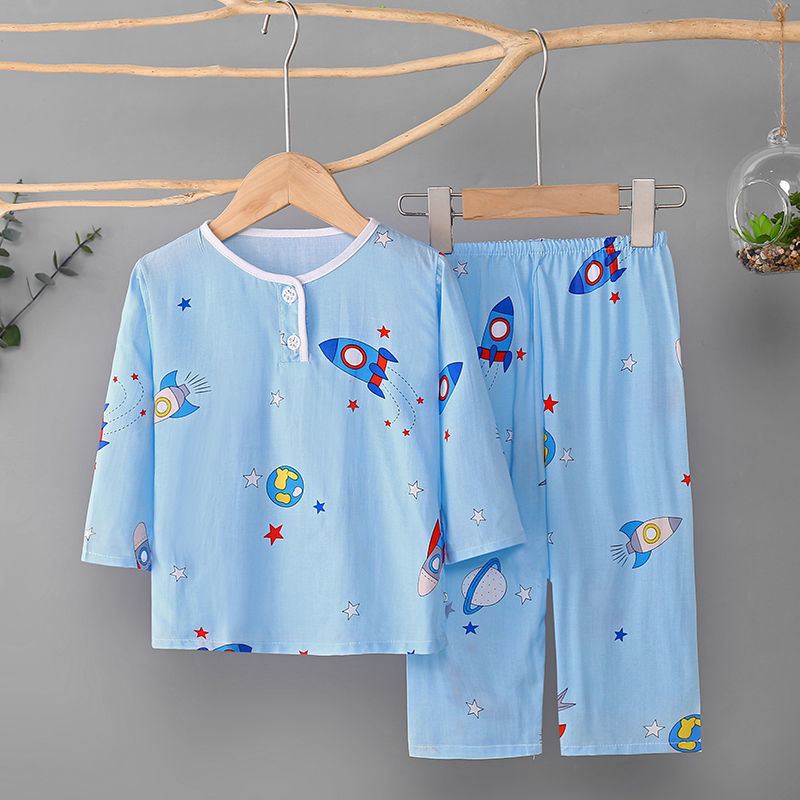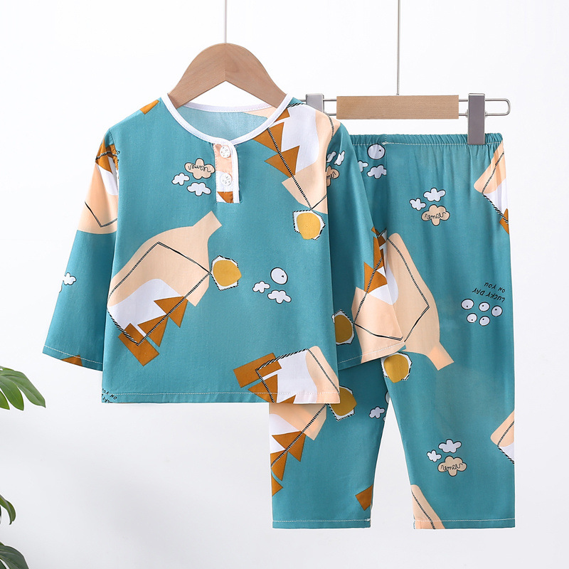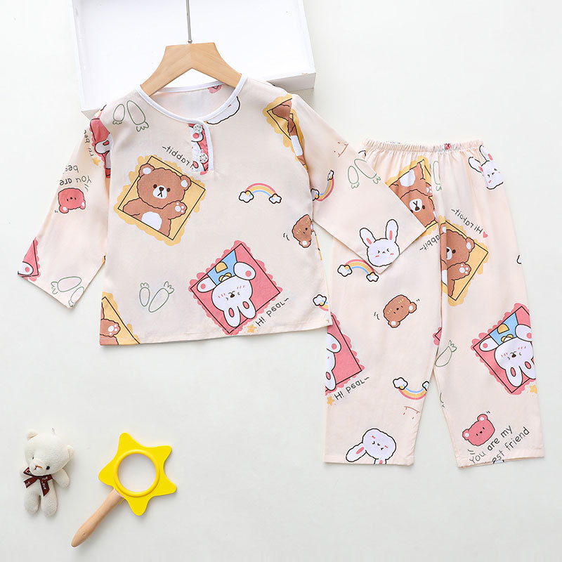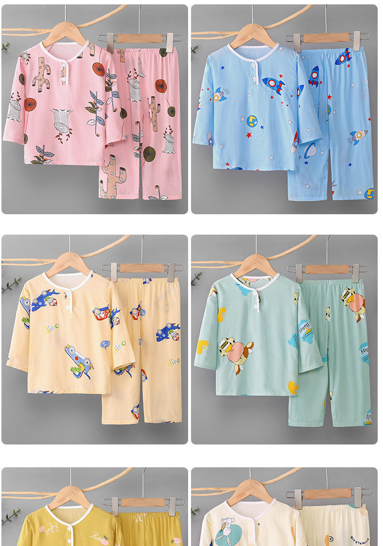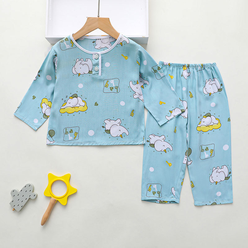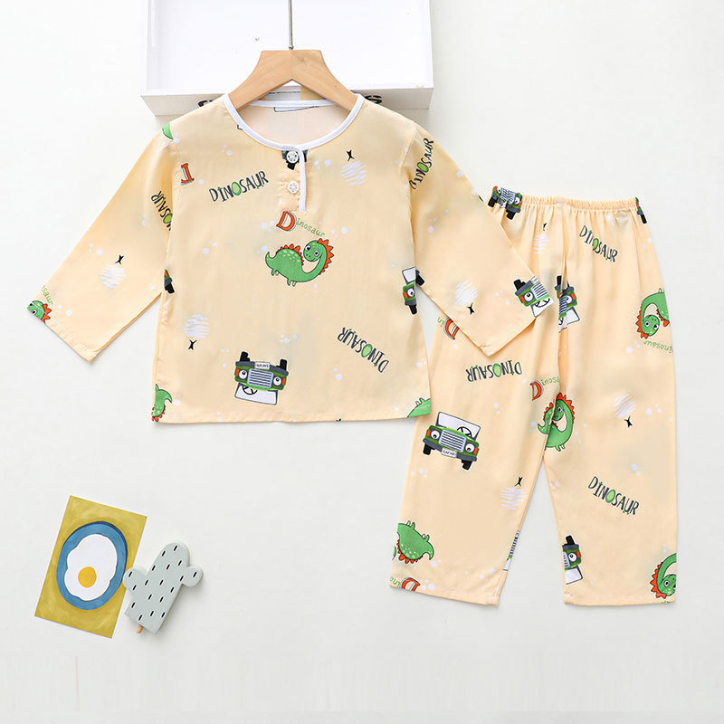 소년과 소녀를위한 여름 어린이 면화 실크 잠옷 아기 면화 실크 긴팔 여름 얇은 에어컨 옷 가정 의류 세트스토어 가기