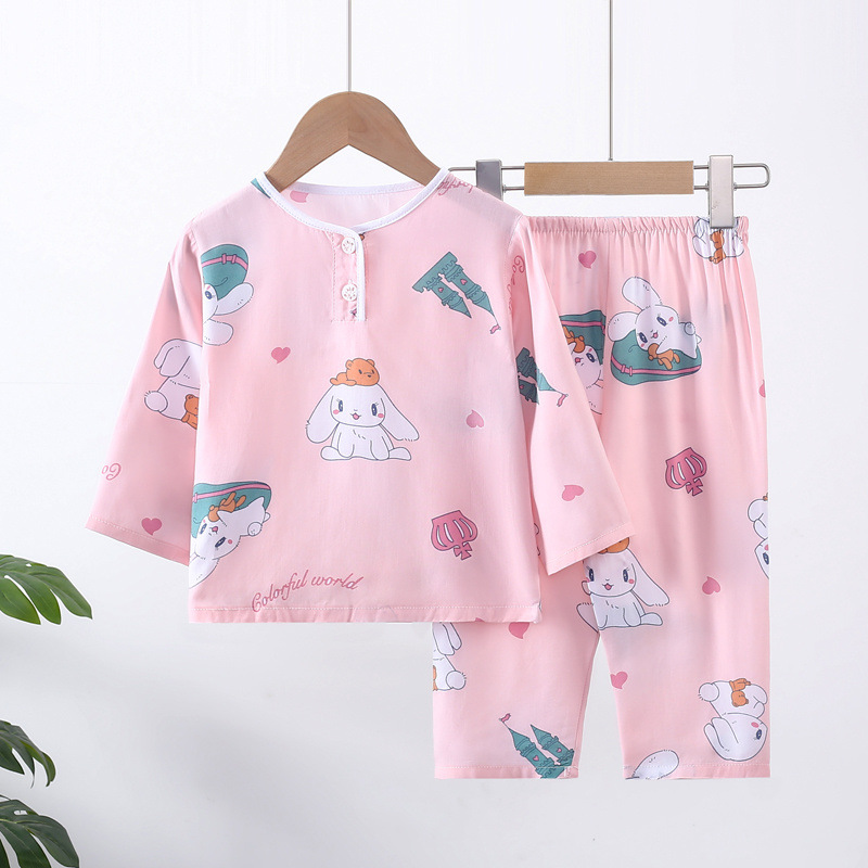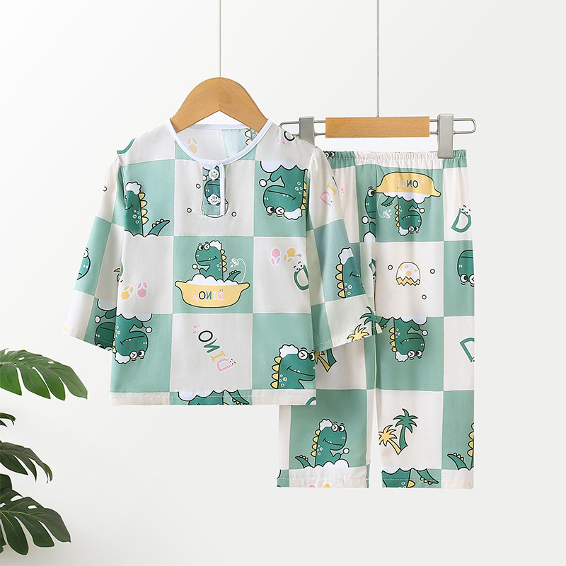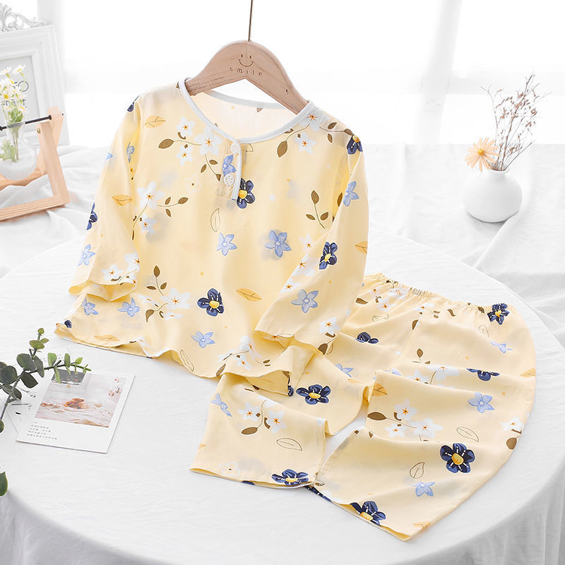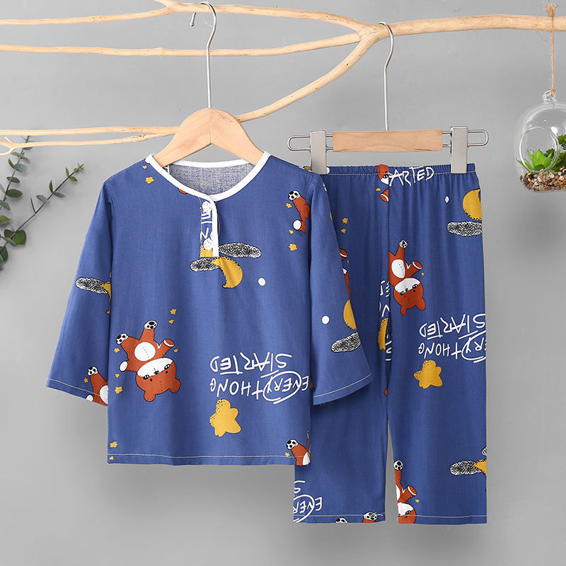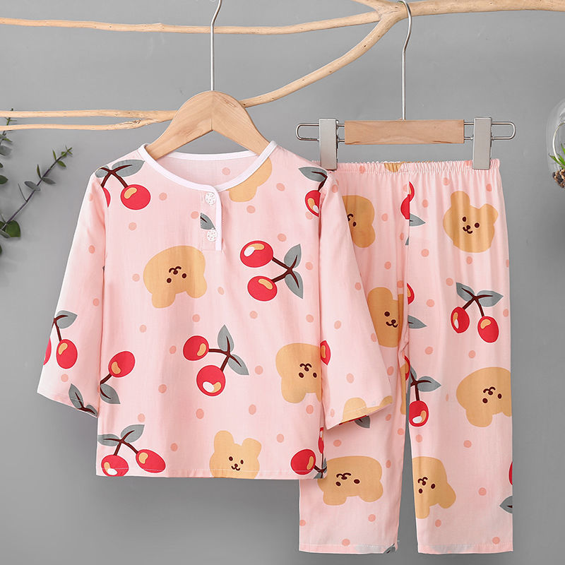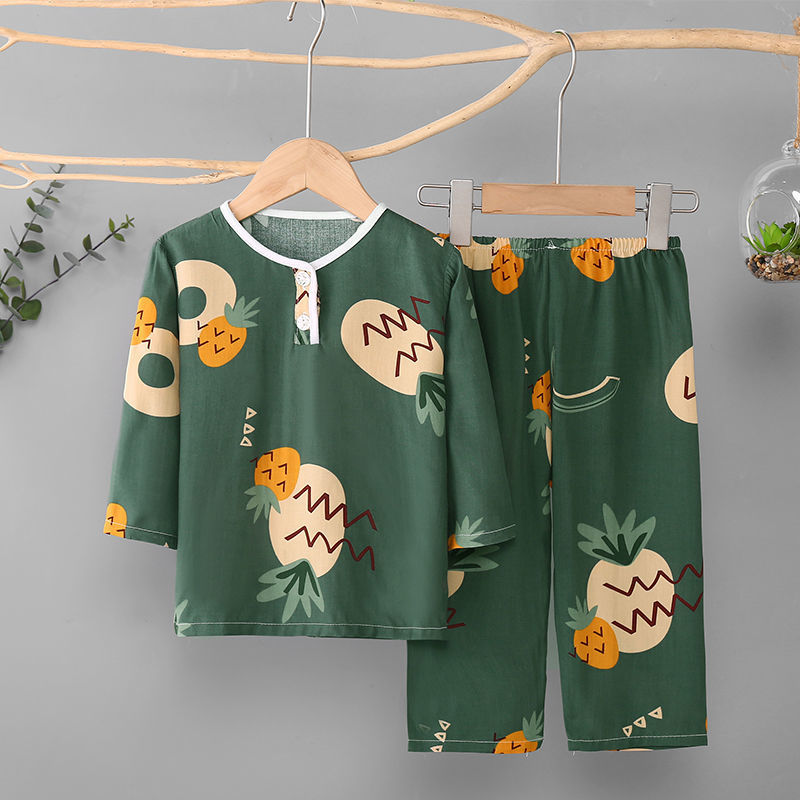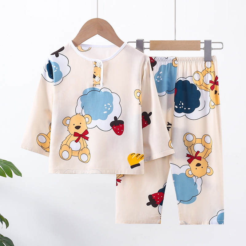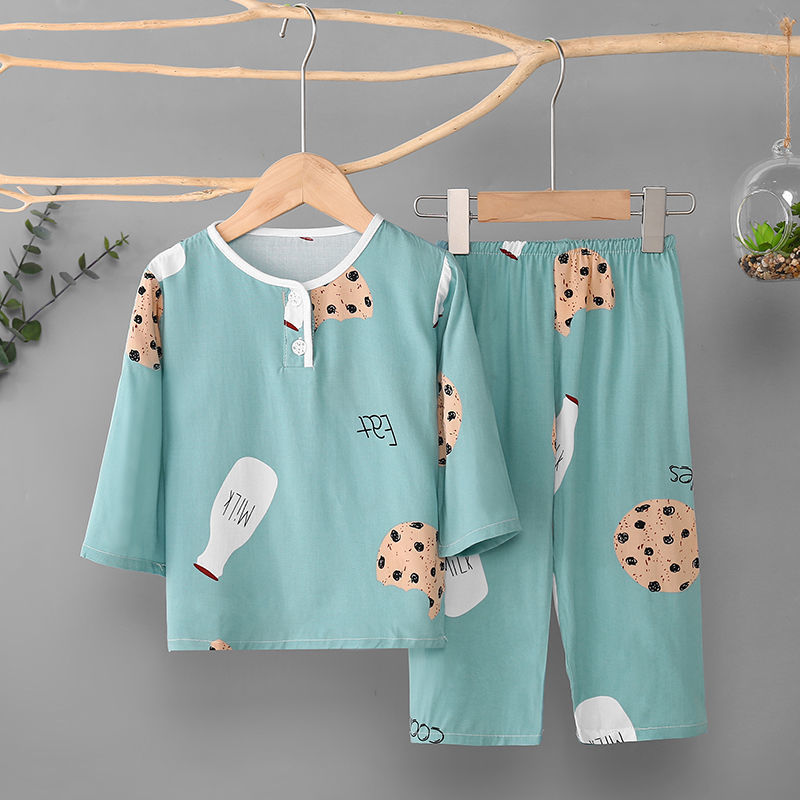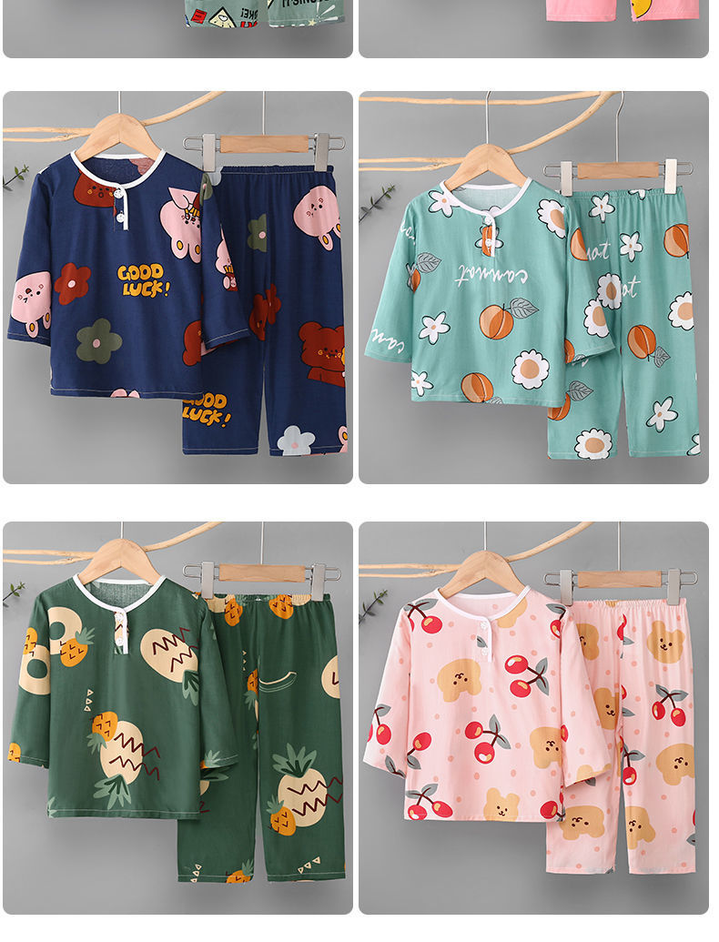 소년과 소녀를위한 여름 어린이 면화 실크 잠옷 아기 면화 실크 긴팔 여름 얇은 에어컨 옷 가정 의류 세트스토어 가기