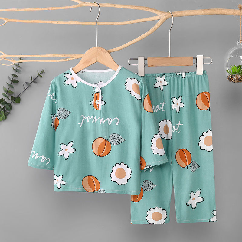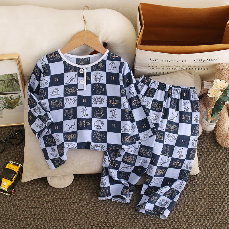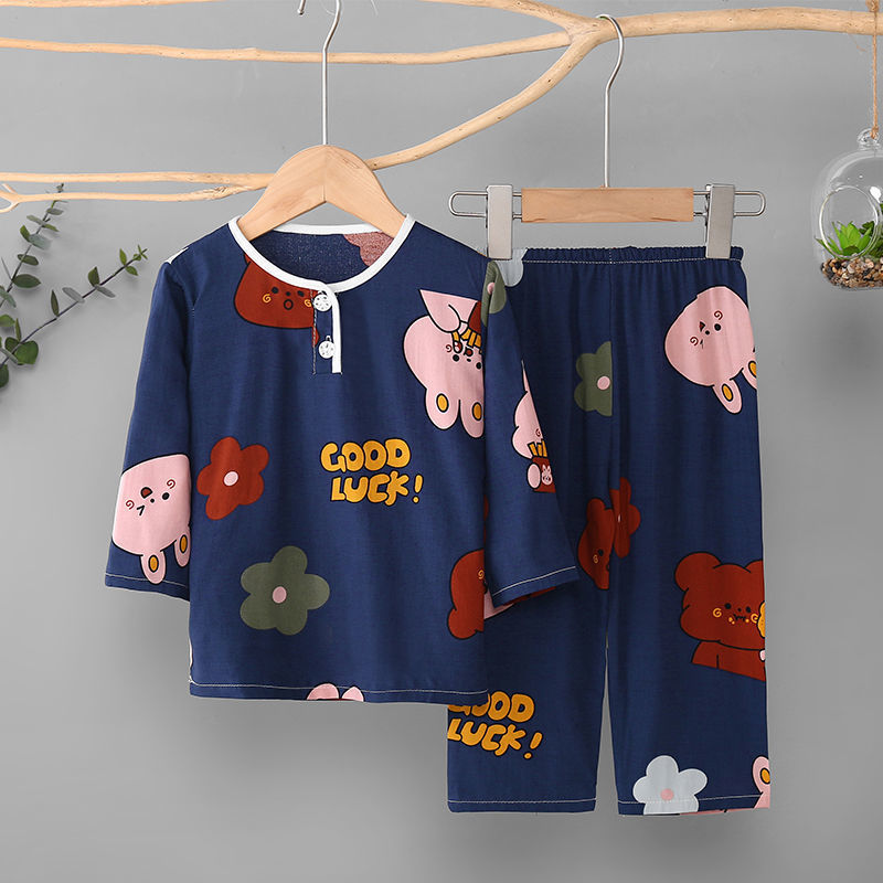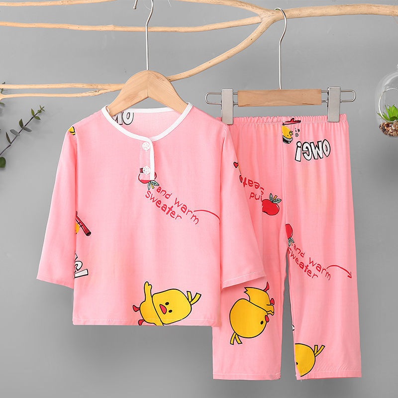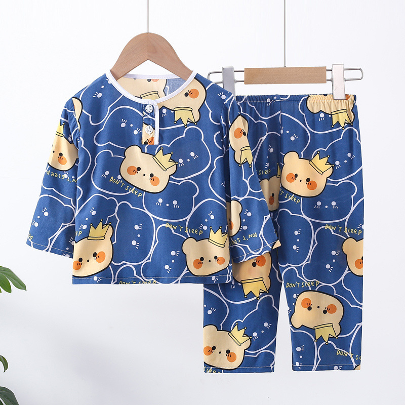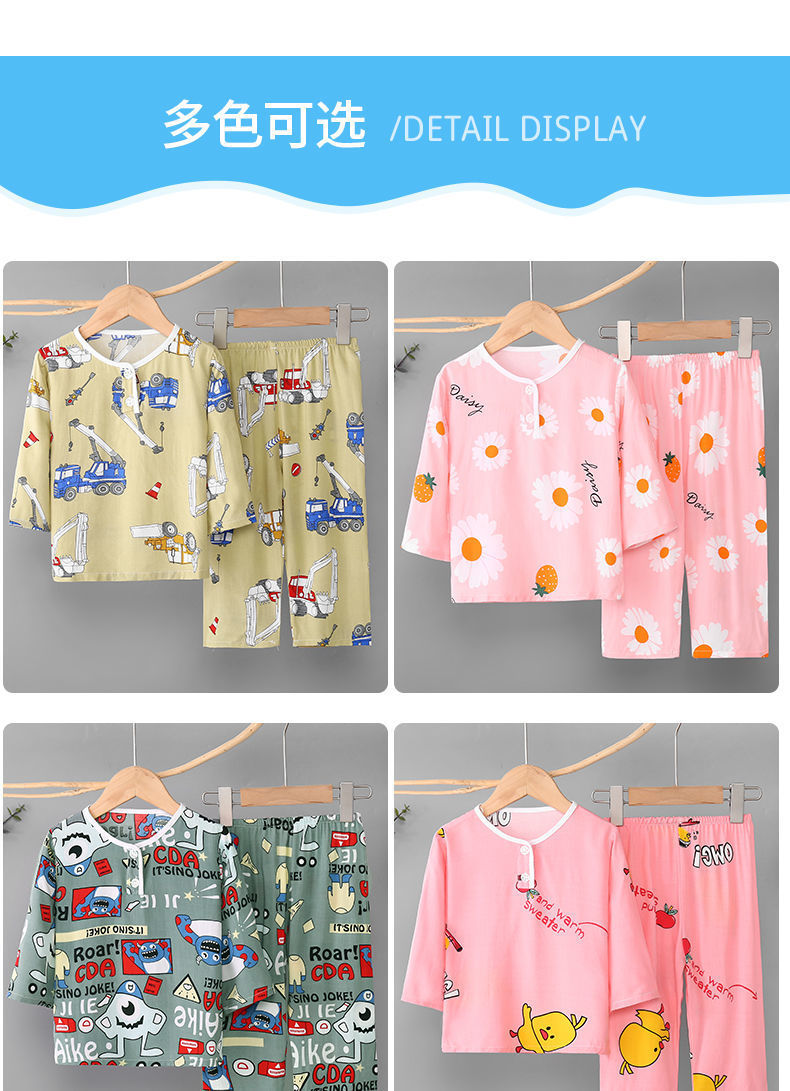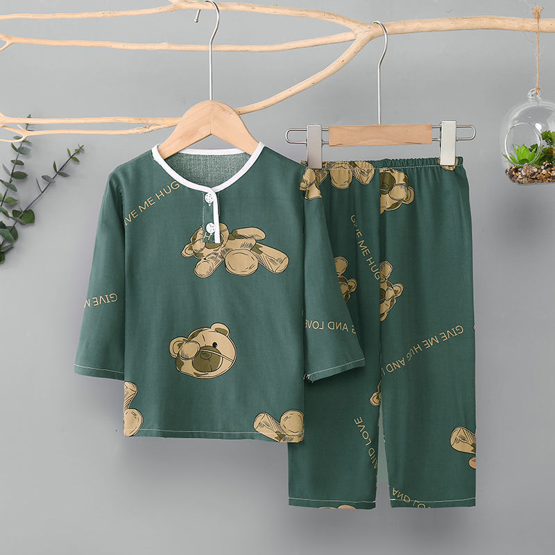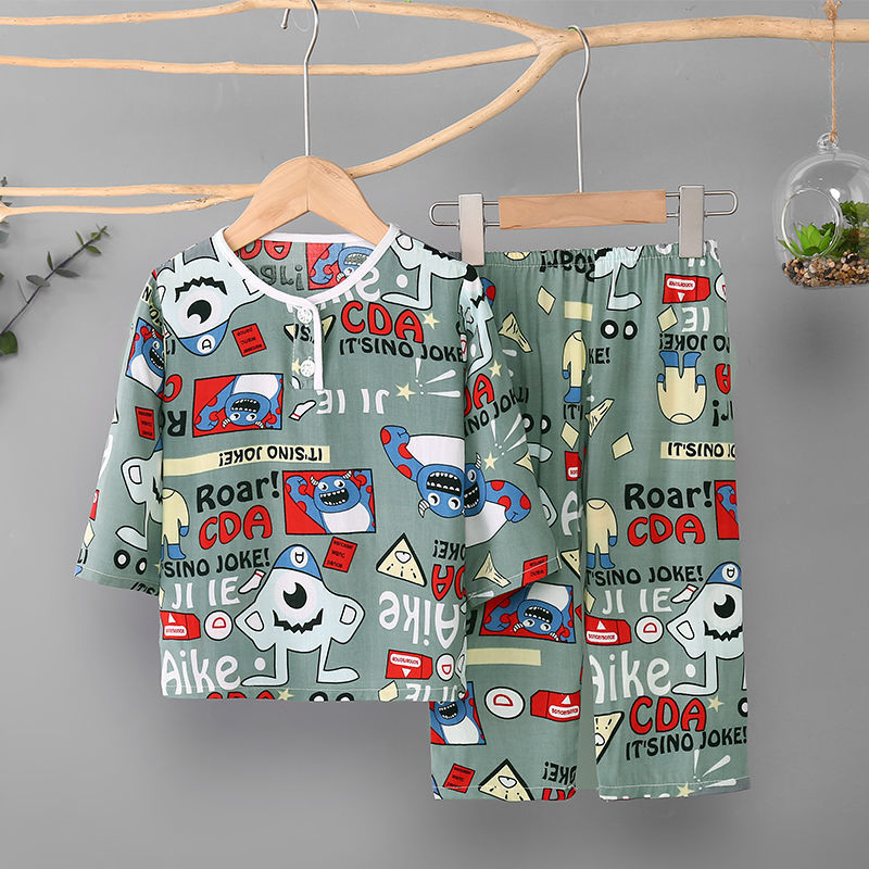 소년과 소녀를위한 여름 어린이 면화 실크 잠옷 아기 면화 실크 긴팔 여름 얇은 에어컨 옷 가정 의류 세트스토어 가기
