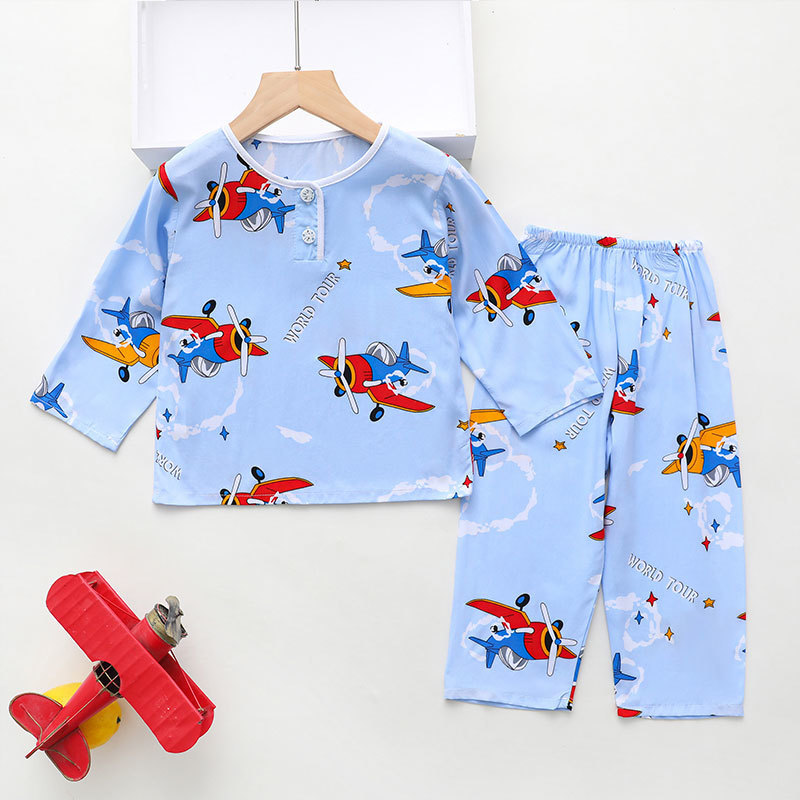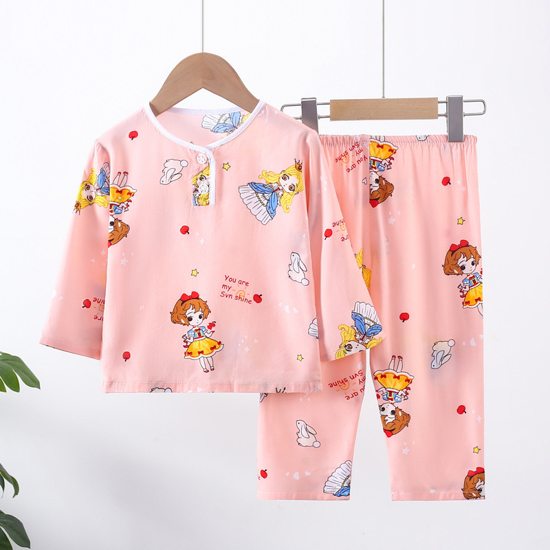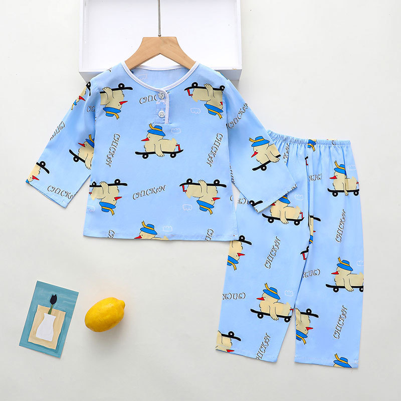 소년과 소녀를위한 여름 어린이 면화 실크 잠옷 아기 면화 실크 긴팔 여름 얇은 에어컨 옷 가정 의류 세트