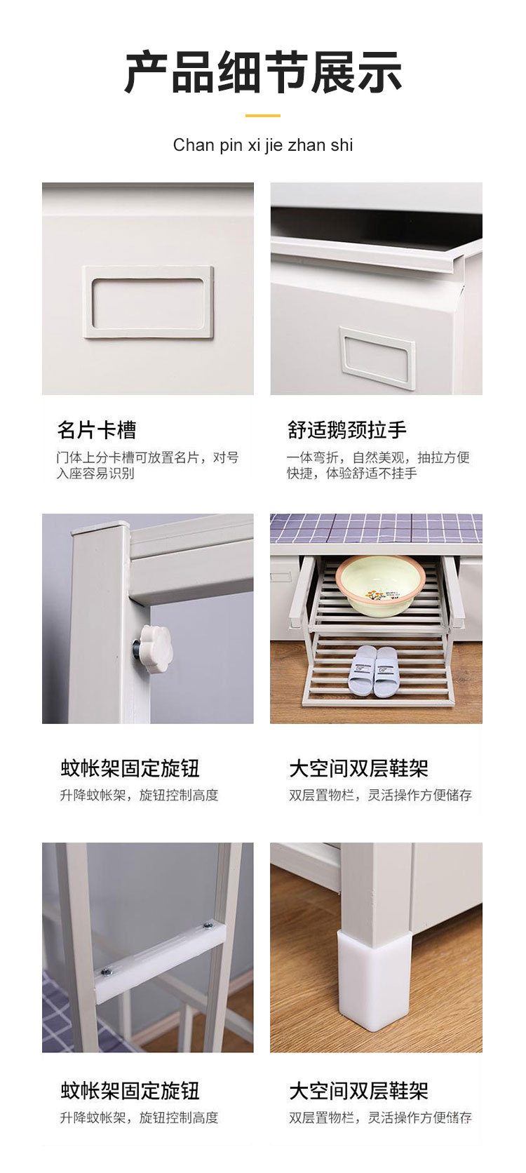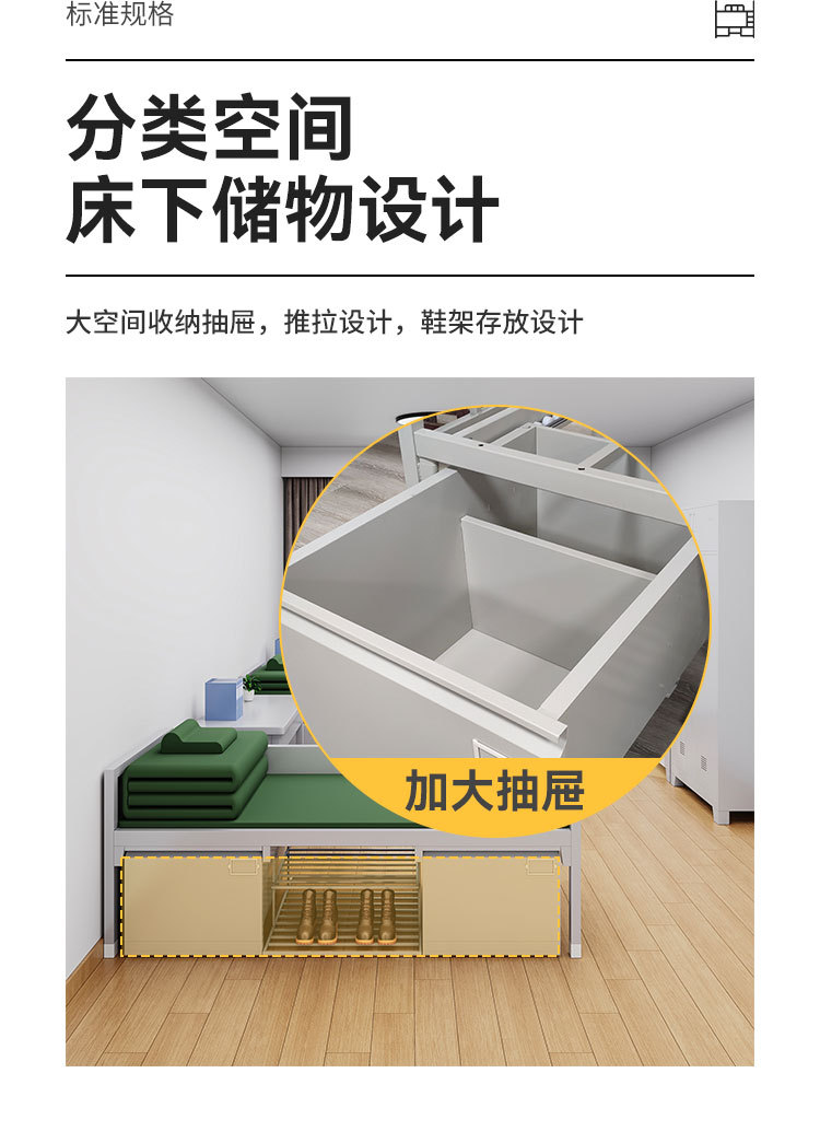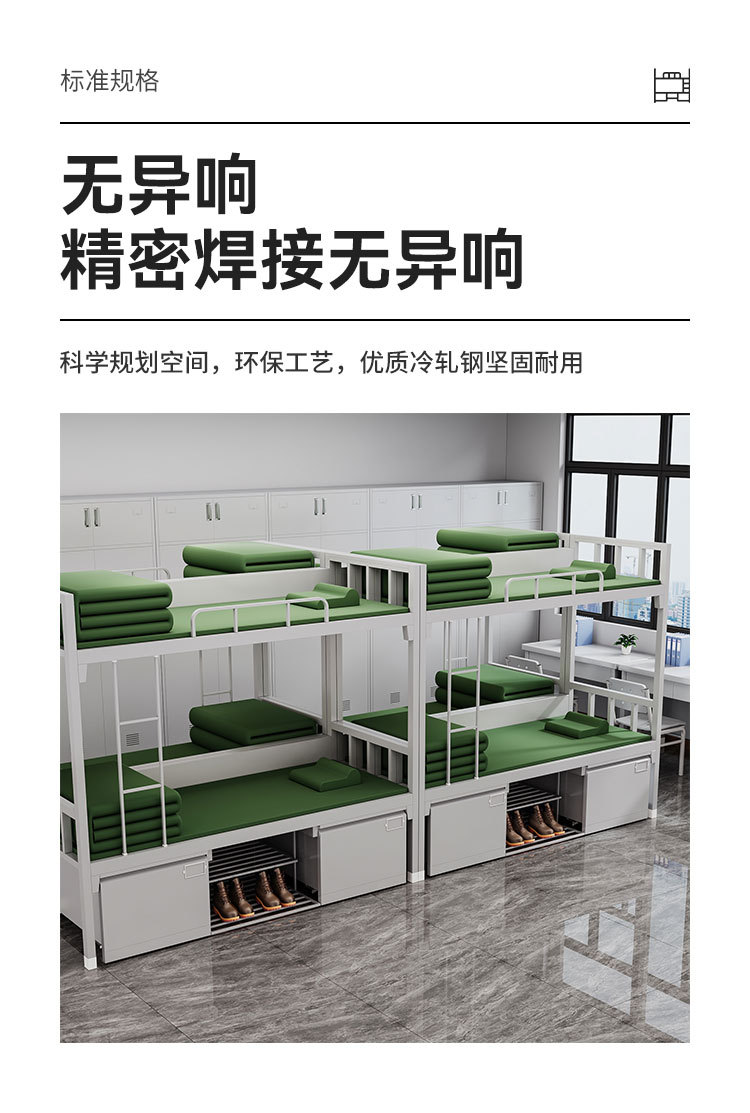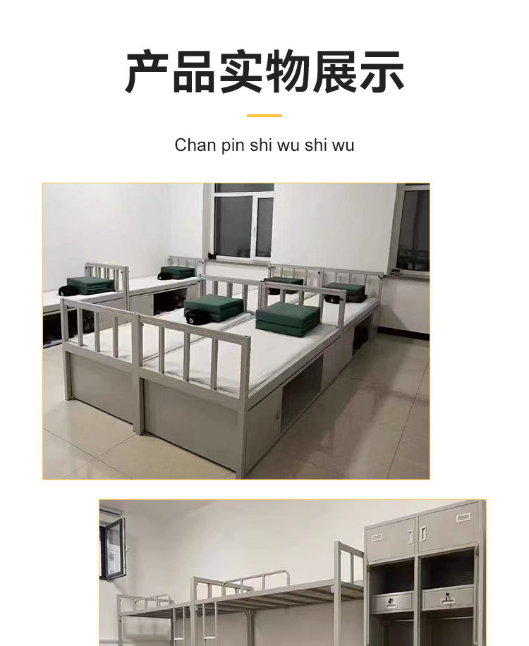 표준 캠프 장비 이층 침대 유닛 이층 철제 프레임 침대 직원 기숙사 침대 아래 테이블 내부 캐비닛 학습 테이블스토어 가기