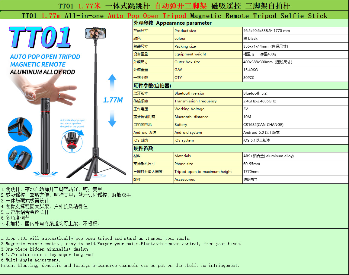 一体式落地三脚架高1.77米 收后约34CM