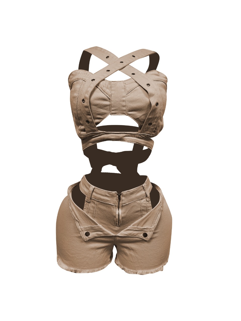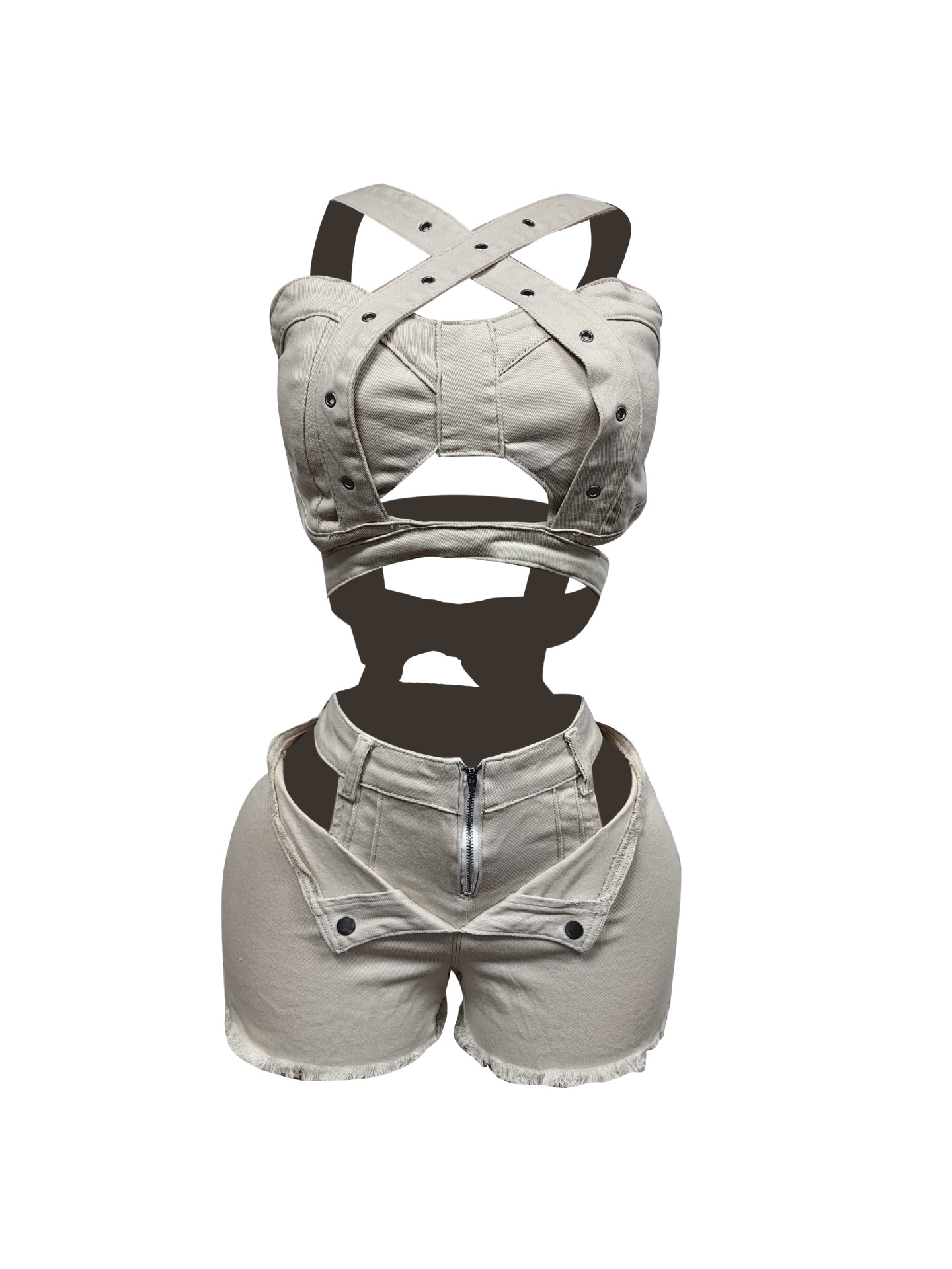 새로운 데님 조끼 세트 MZ88637 유럽 및 미국 재고 아마존 스트랩리스 스트랩 탄성 반바지 세트