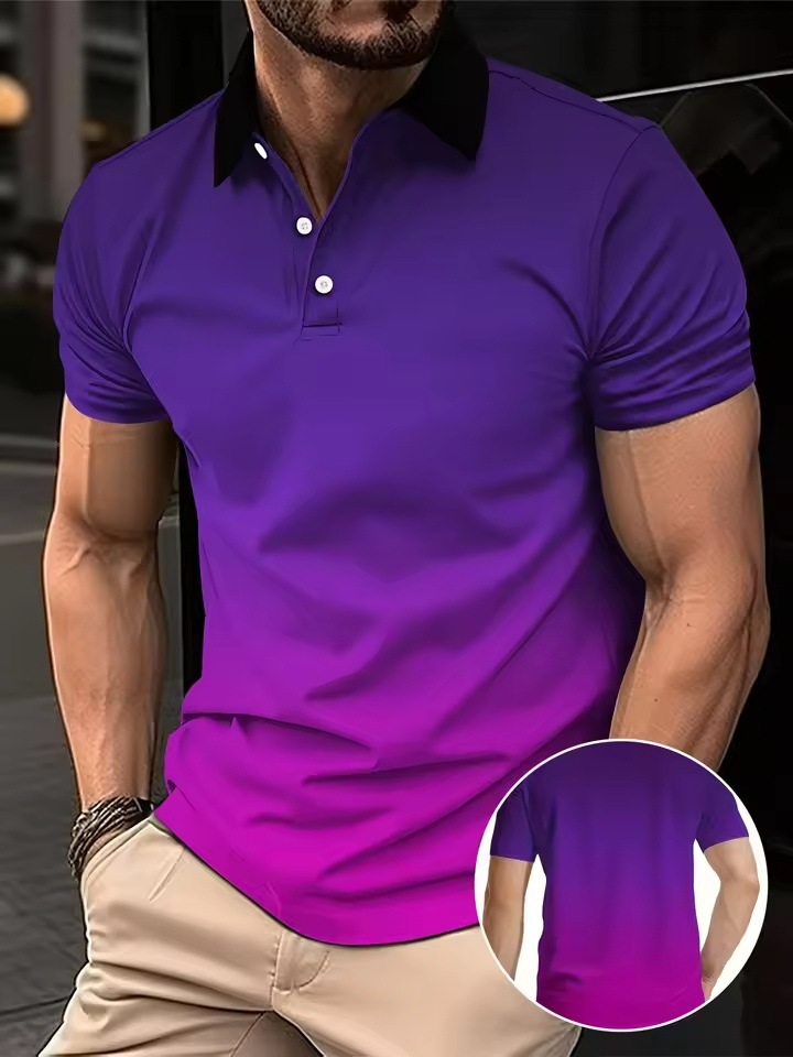 2025 남성용 3D 패션 그라디언트 컬러 폴로 셔츠 옷깃 골프 셔츠 반소매 프린트 버튼 의류