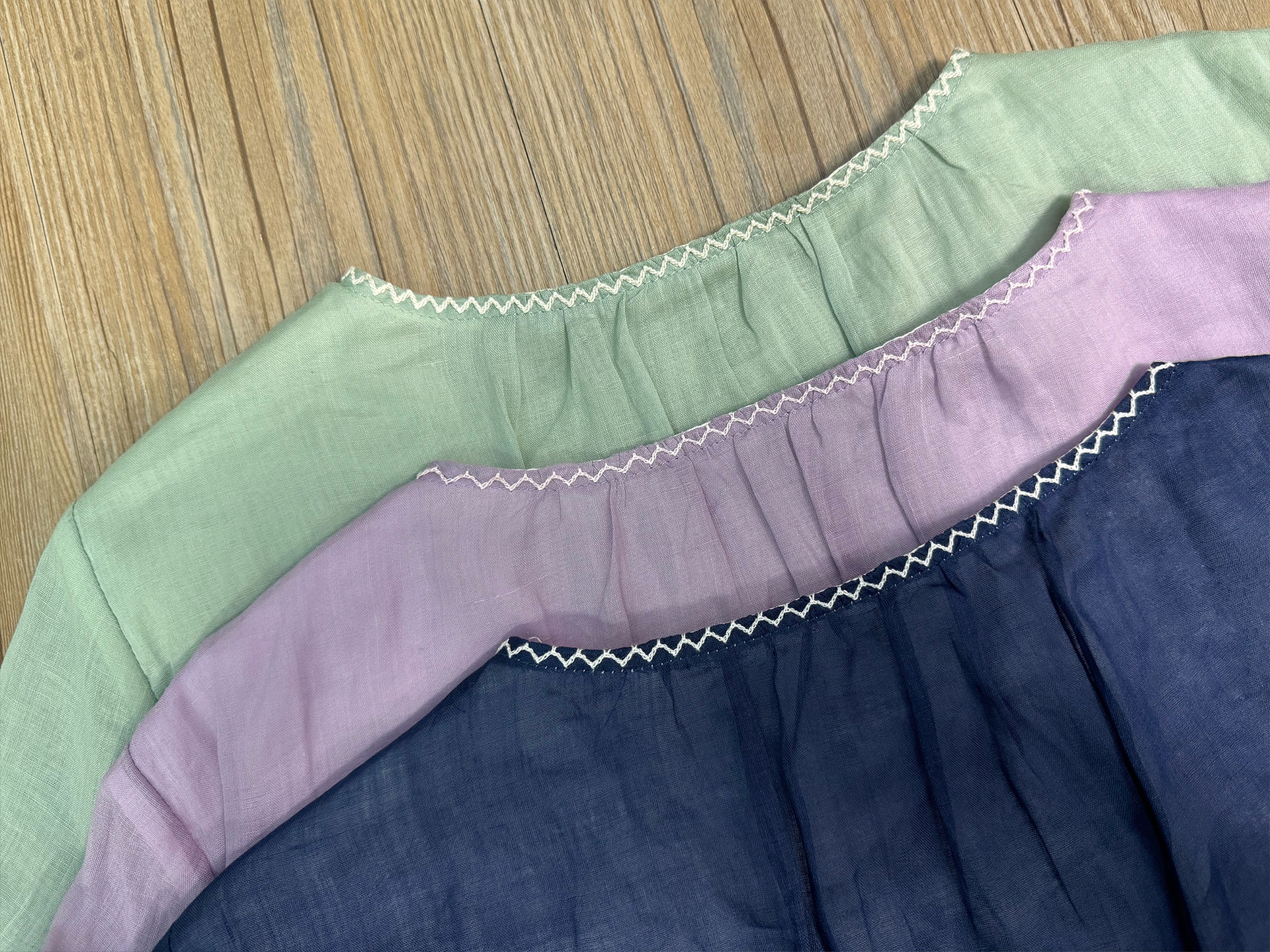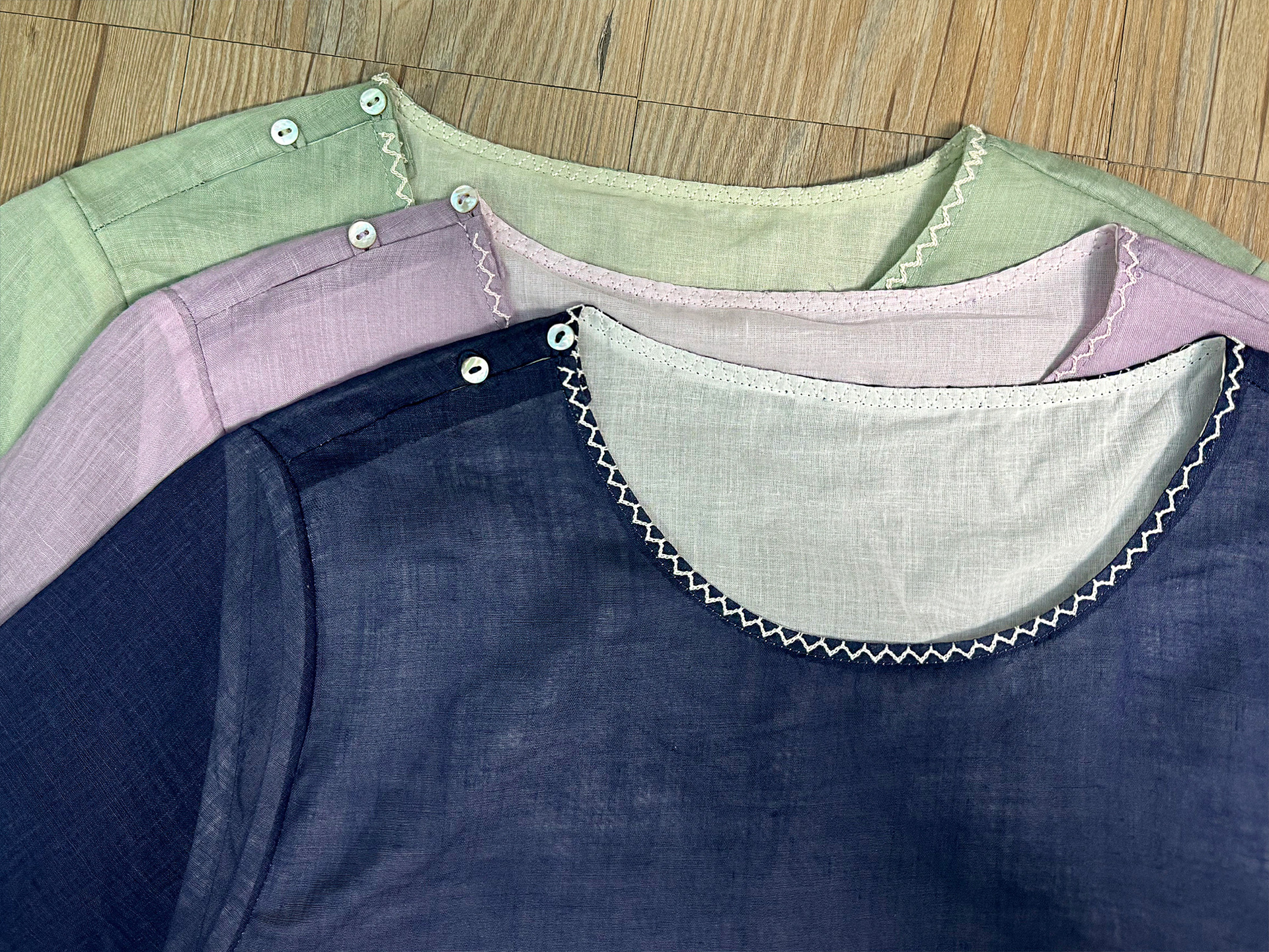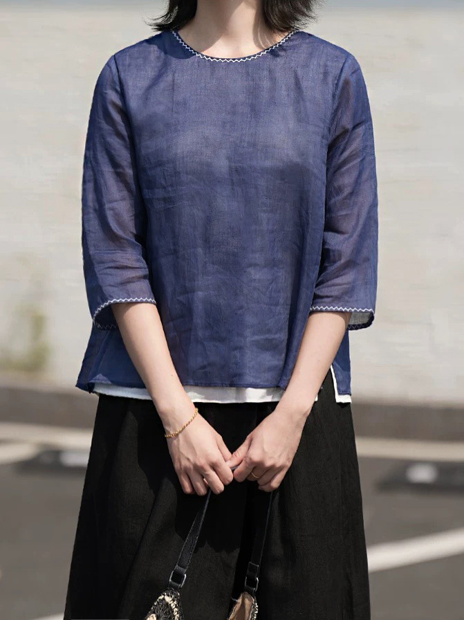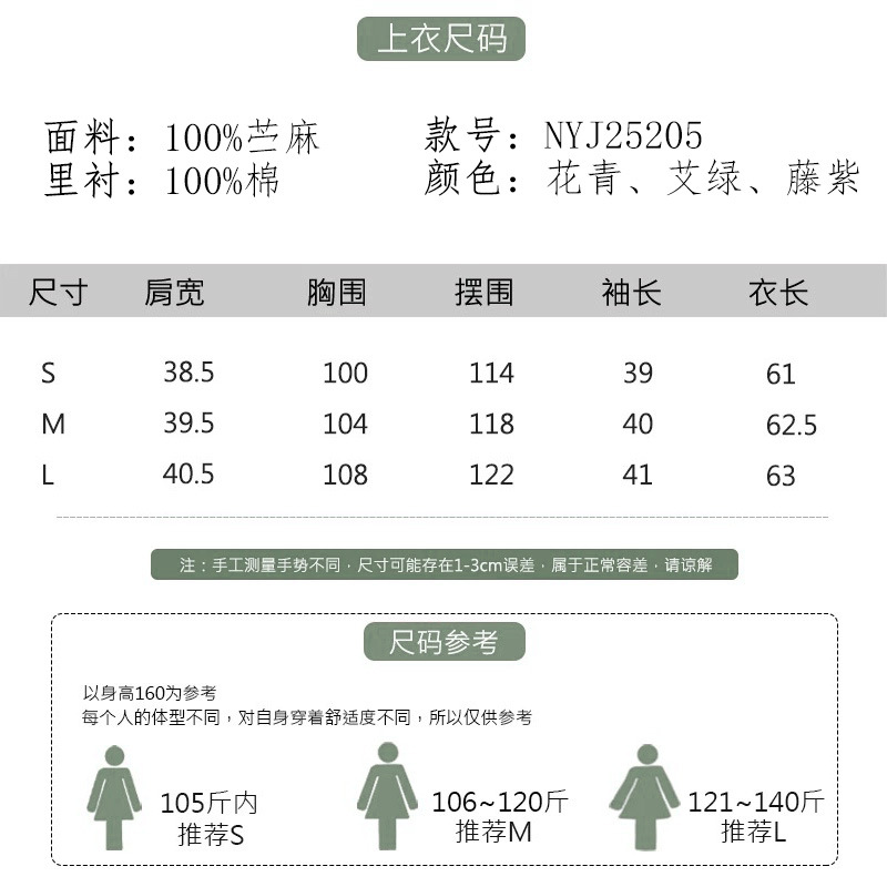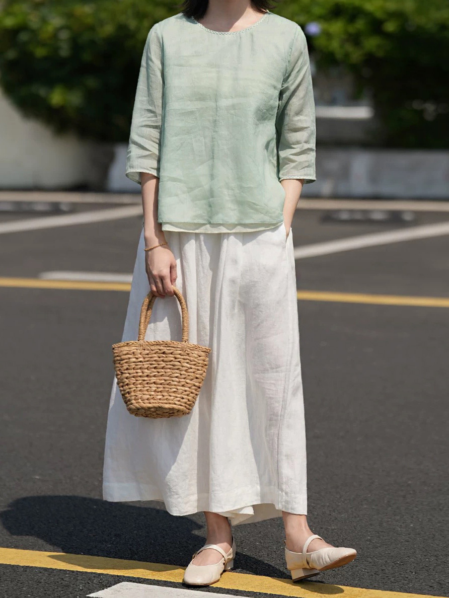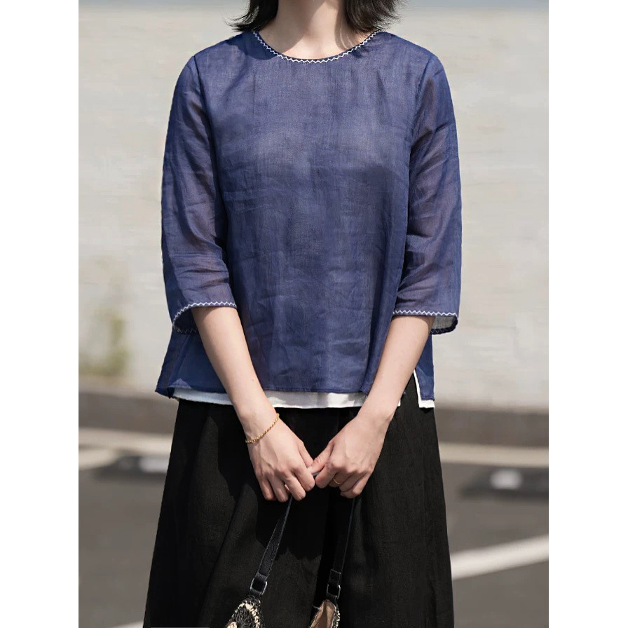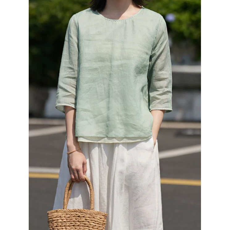 오리지널 하이 엔드 여성 신작 100 카운트 순수 모시 셔츠 가볍고 얇은 선명한 복고풍 루즈 라운드 넥 탑스토어 가기