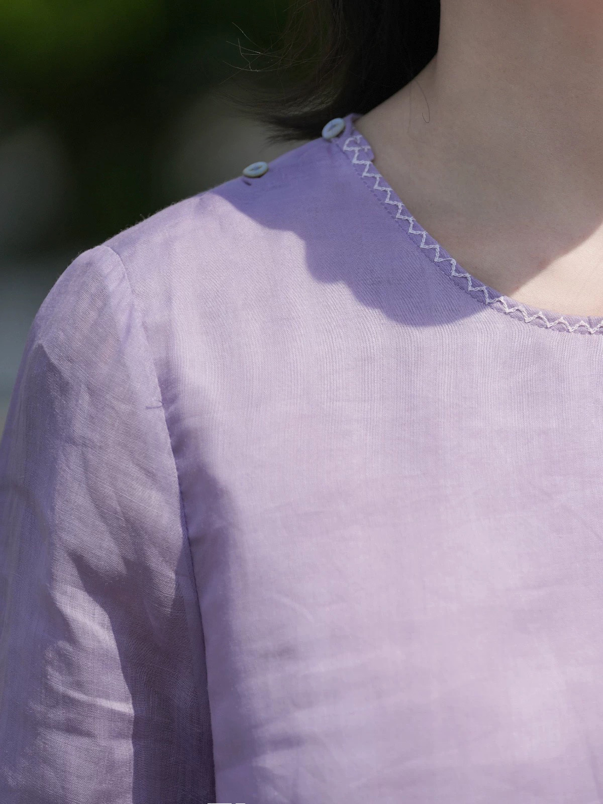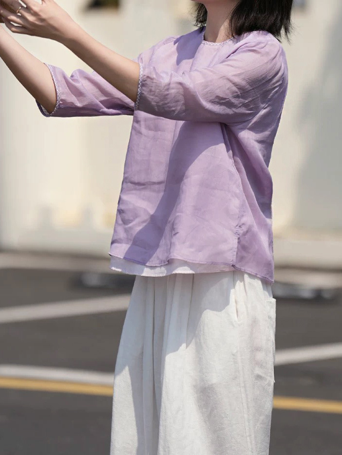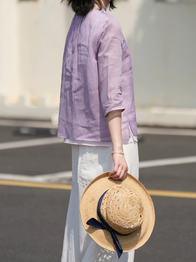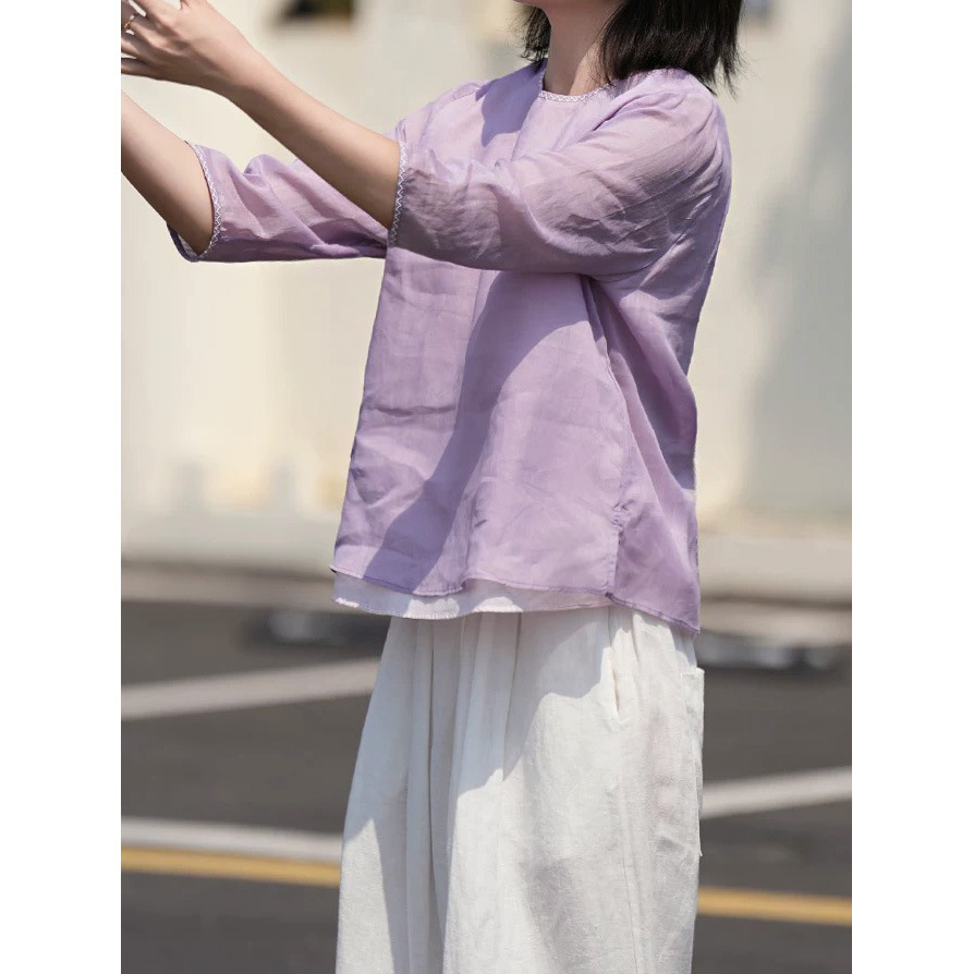 오리지널 하이 엔드 여성 신작 100 카운트 순수 모시 셔츠 가볍고 얇은 선명한 복고풍 루즈 라운드 넥 탑