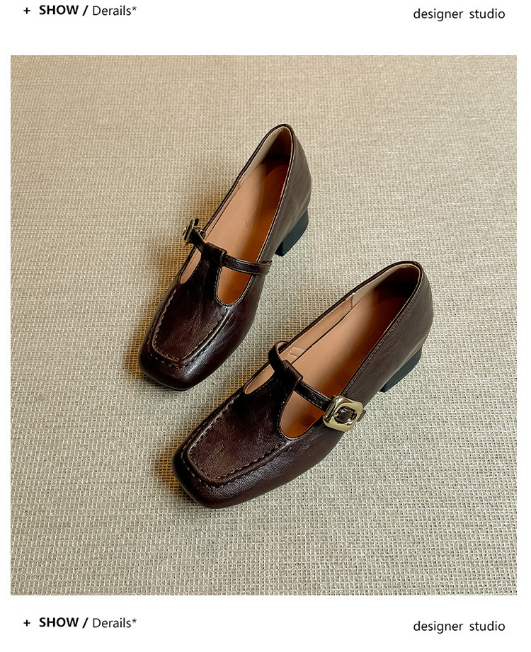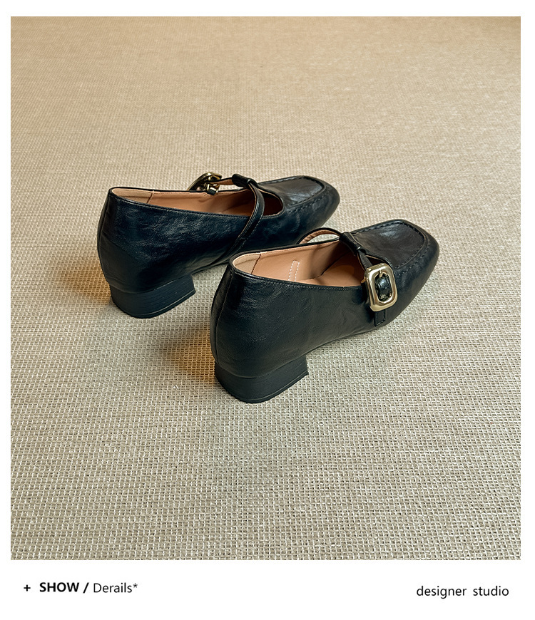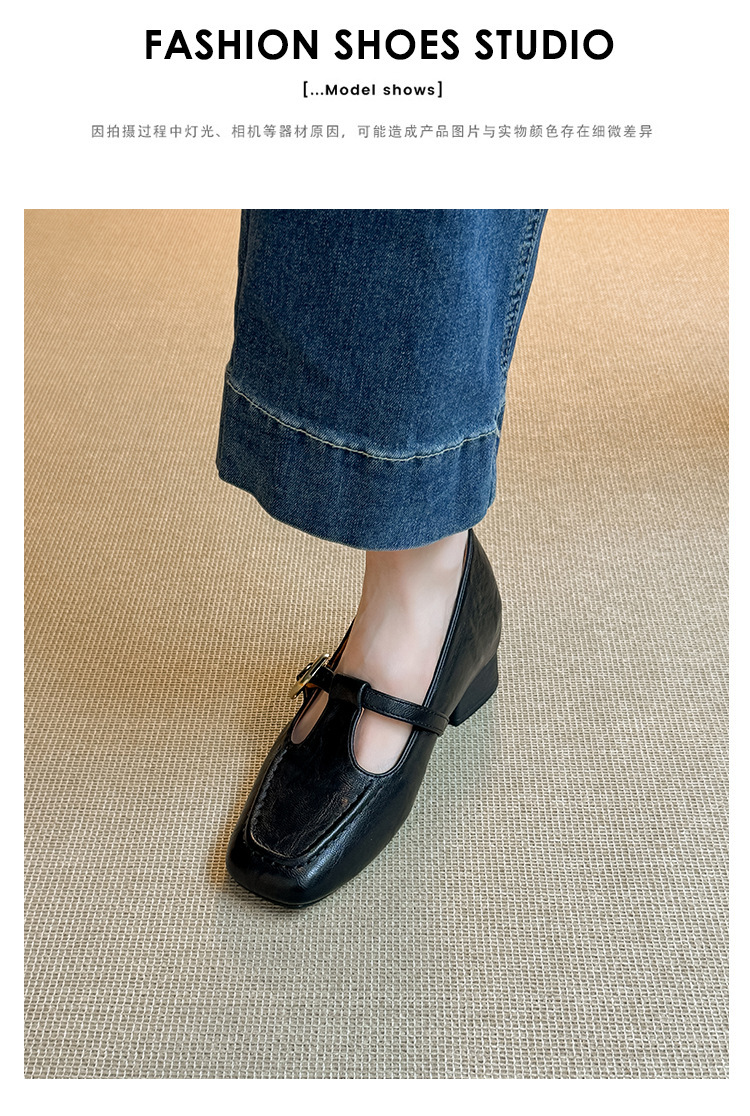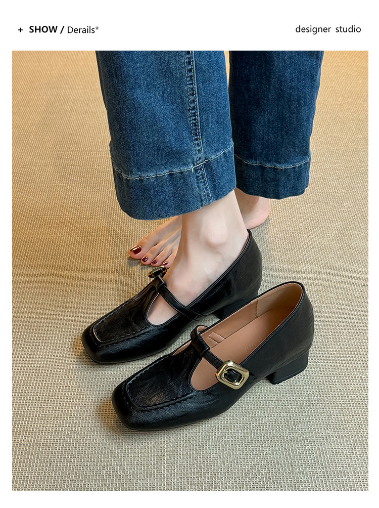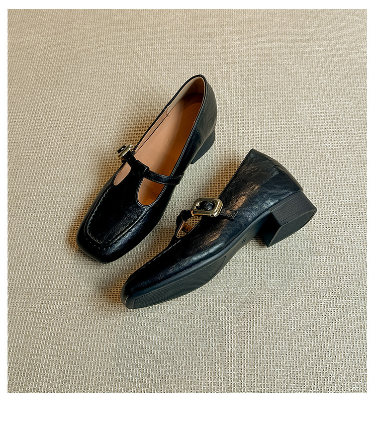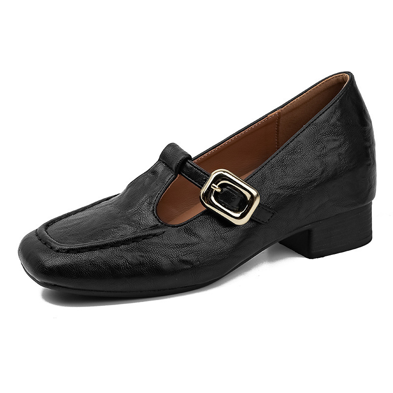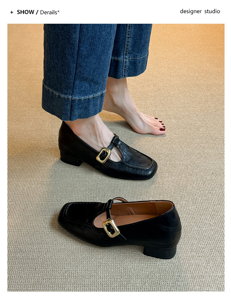 인테리어 높이 증가 광장 발가락 메리 제인 가죽 신발 Cowhide 한 자형 버클 벨트 프랑스 얕은 입 양각 부드러운 밑바닥 낮은 발 뒤꿈치 여성 신발