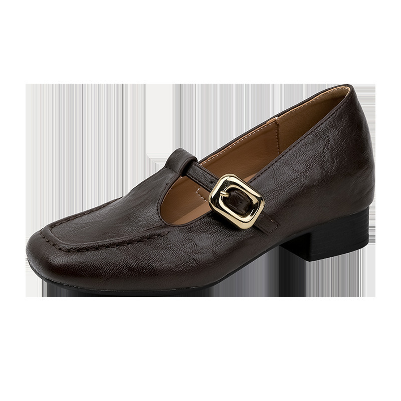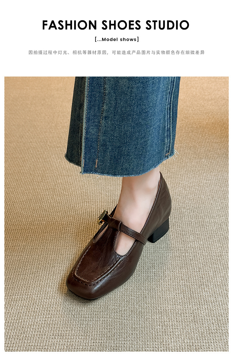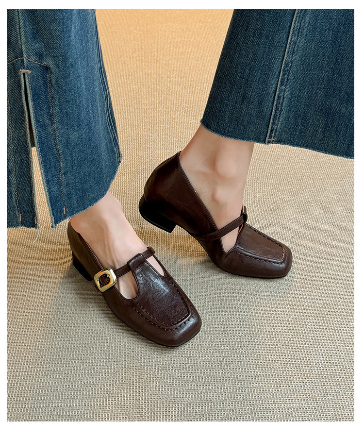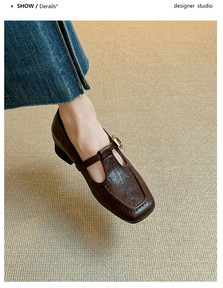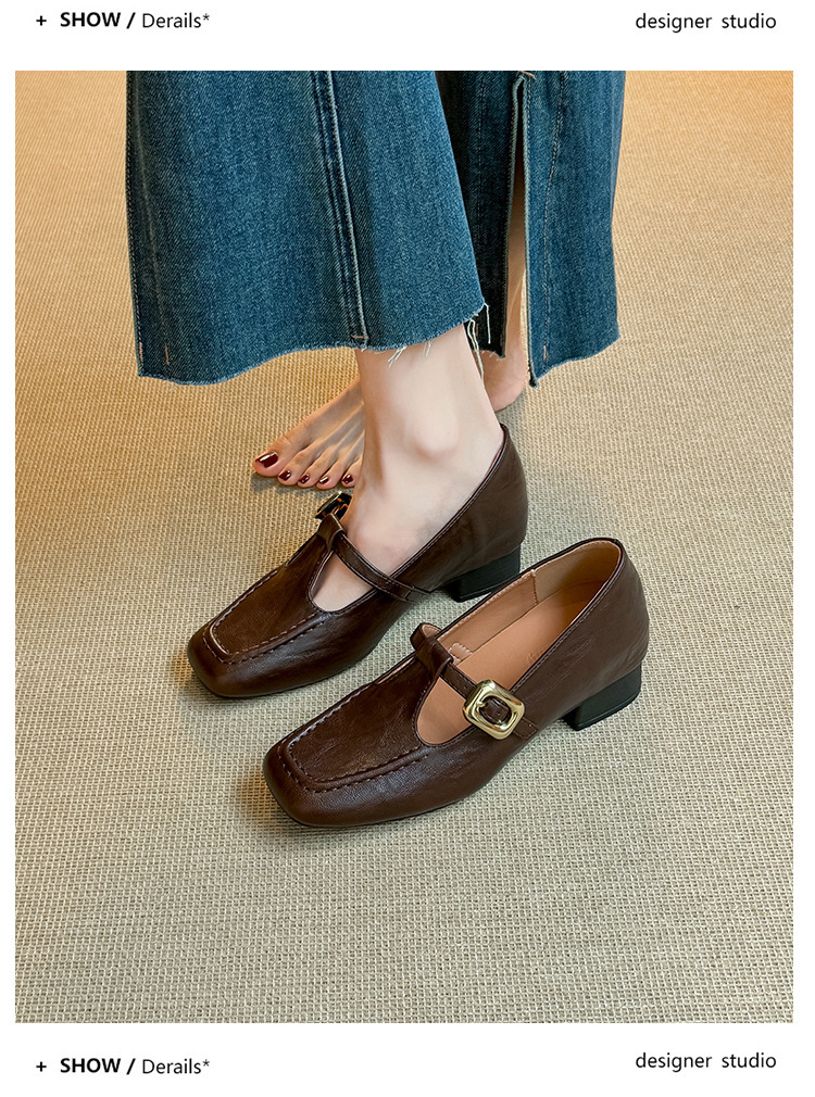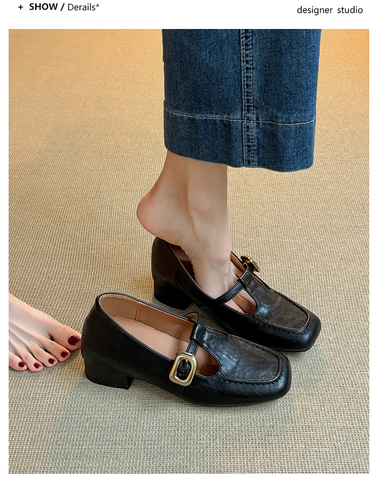인테리어 높이 증가 광장 발가락 메리 제인 가죽 신발 Cowhide 한 자형 버클 벨트 프랑스 얕은 입 양각 부드러운 밑바닥 낮은 발 뒤꿈치 여성 신발