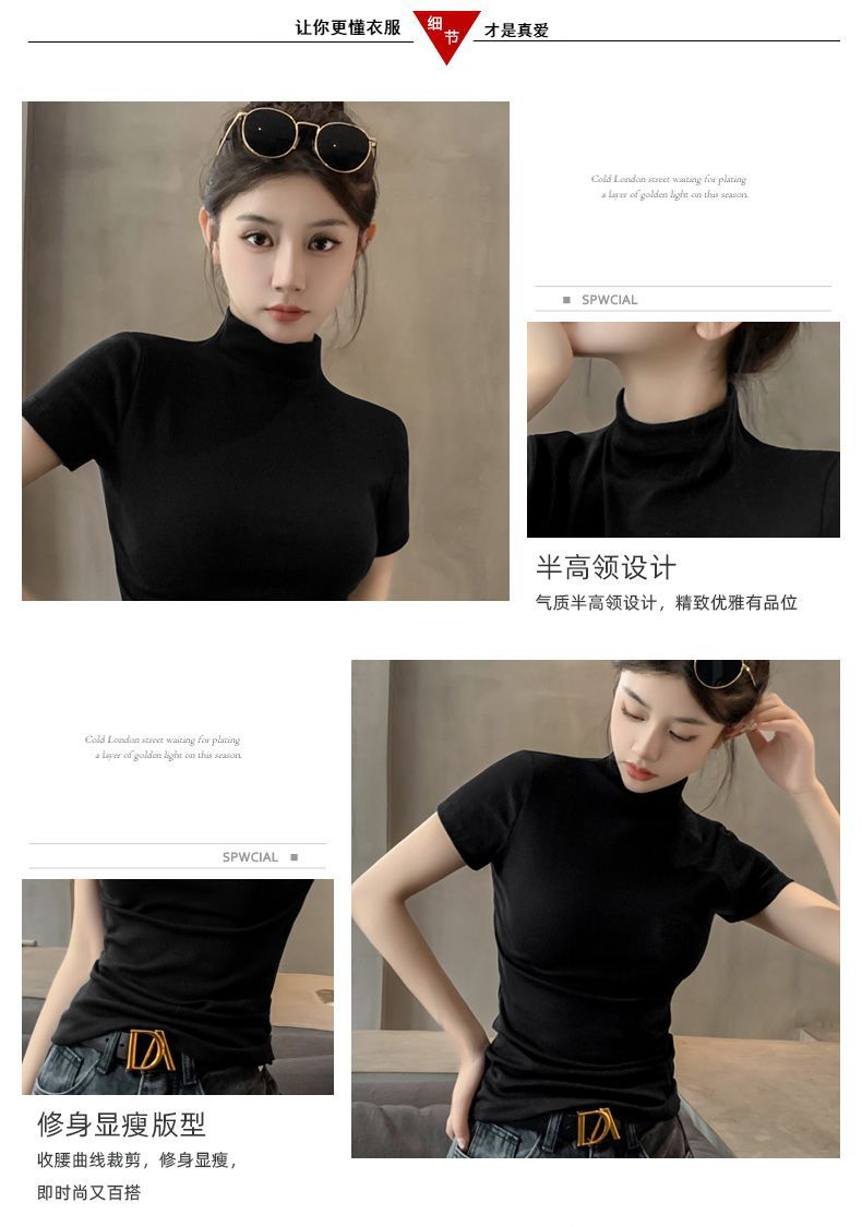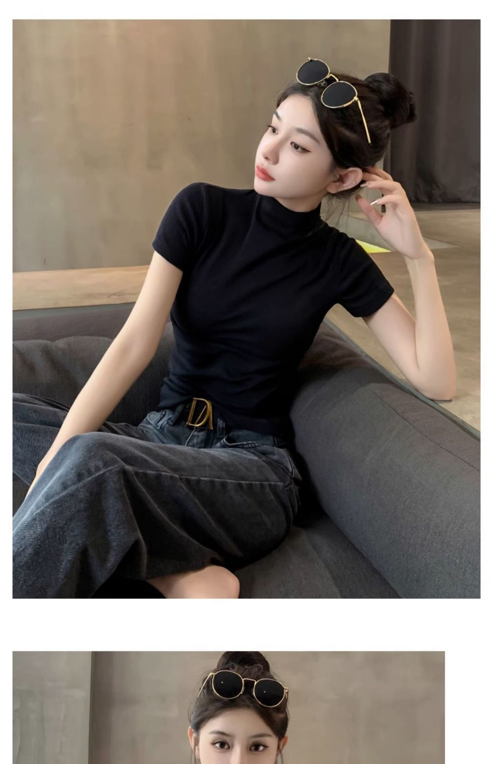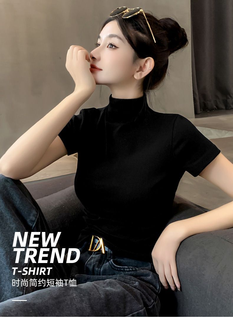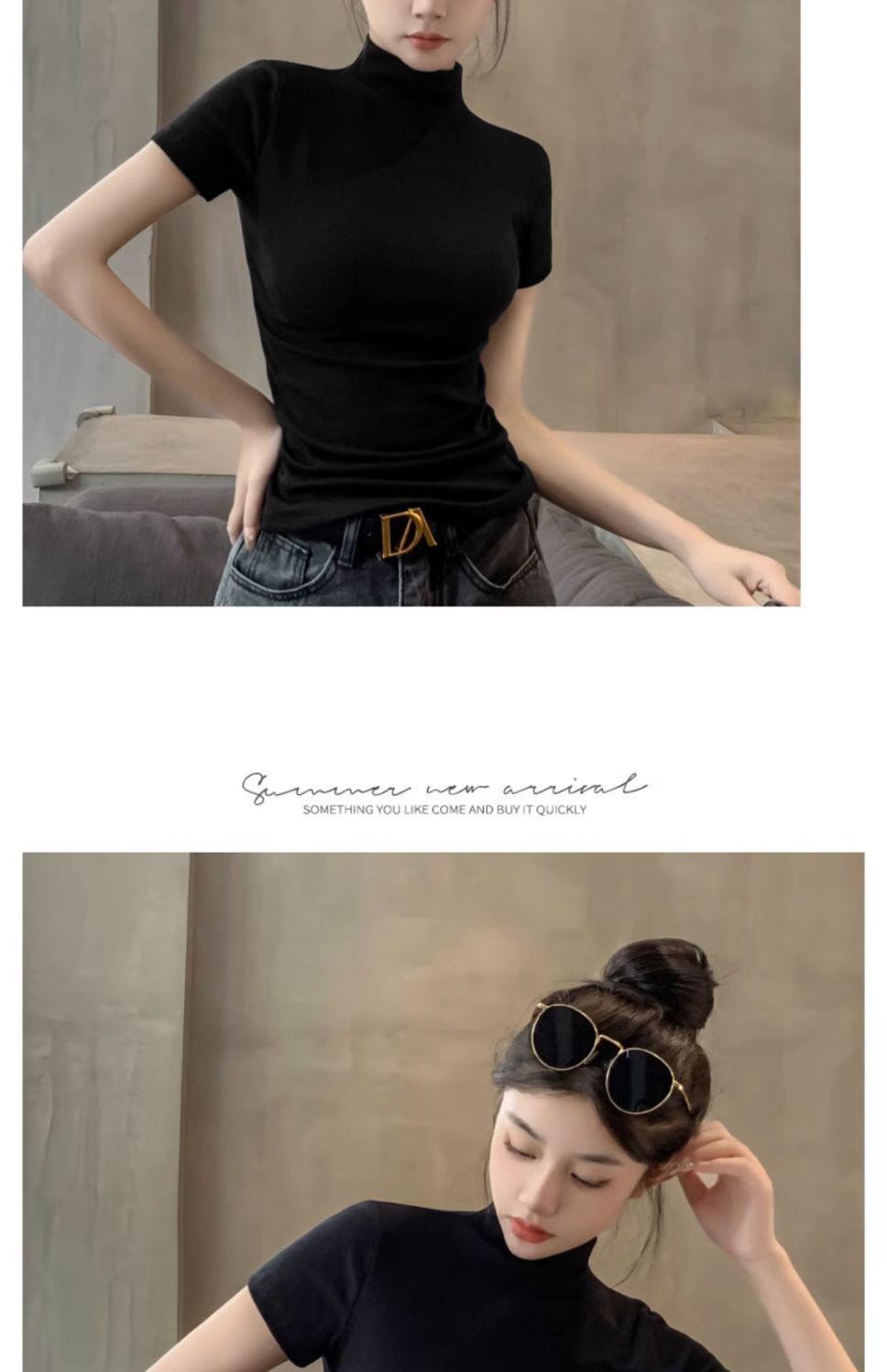 여성용 블랙 반팔 티셔츠, 봄 여름 스타일의 고급스러운 실 반팔 탑이 있는 니트 하프 터틀넥 셔츠스토어 가기