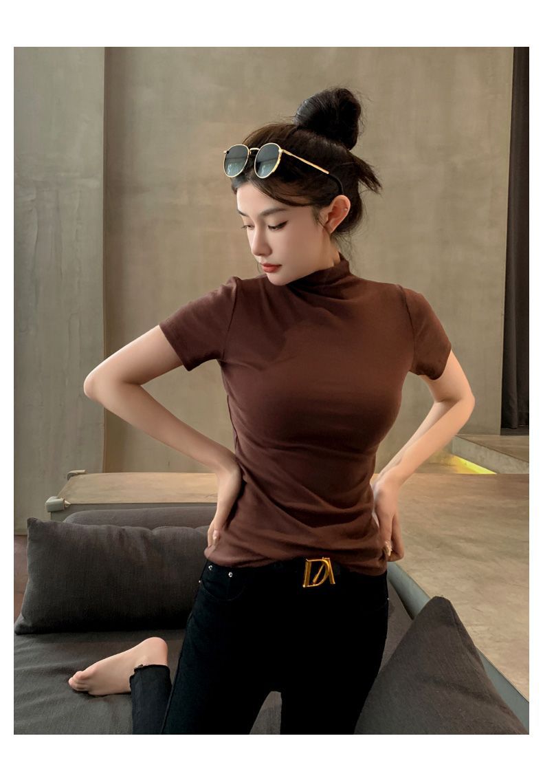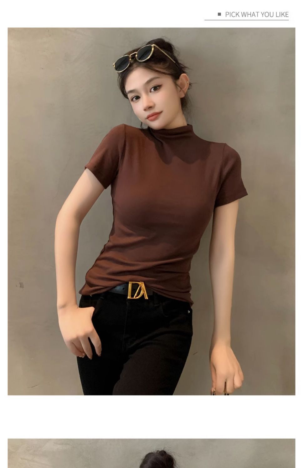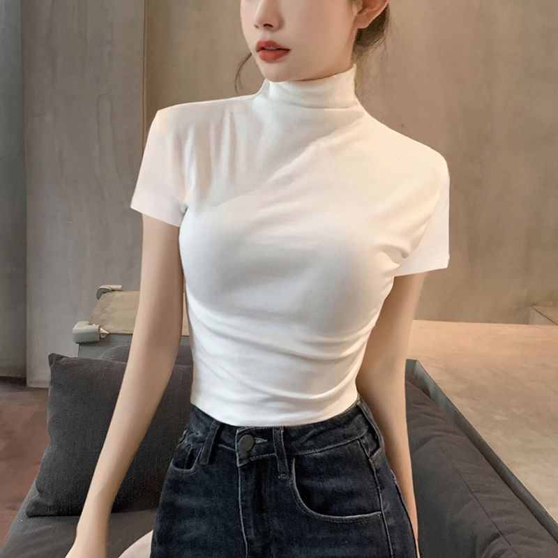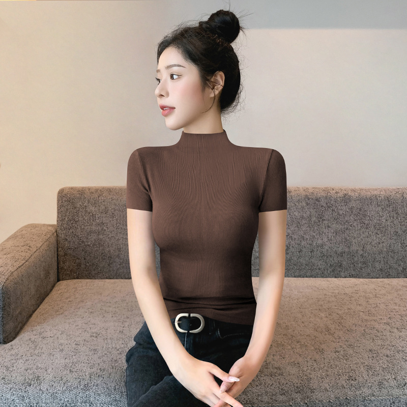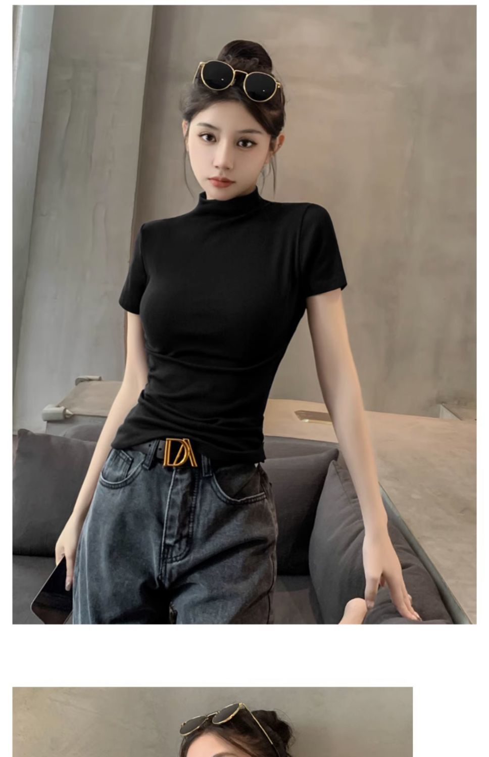 여성용 블랙 반팔 티셔츠, 봄 여름 스타일의 고급스러운 실 반팔 탑이 있는 니트 하프 터틀넥 셔츠스토어 가기