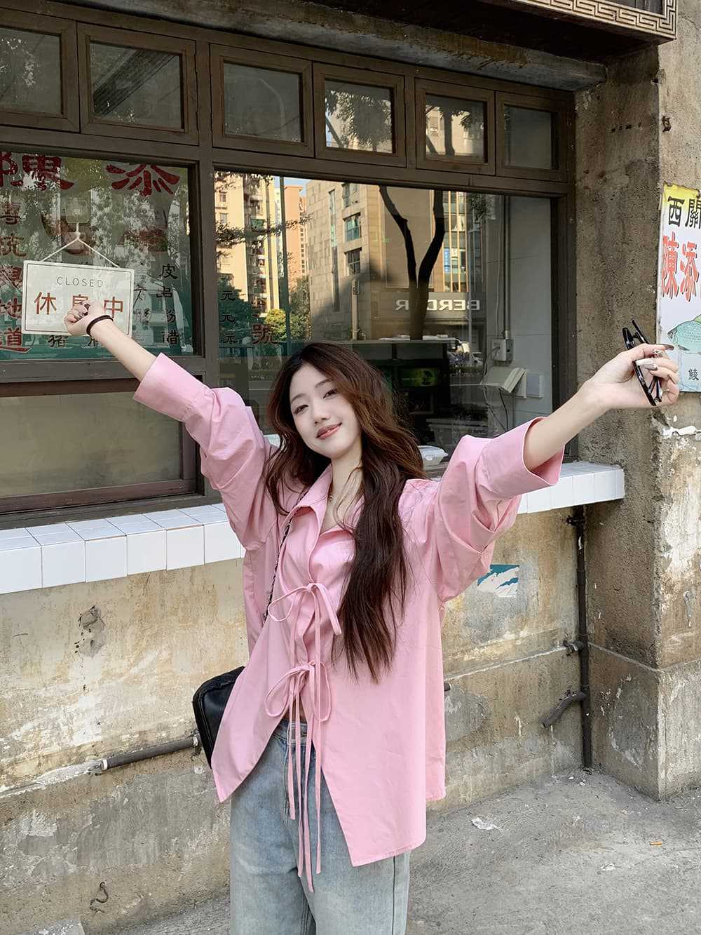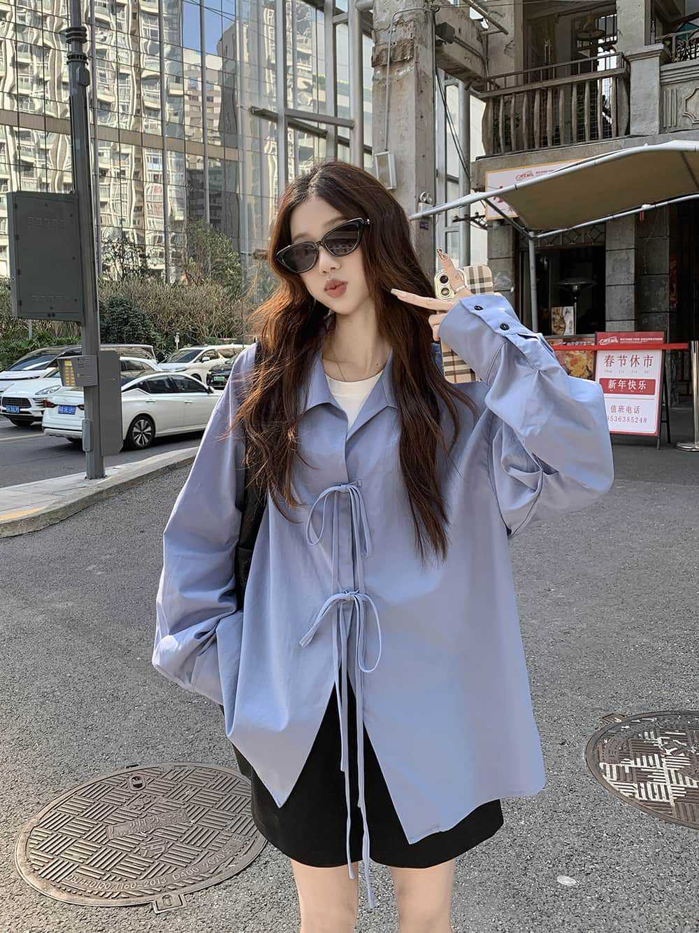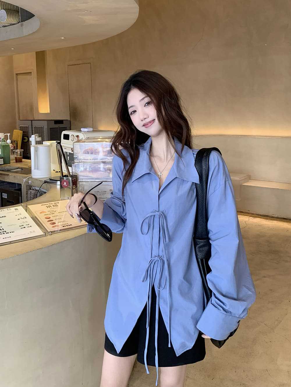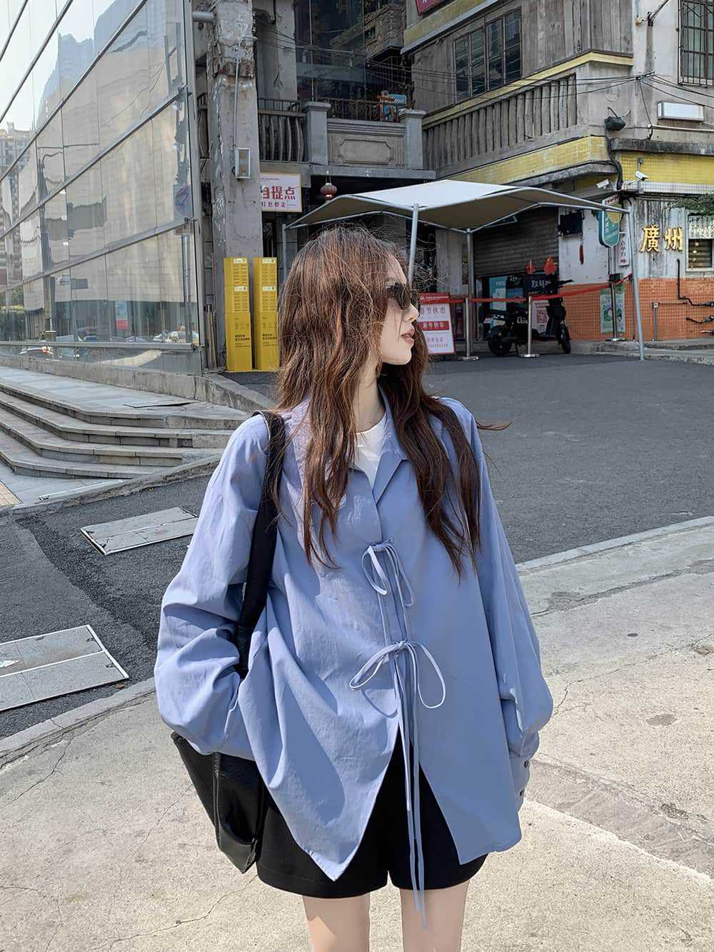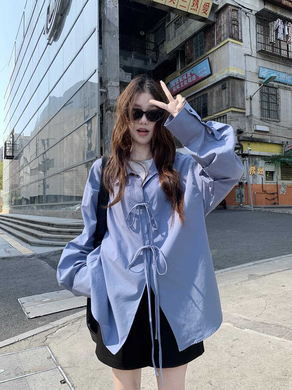 여성을위한 아침 스타일 게으른 스타일 보우 타이 긴팔 셔츠 여름 새로운 캐주얼 루즈 라펠 중간 길이 탑스토어 가기