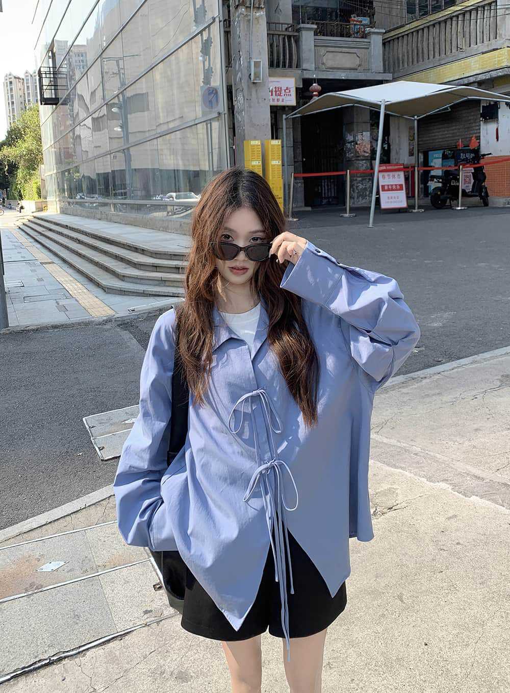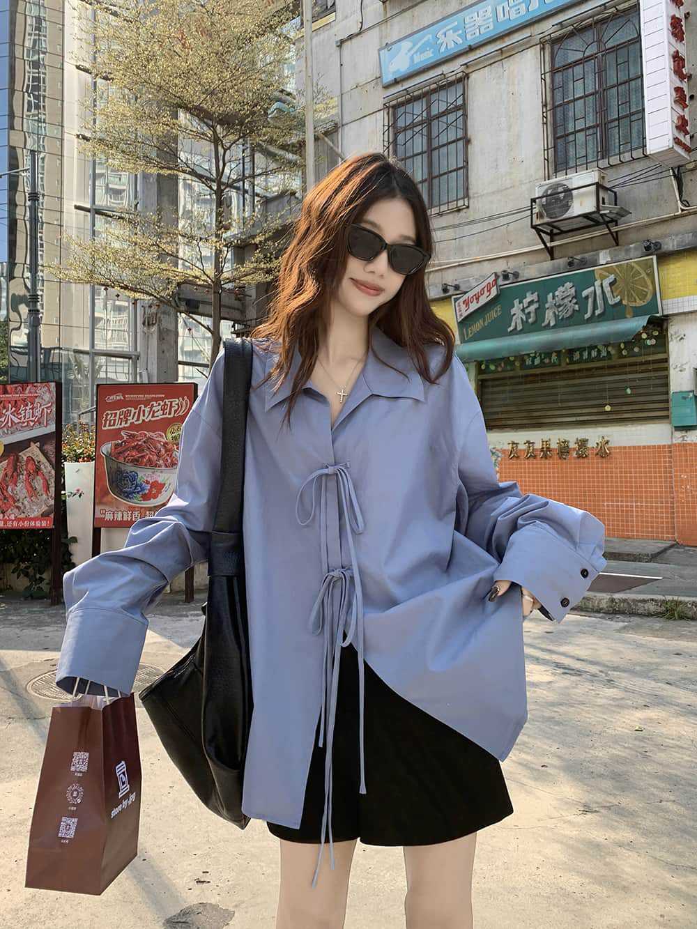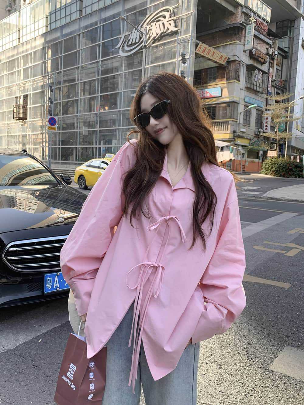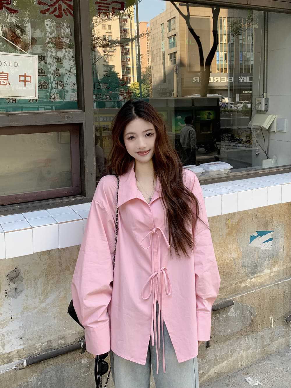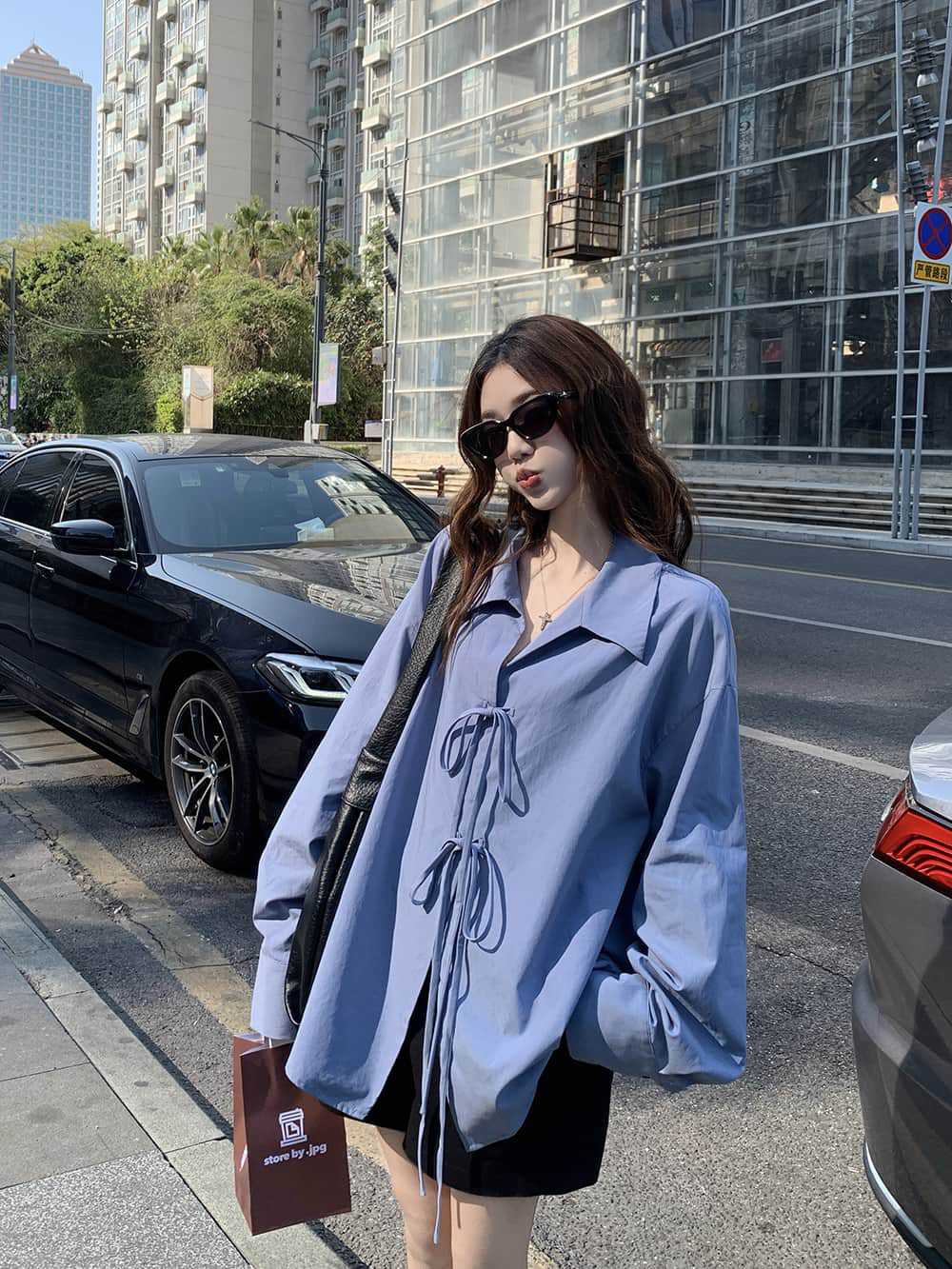 여성을위한 아침 스타일 게으른 스타일 보우 타이 긴팔 셔츠 여름 새로운 캐주얼 루즈 라펠 중간 길이 탑스토어 가기