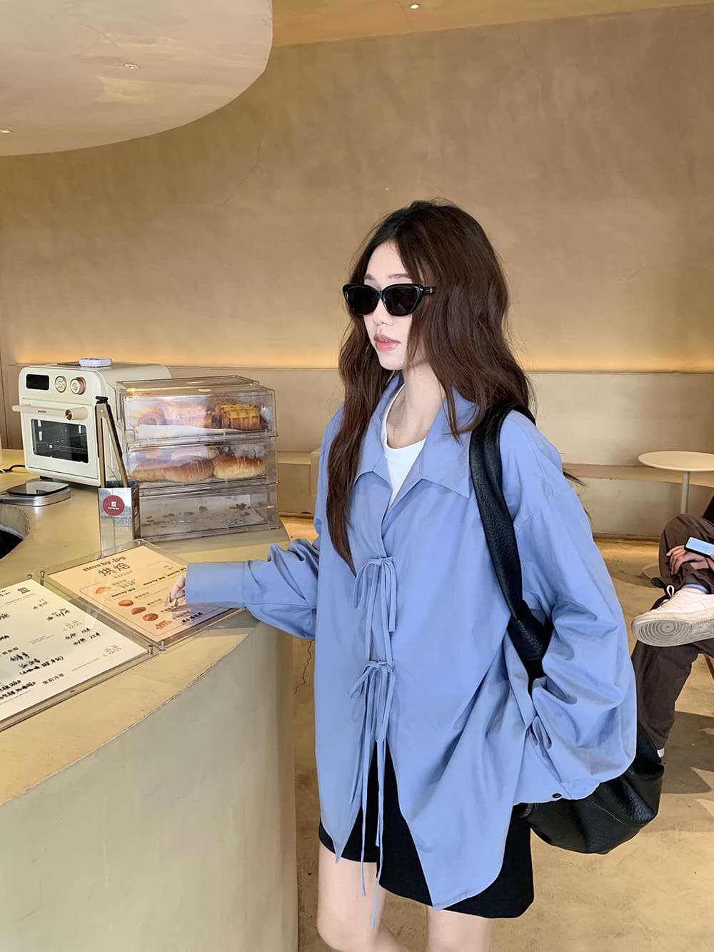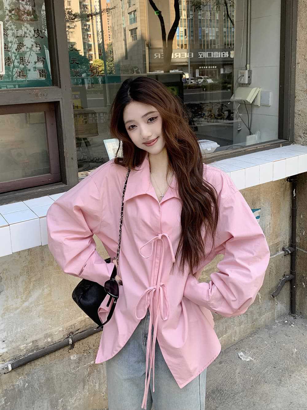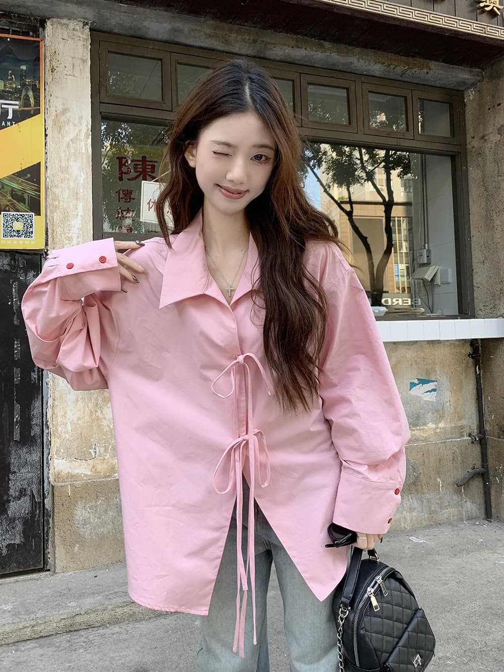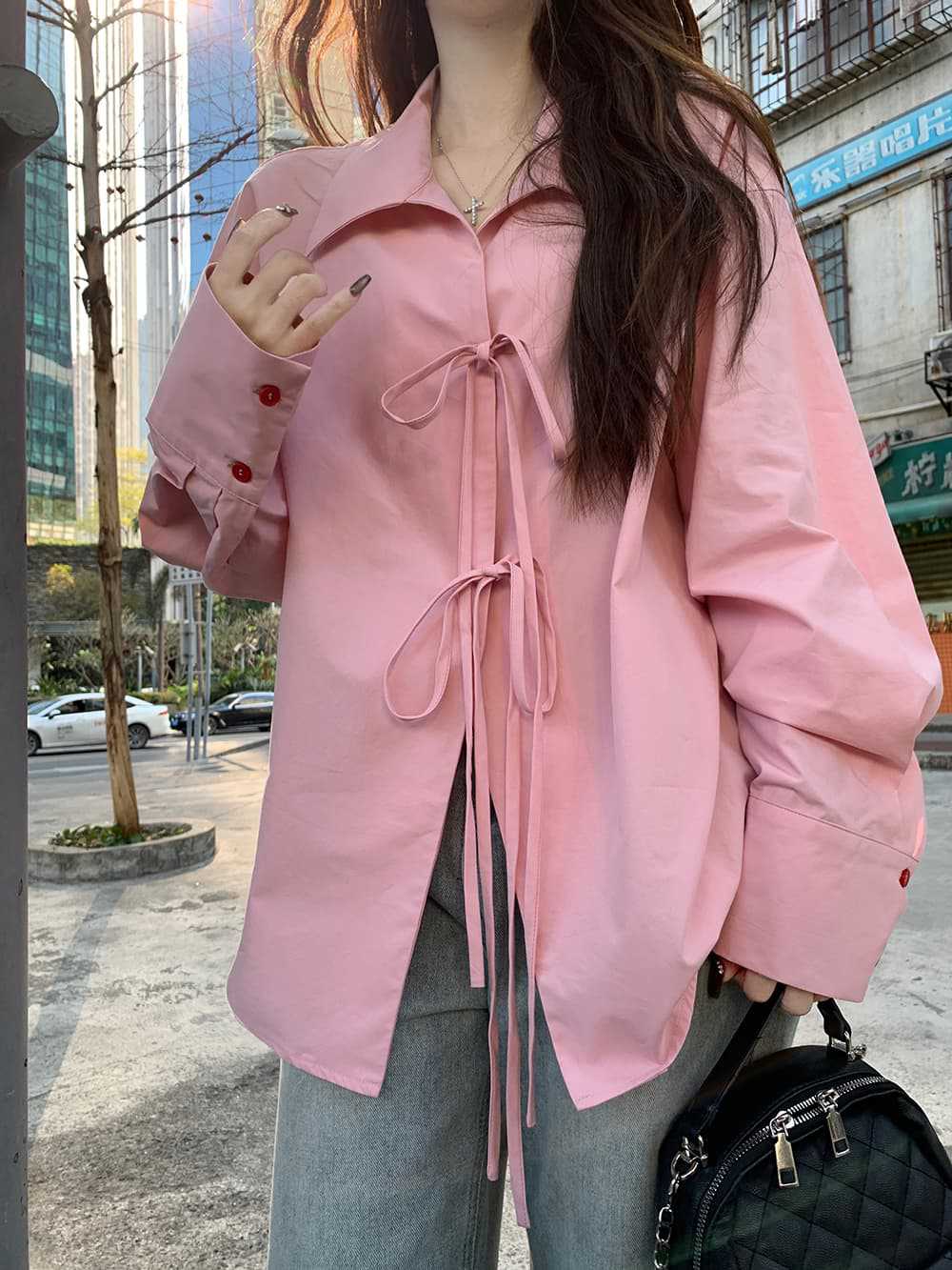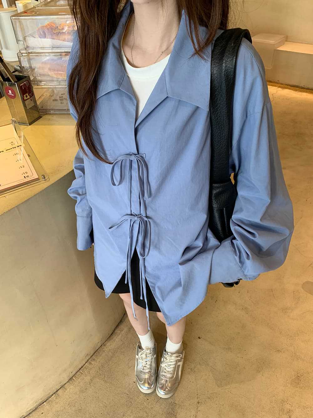 여성을위한 아침 스타일 게으른 스타일 보우 타이 긴팔 셔츠 여름 새로운 캐주얼 루즈 라펠 중간 길이 탑스토어 가기