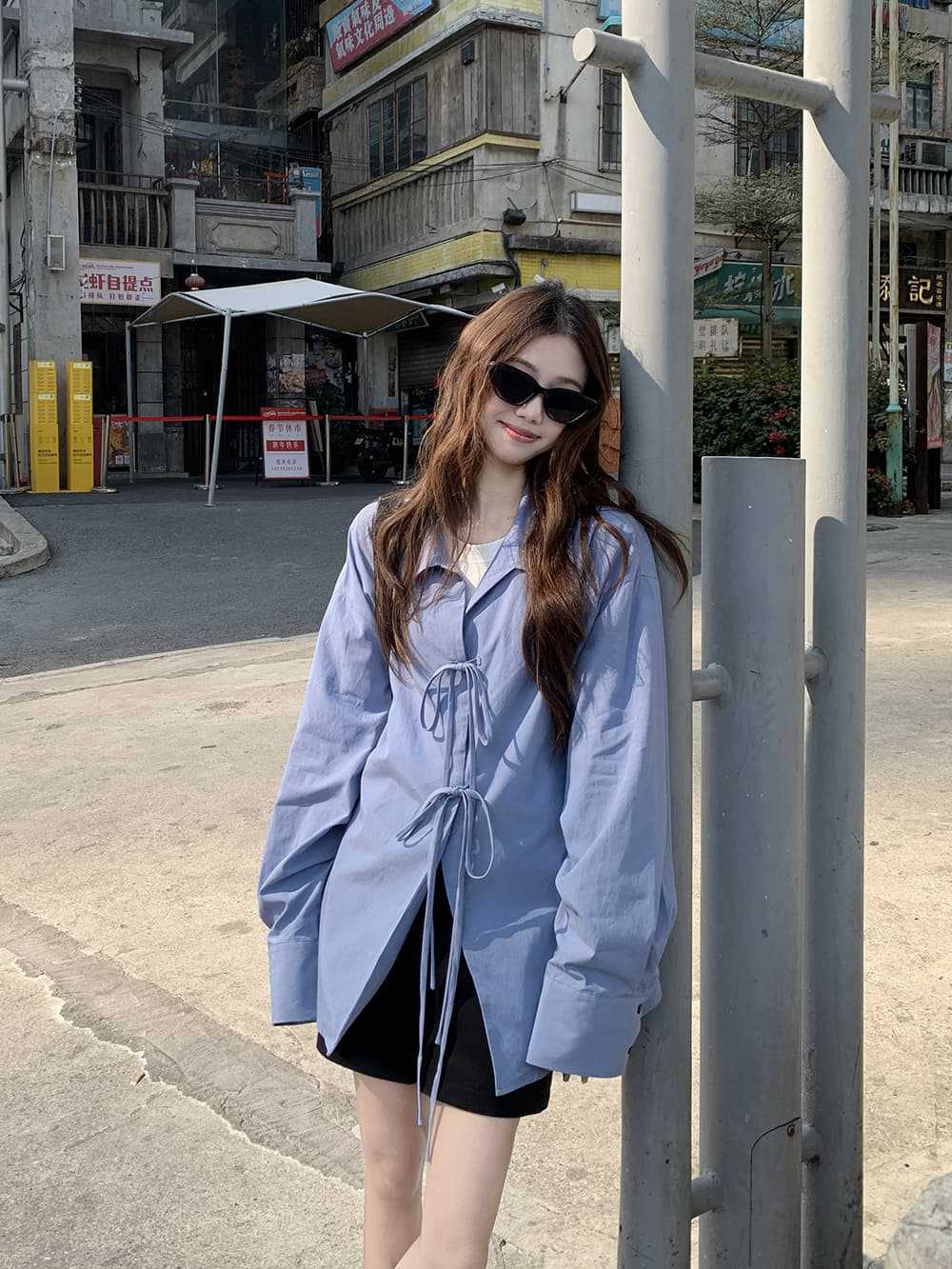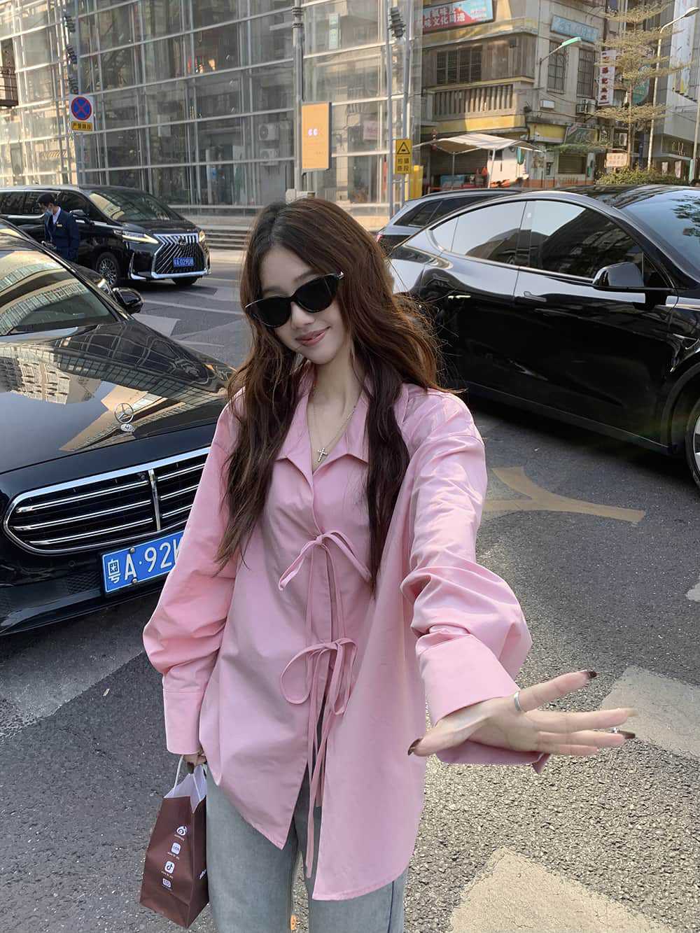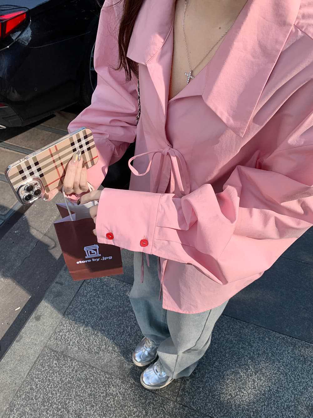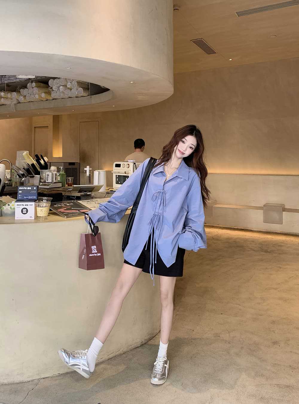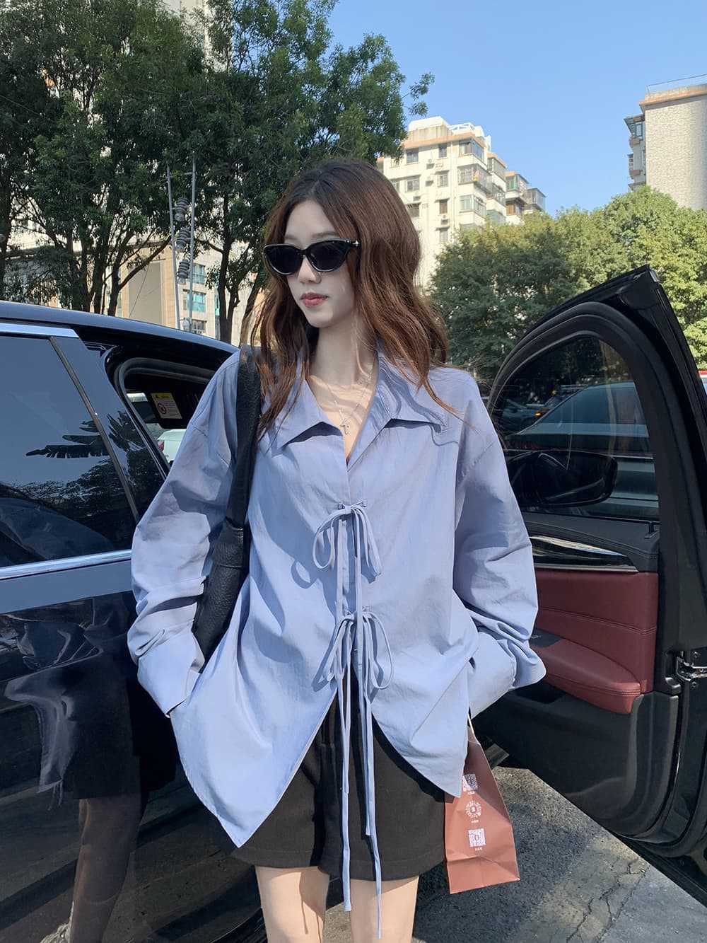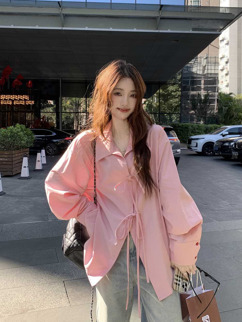 여성을위한 아침 스타일 게으른 스타일 보우 타이 긴팔 셔츠 여름 새로운 캐주얼 루즈 라펠 중간 길이 탑스토어 가기