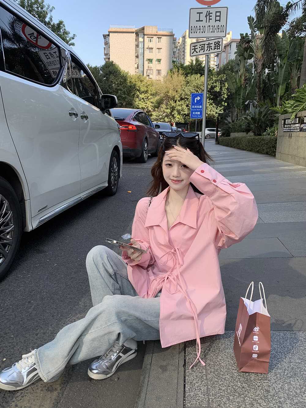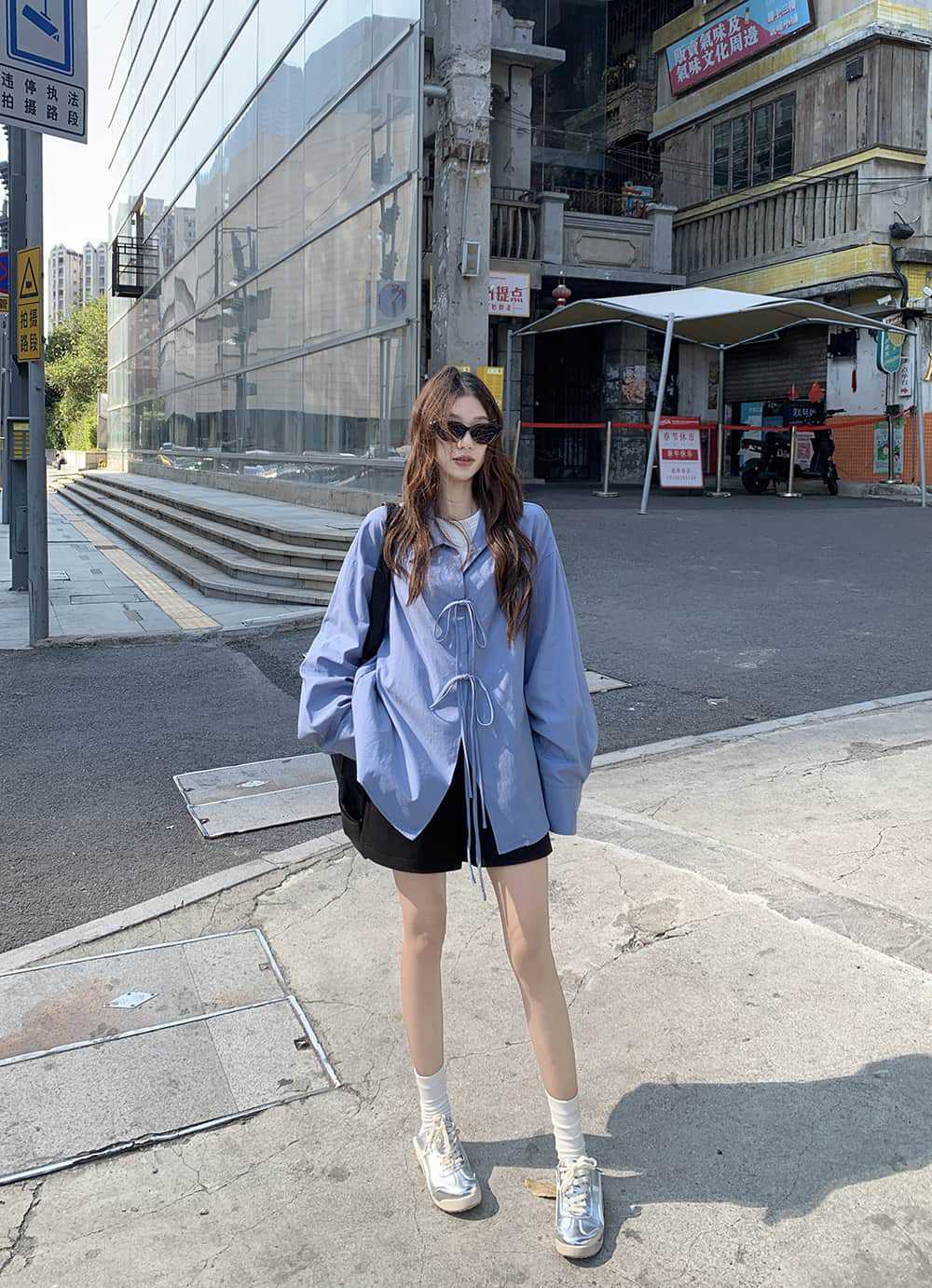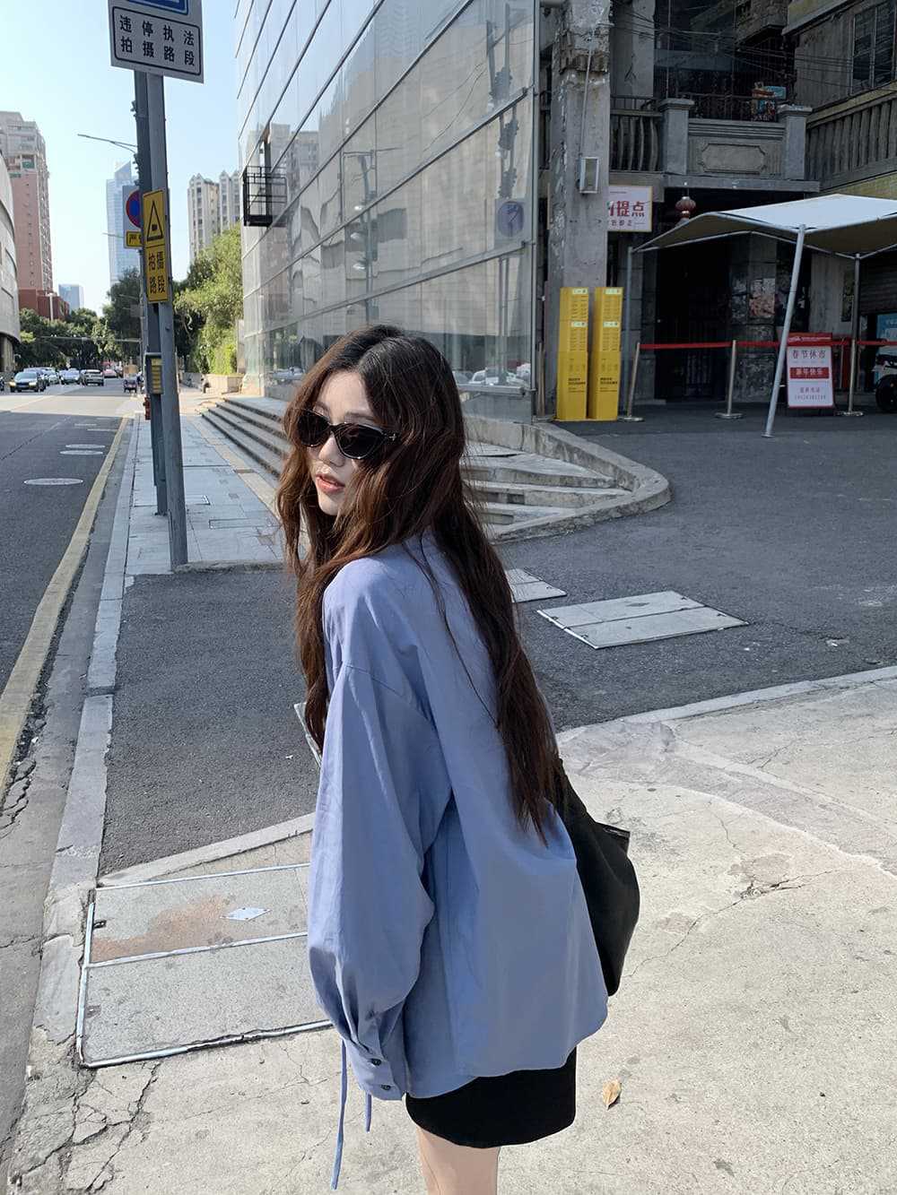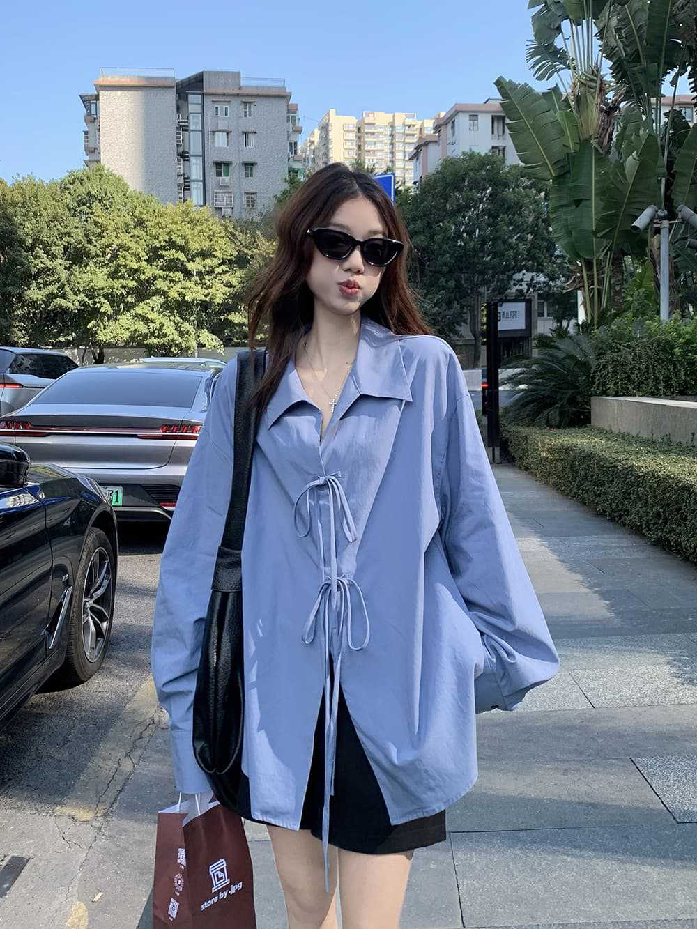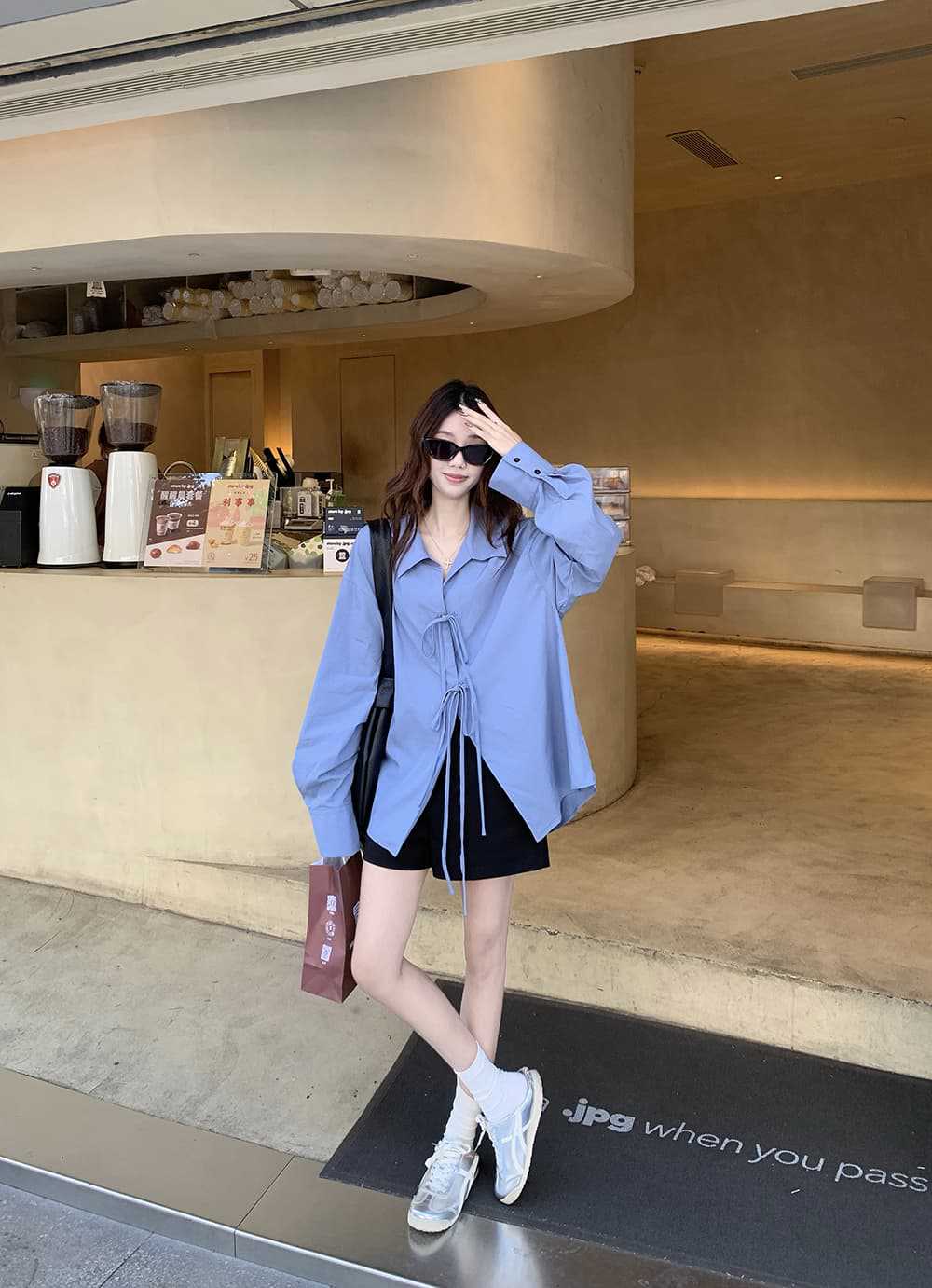 여성을위한 아침 스타일 게으른 스타일 보우 타이 긴팔 셔츠 여름 새로운 캐주얼 루즈 라펠 중간 길이 탑스토어 가기