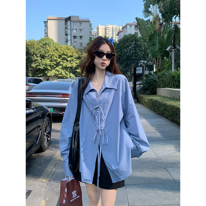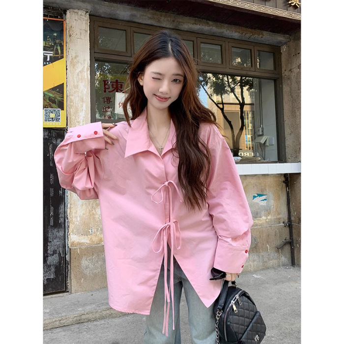 여성을위한 아침 스타일 게으른 스타일 보우 타이 긴팔 셔츠 여름 새로운 캐주얼 루즈 라펠 중간 길이 탑