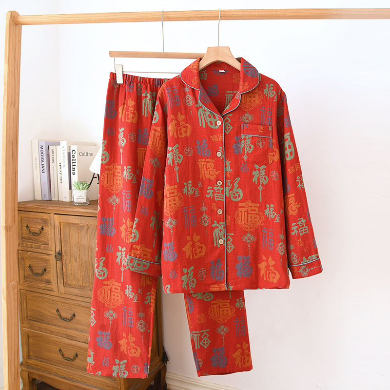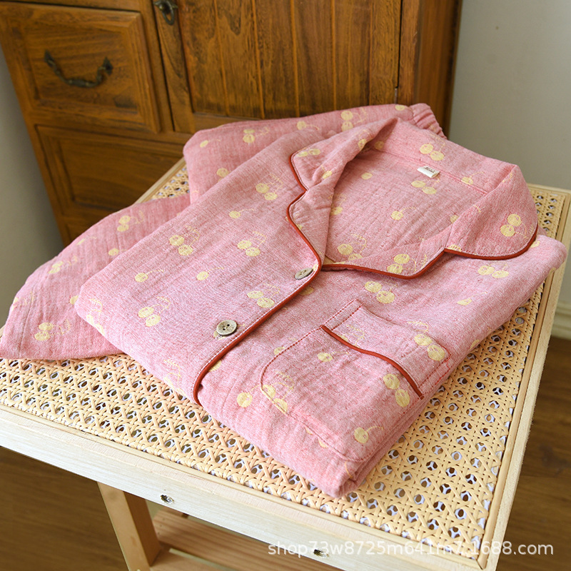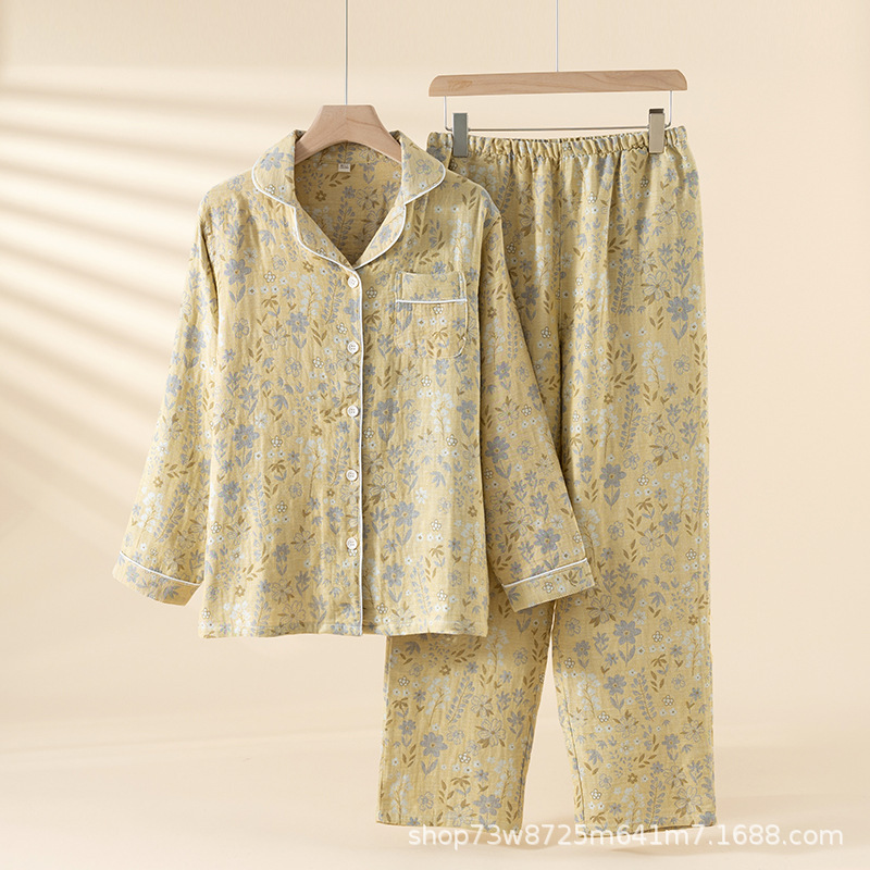 클래스 A 면 더블 레이어 원사 잠옷 여성용 홈웨어 긴팔 바지 정장 사계절 착용 가능한 원사 염색 라펠 스타일