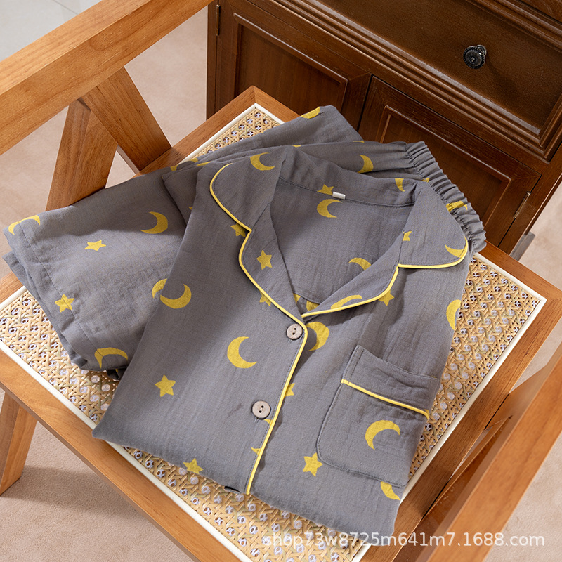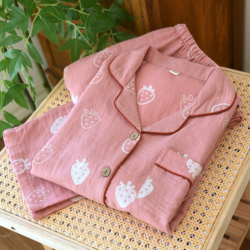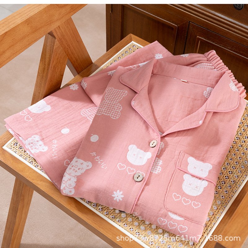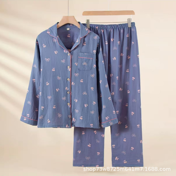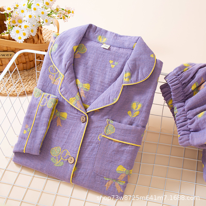 클래스 A 면 더블 레이어 원사 잠옷 여성용 홈웨어 긴팔 바지 정장 사계절 착용 가능한 원사 염색 라펠 스타일스토어 가기