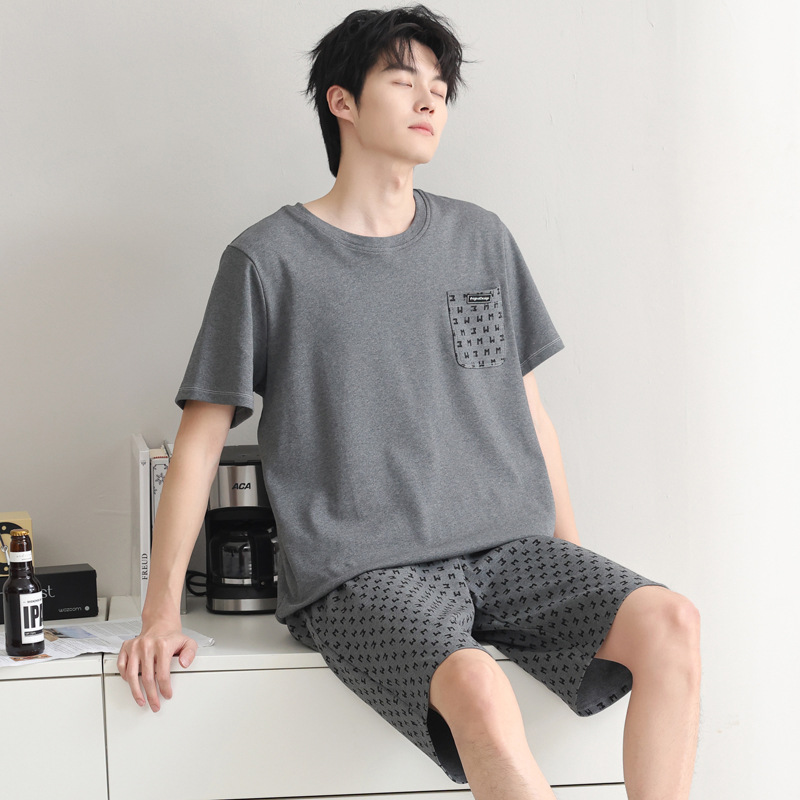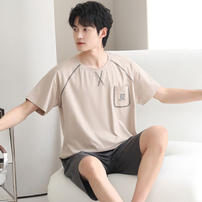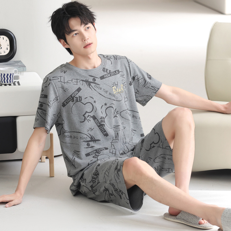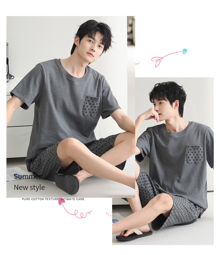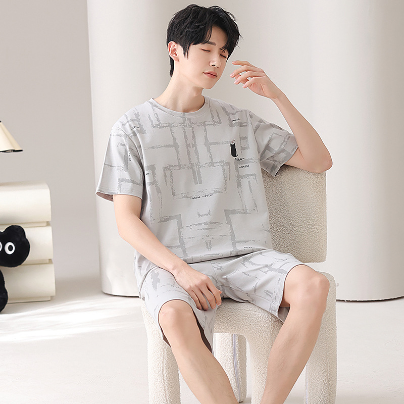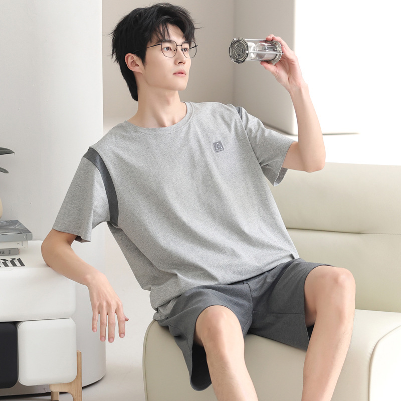 100% 면 여름 잠옷 세트 남성용 얇은 홈 착용 짧은 소매 반바지 간단한 캐주얼 모든 면 외부 착용스토어 가기