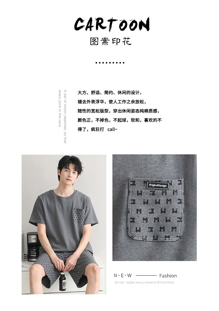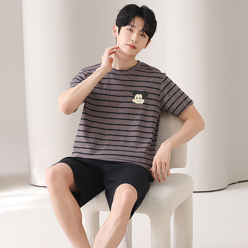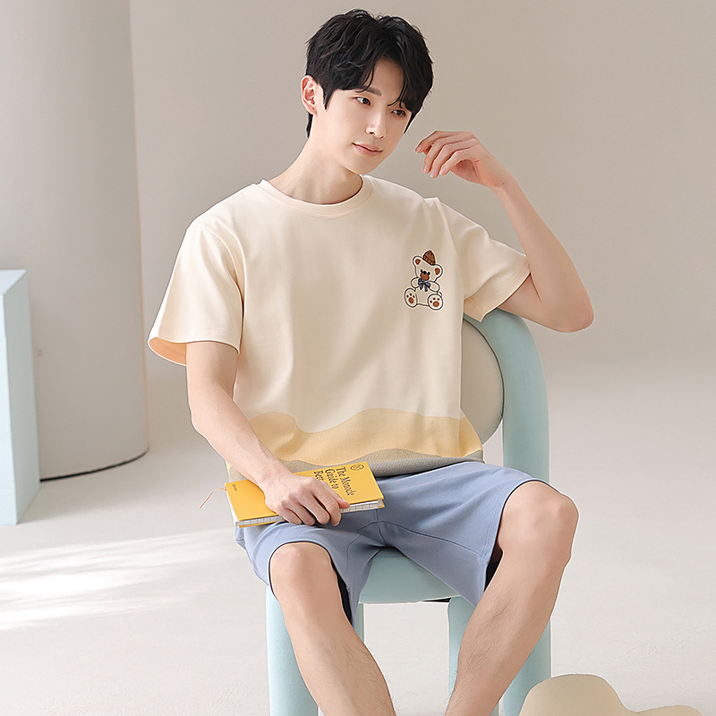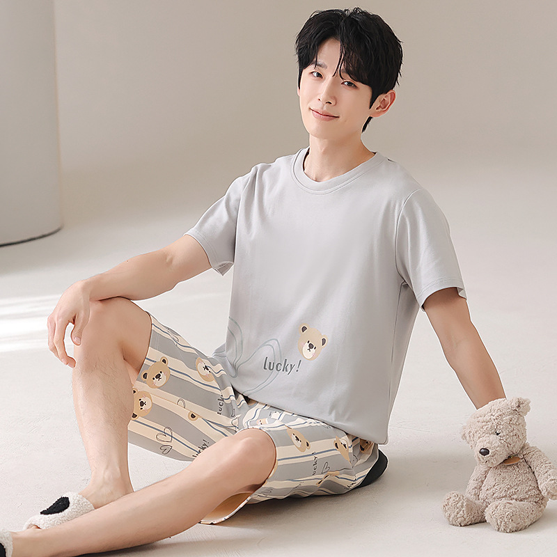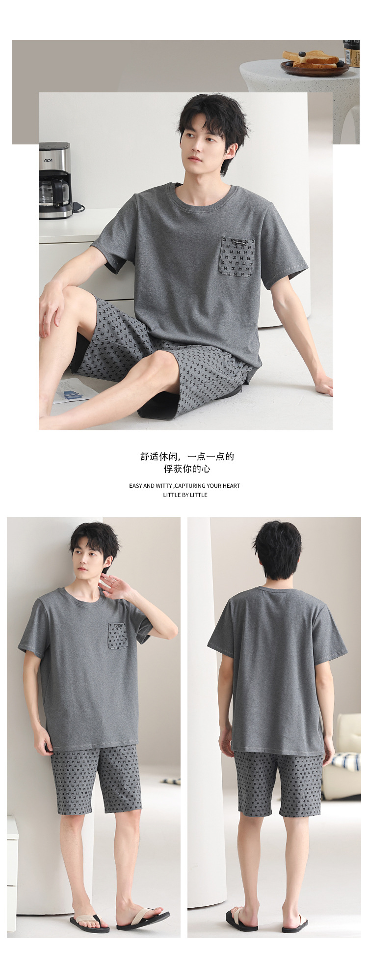 100% 면 여름 잠옷 세트 남성용 얇은 홈 착용 짧은 소매 반바지 간단한 캐주얼 모든 면 외부 착용스토어 가기