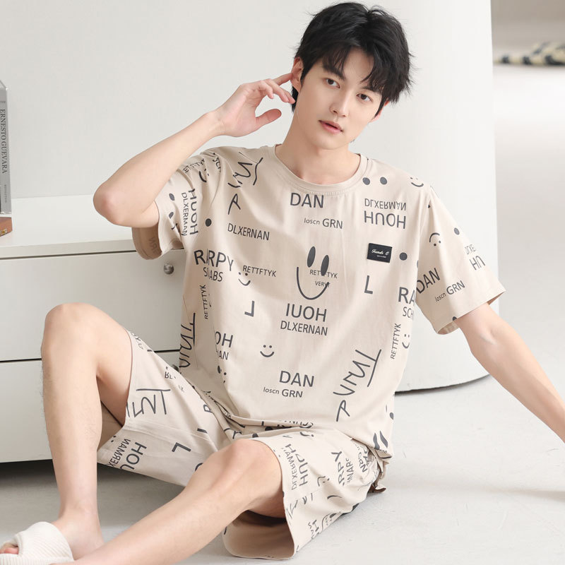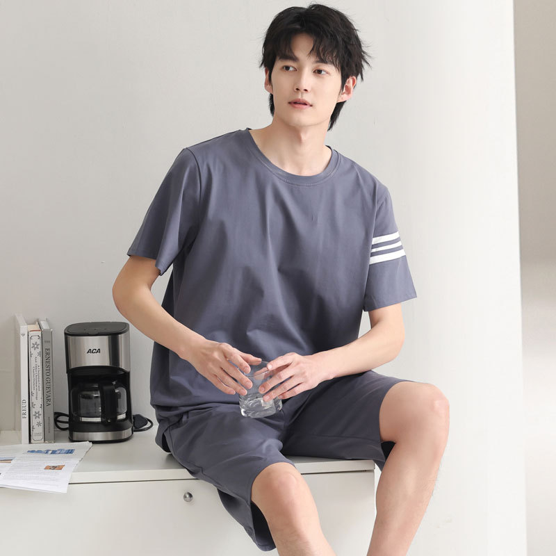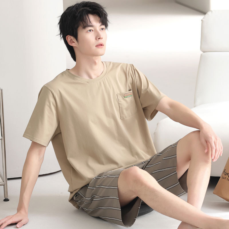 100% 면 여름 잠옷 세트 남성용 얇은 홈 착용 짧은 소매 반바지 간단한 캐주얼 모든 면 외부 착용