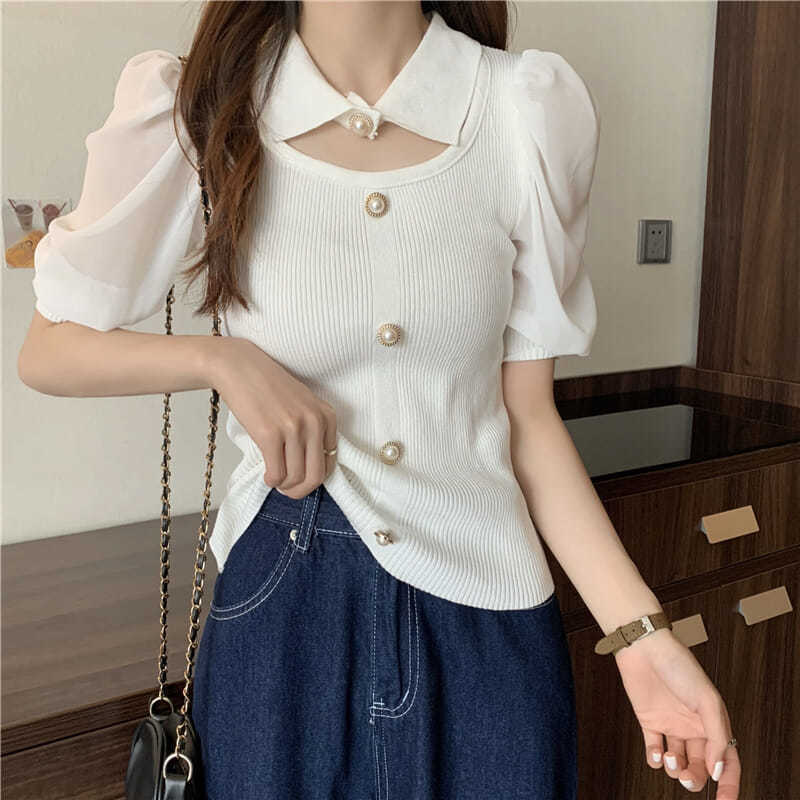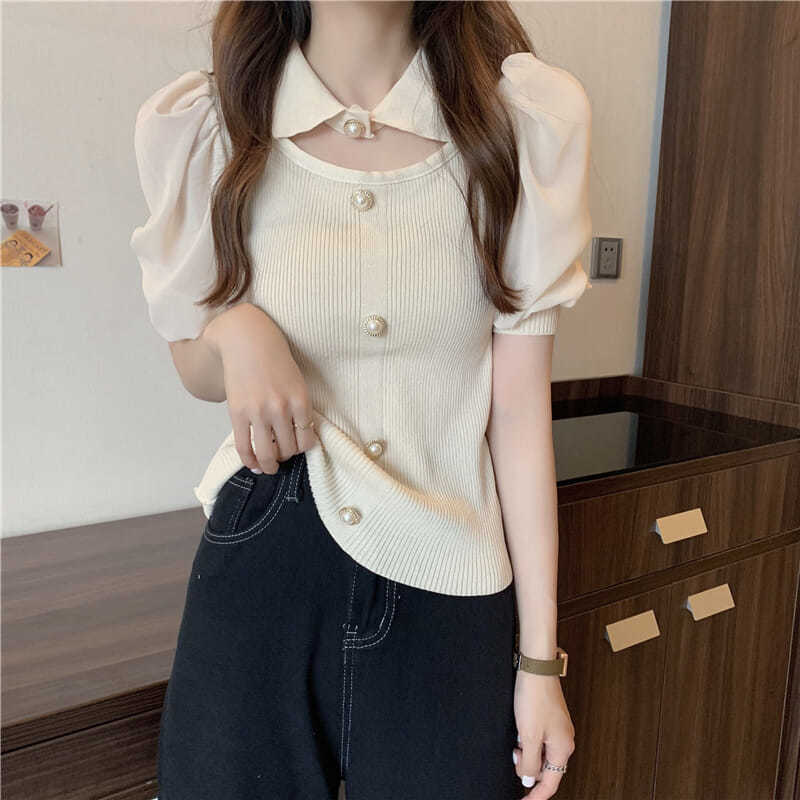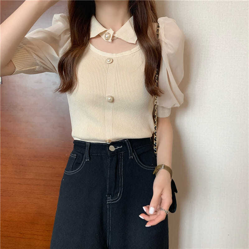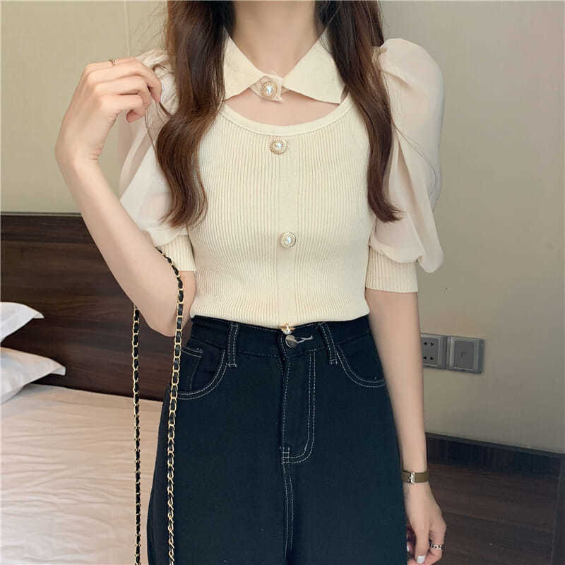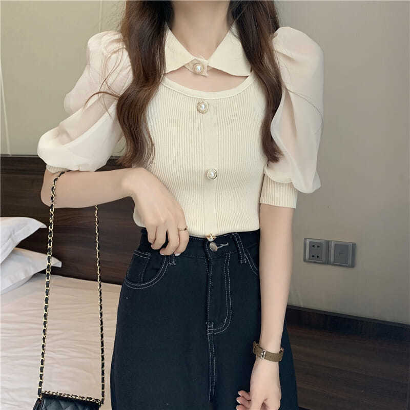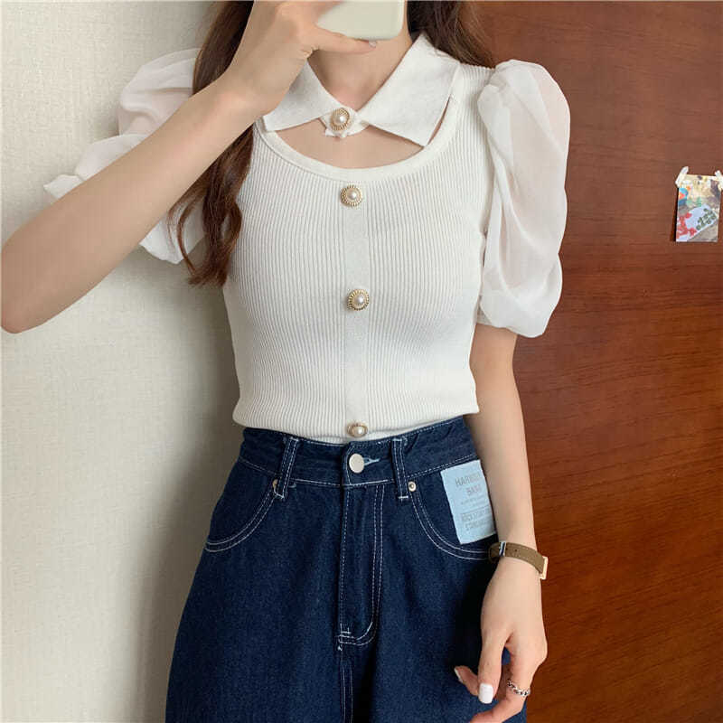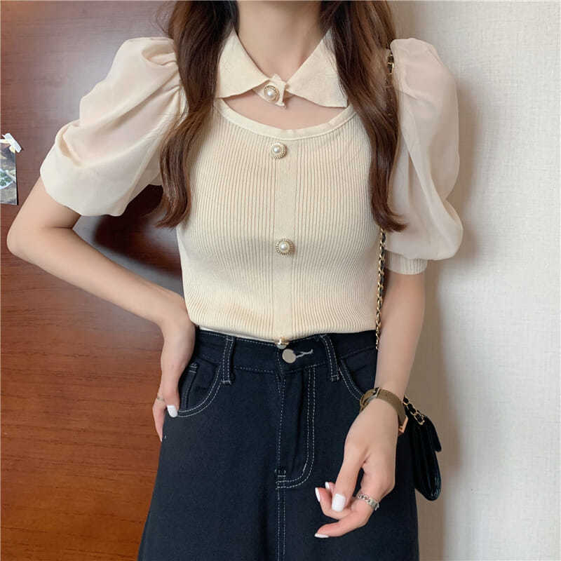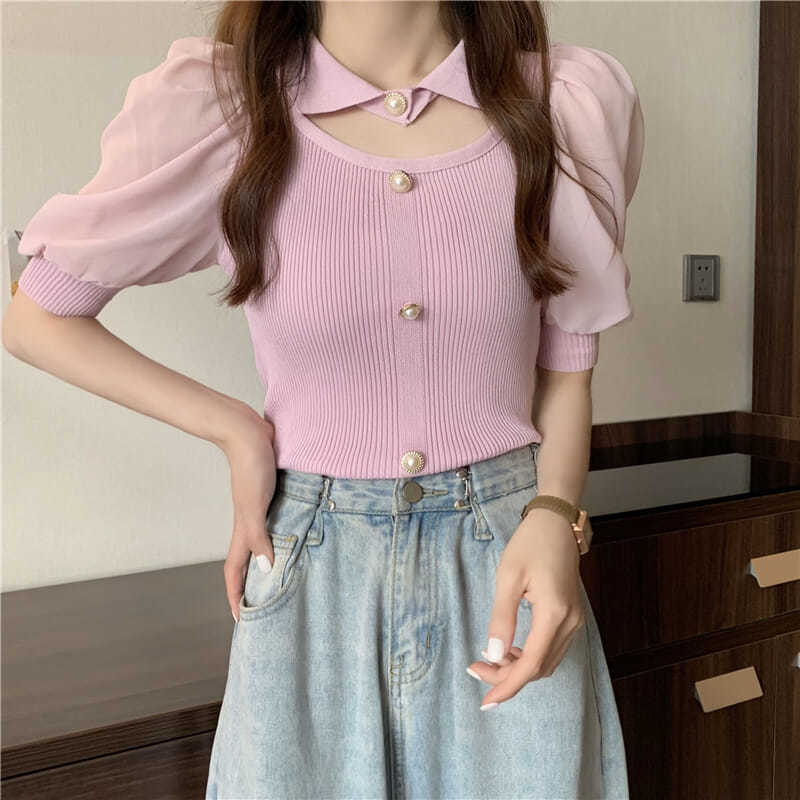 2023 새로운 다목적 달콤한 퍼프 슬리브 디자인 슬림 니트 반팔 여성 여름 얇은 짧은 스웨터 탑스토어 가기