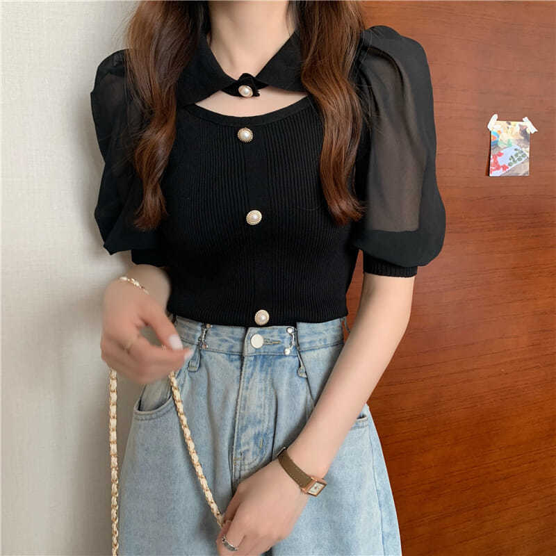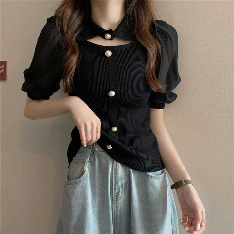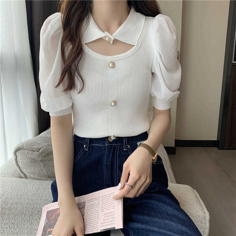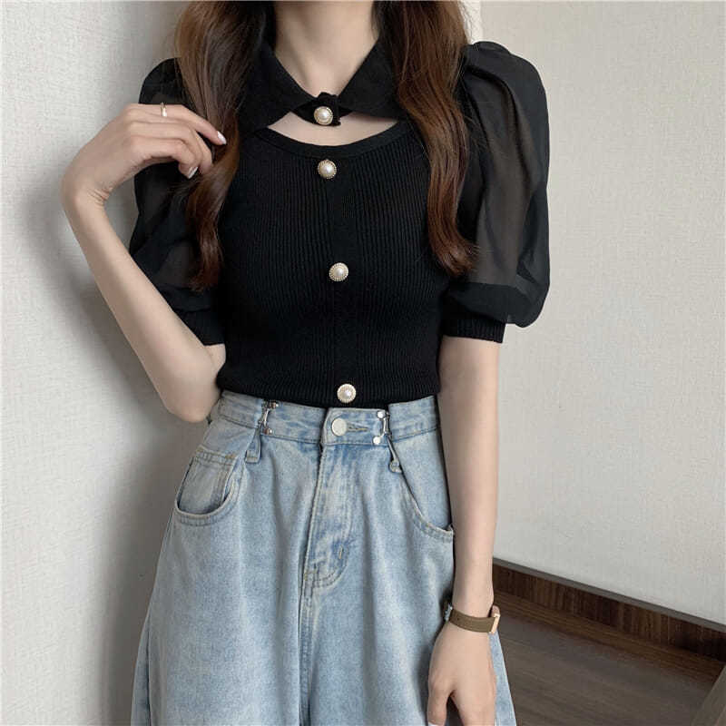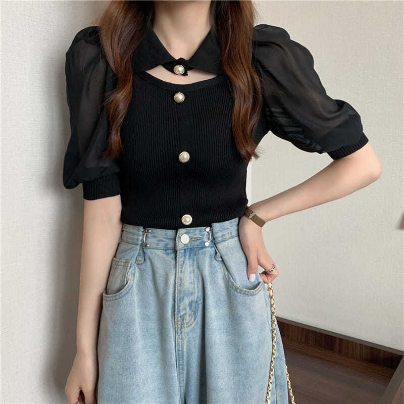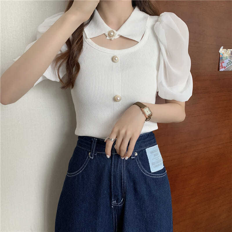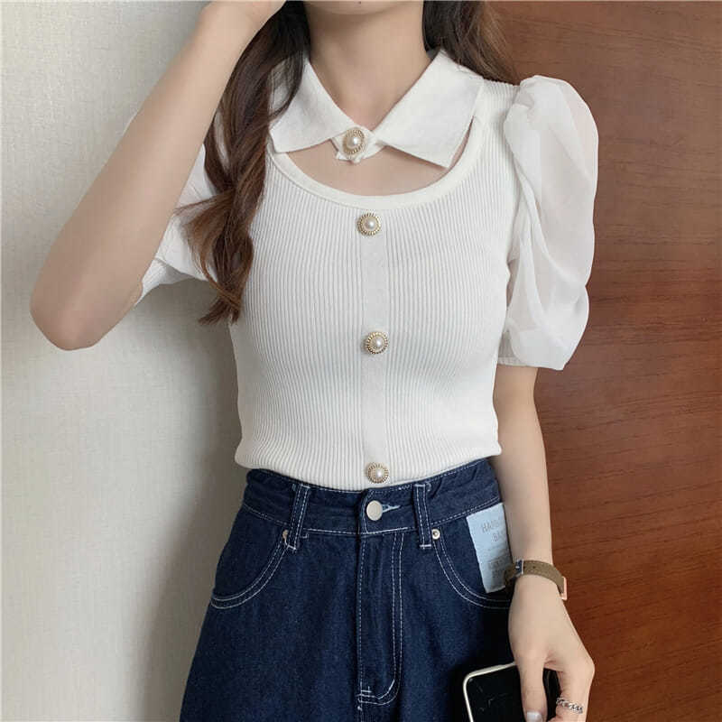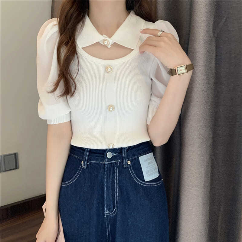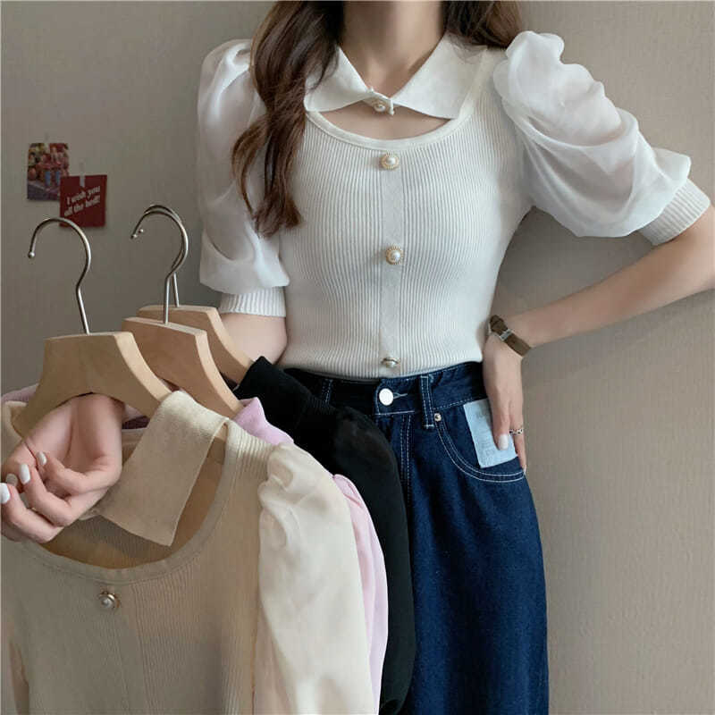 2023 새로운 다목적 달콤한 퍼프 슬리브 디자인 슬림 니트 반팔 여성 여름 얇은 짧은 스웨터 탑스토어 가기
