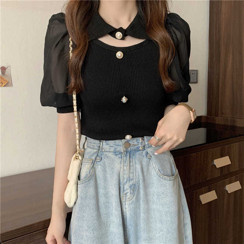 2023 새로운 다목적 달콤한 퍼프 슬리브 디자인 슬림 니트 반팔 여성 여름 얇은 짧은 스웨터 탑