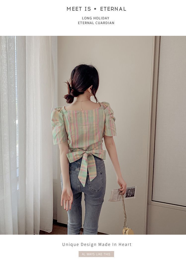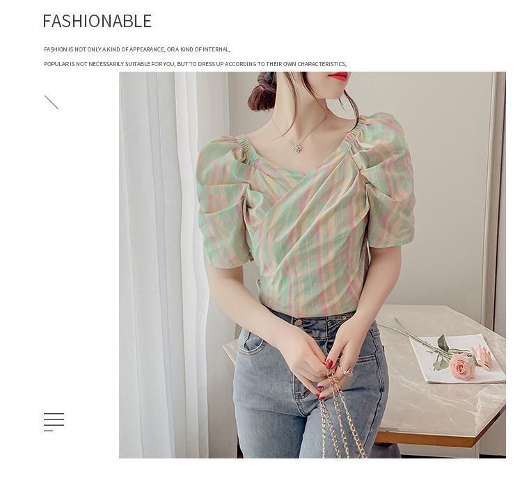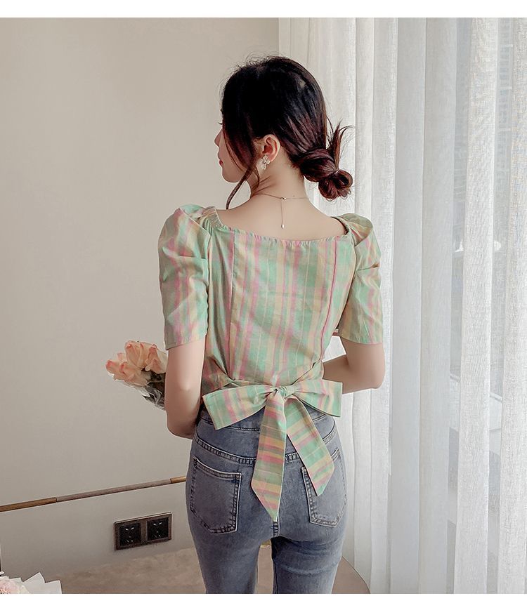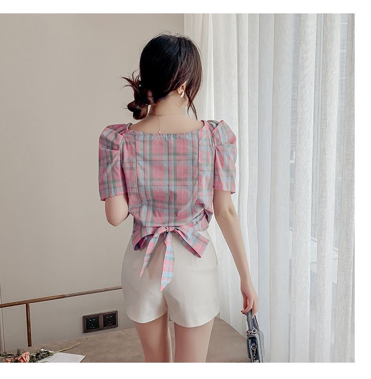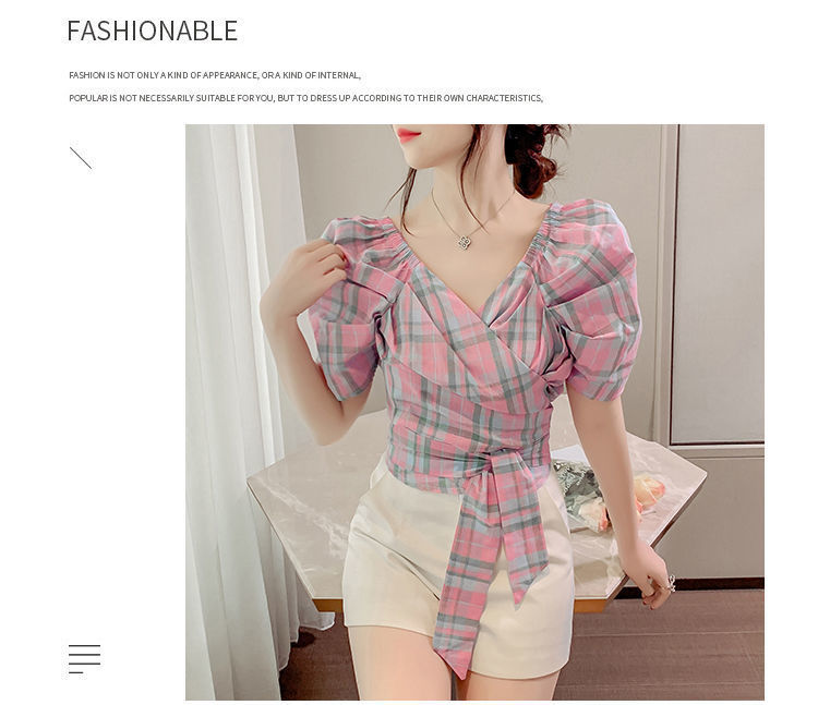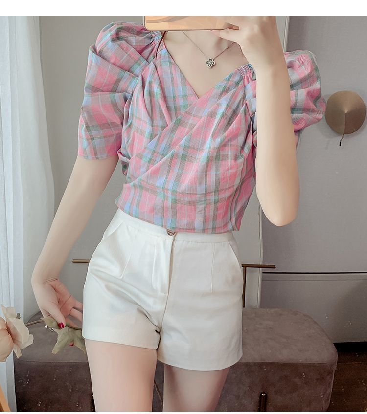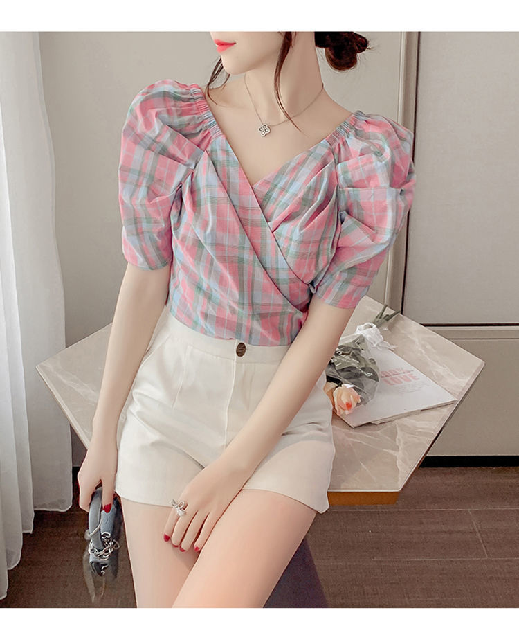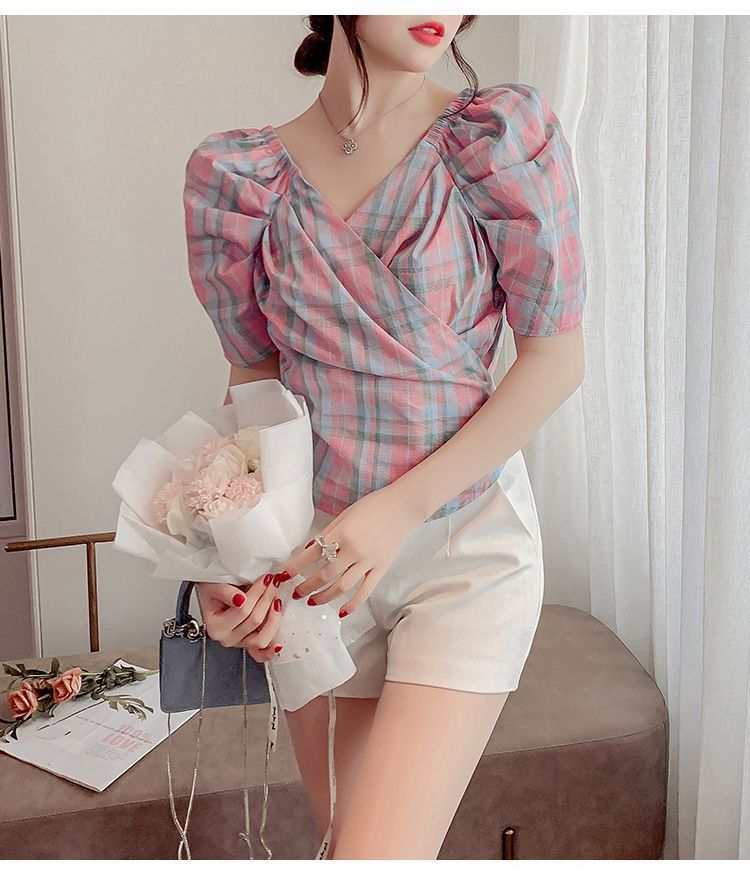 프렌치 V 넥 격자 무늬 쉬폰 반팔 셔츠 활 여름 독특한 세련된 디자인 센스 퍼프 소매 짧은