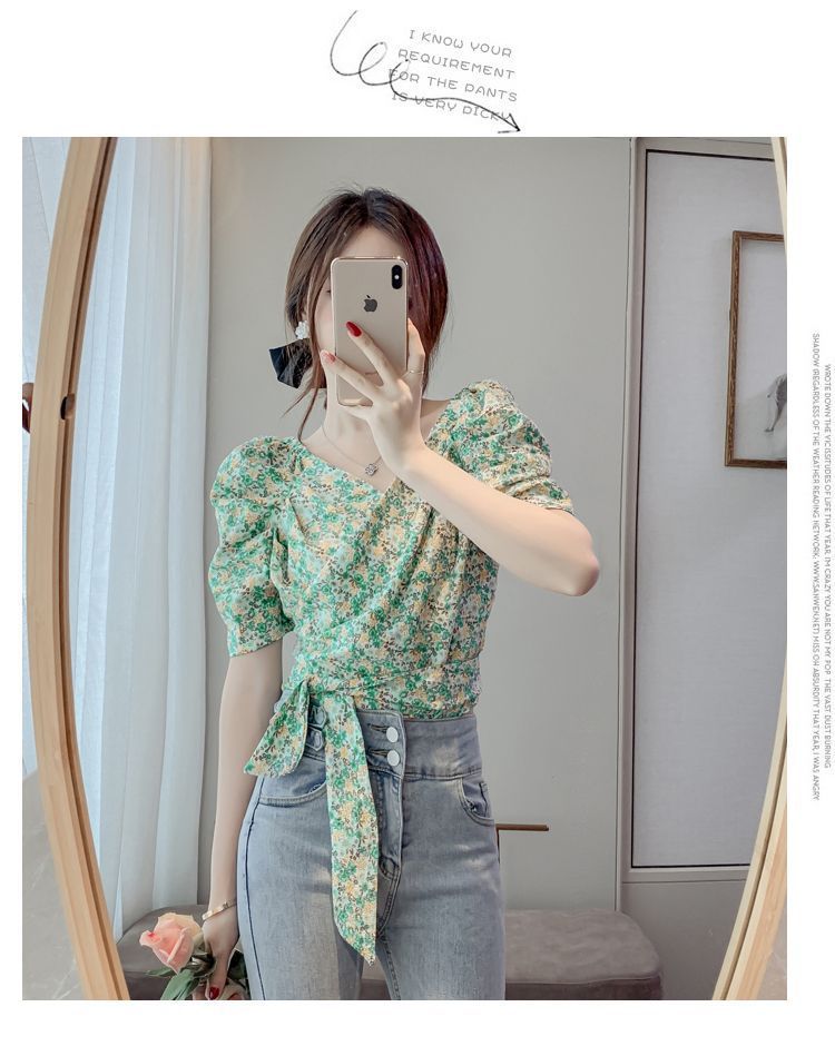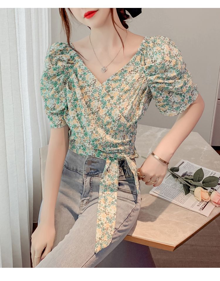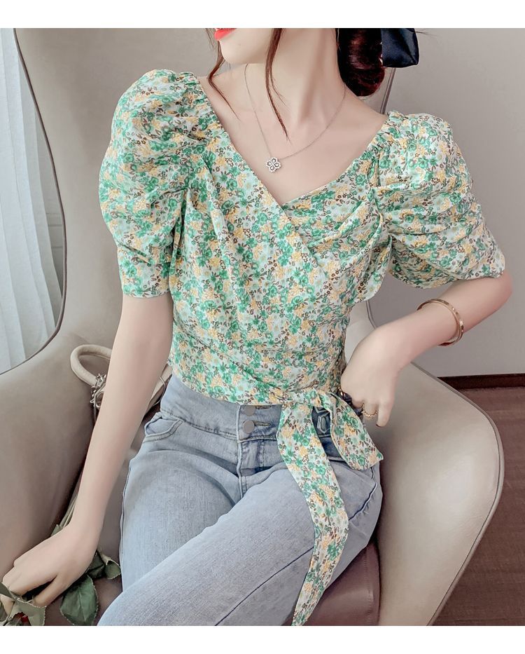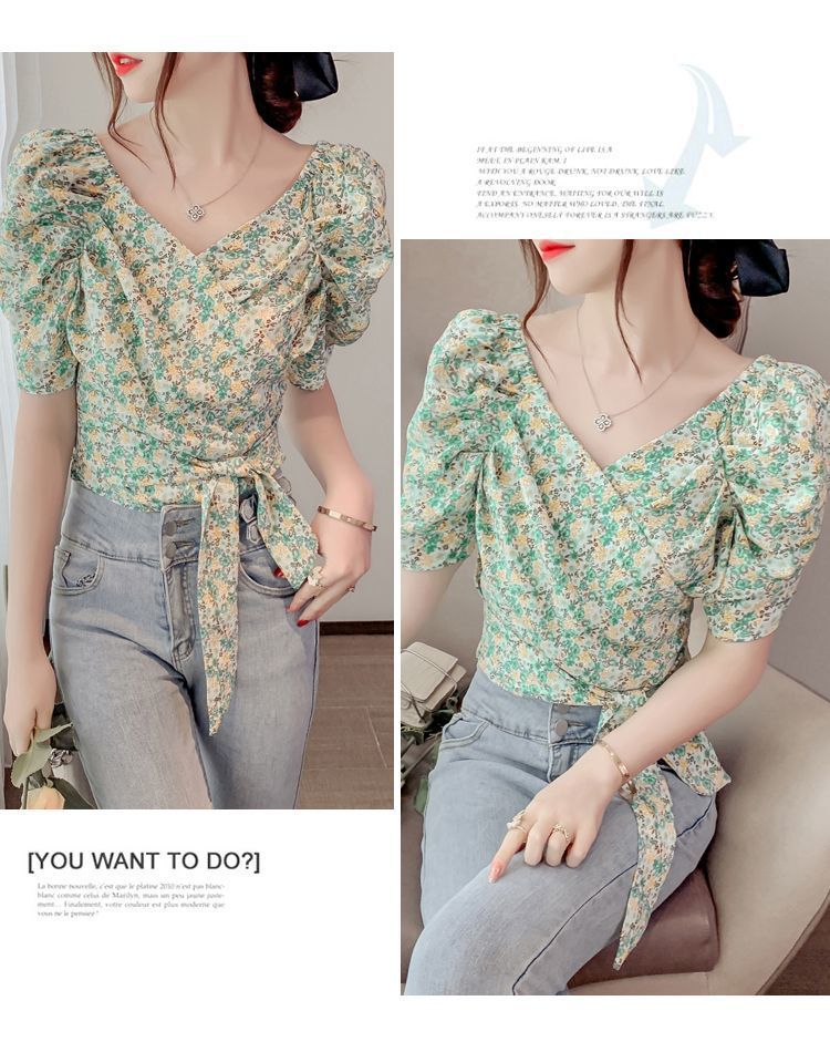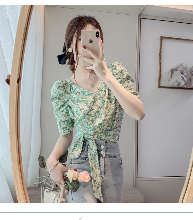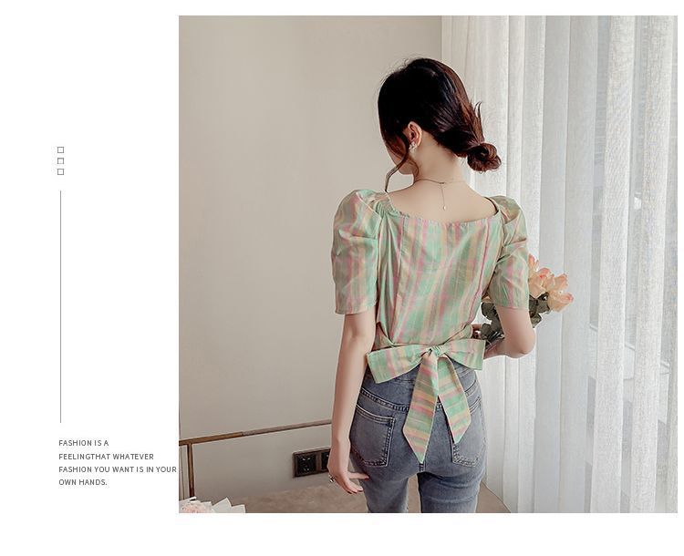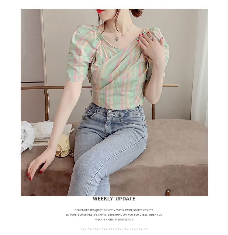 프렌치 V 넥 격자 무늬 쉬폰 반팔 셔츠 활 여름 독특한 세련된 디자인 센스 퍼프 소매 짧은
