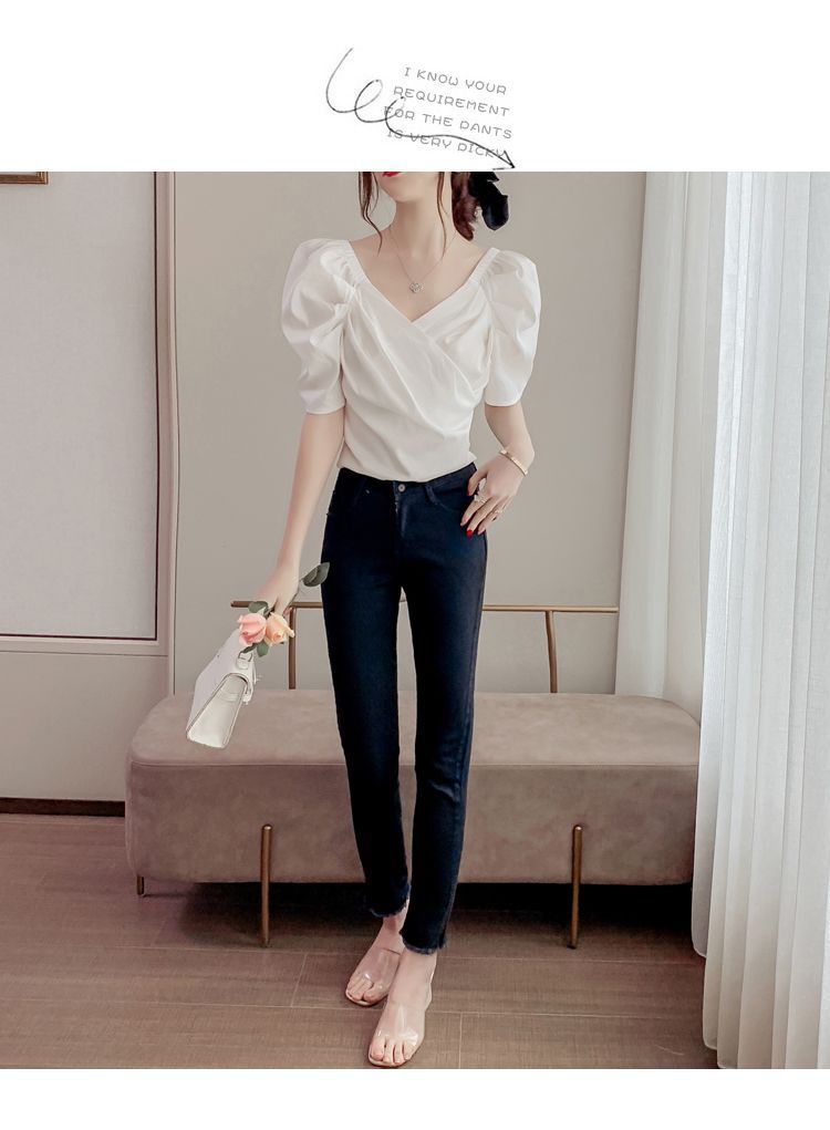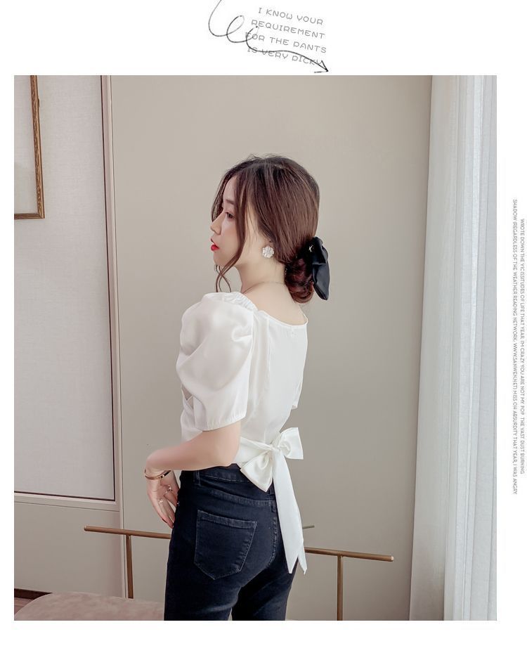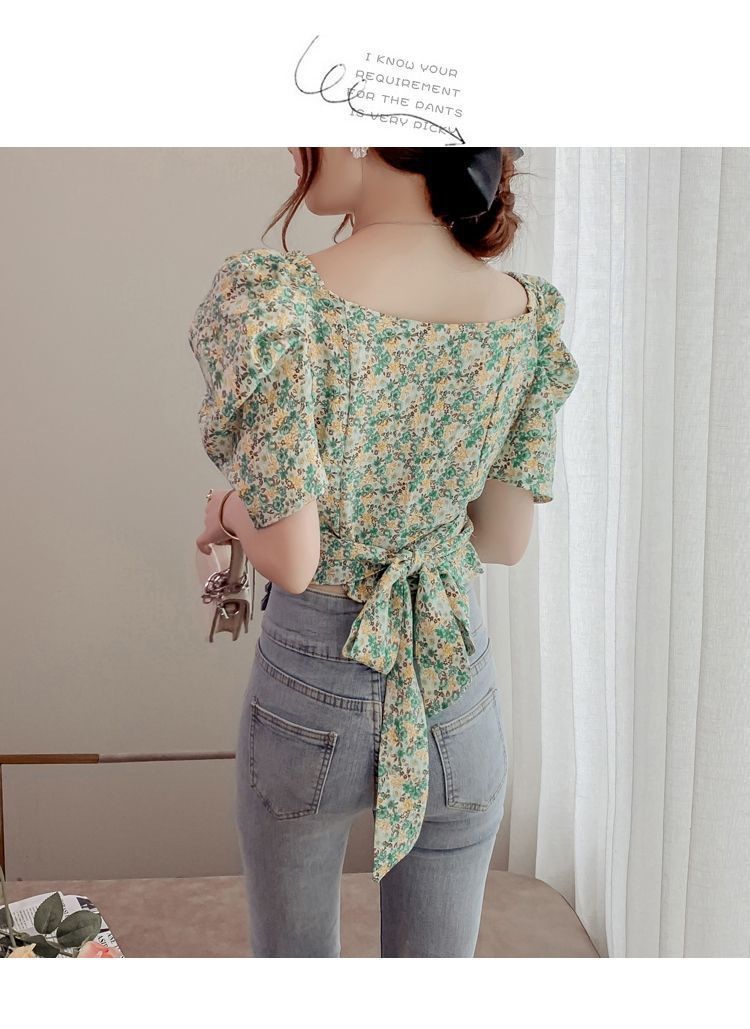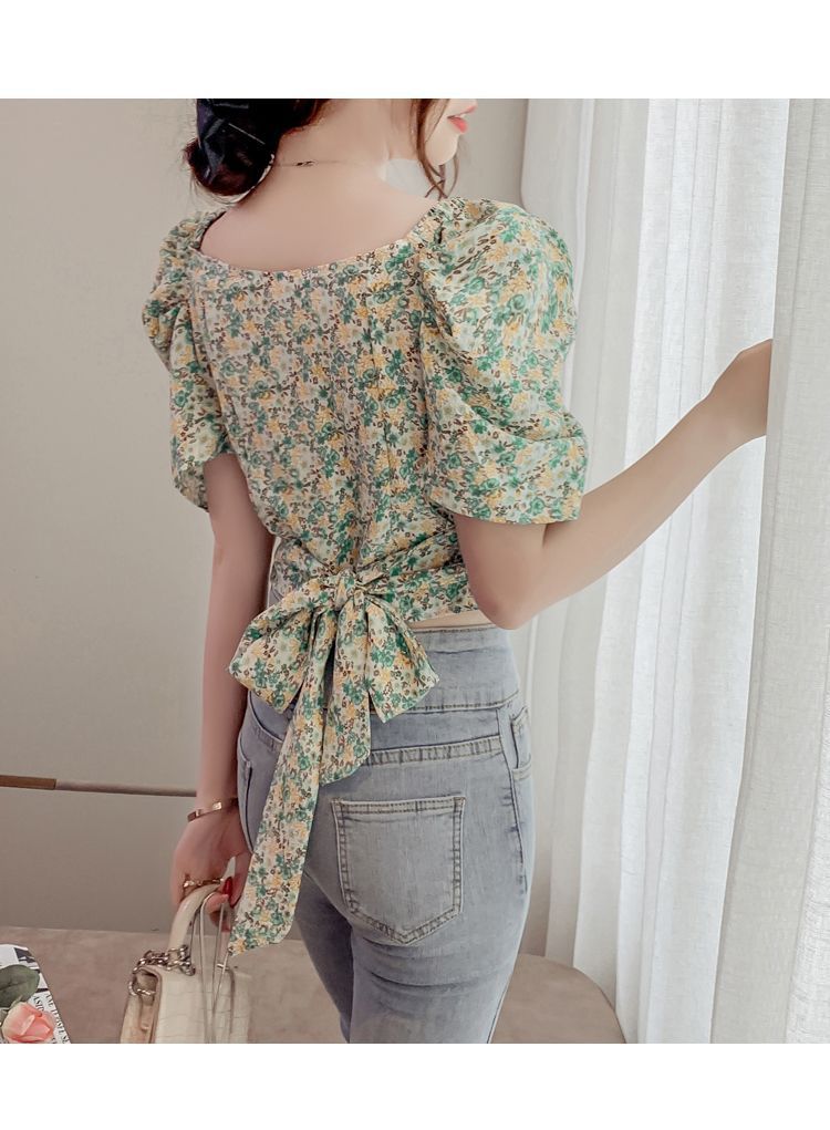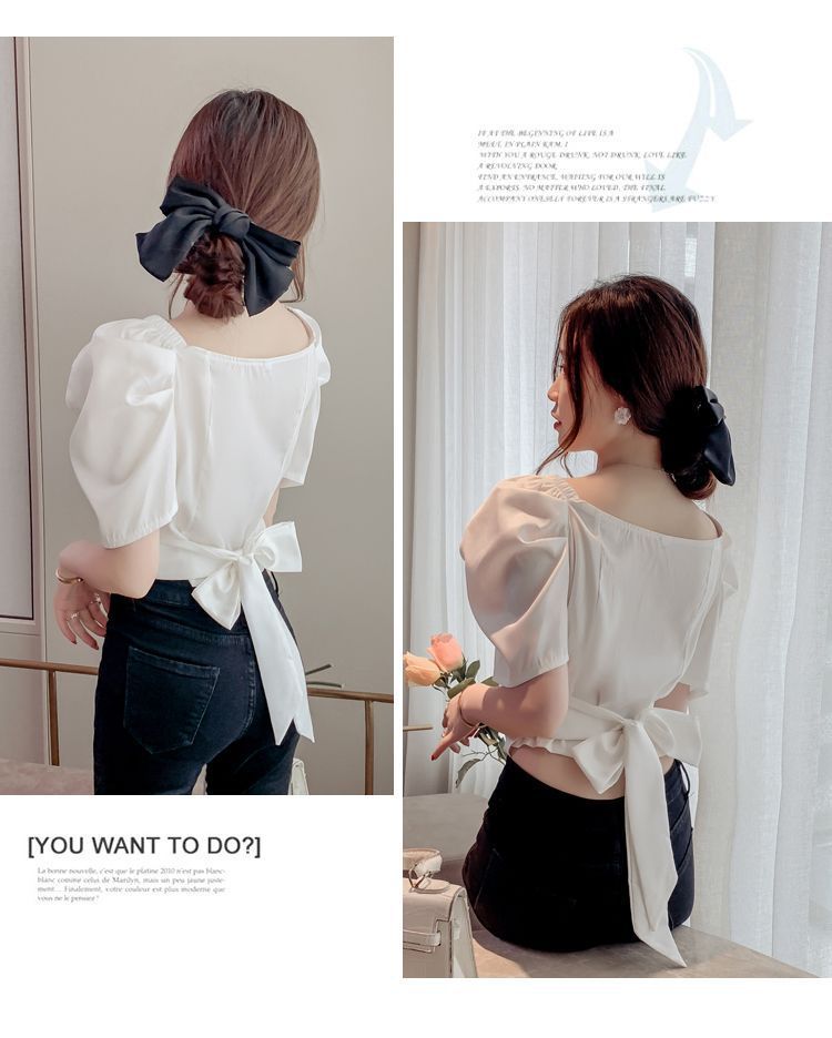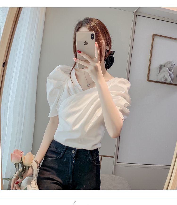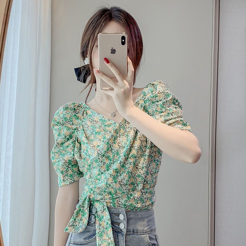 프렌치 V 넥 격자 무늬 쉬폰 반팔 셔츠 활 여름 독특한 세련된 디자인 센스 퍼프 소매 짧은