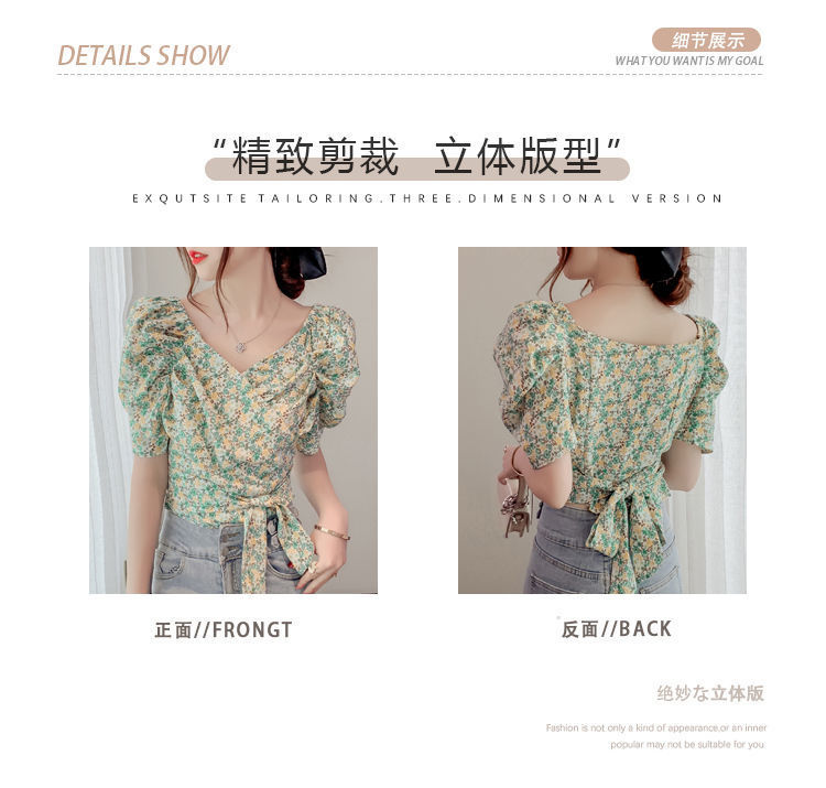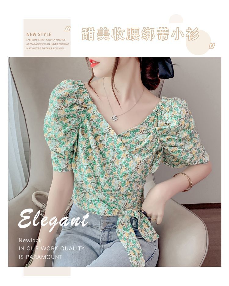 프렌치 V 넥 격자 무늬 쉬폰 반팔 셔츠 활 여름 독특한 세련된 디자인 센스 퍼프 소매 짧은스토어 가기