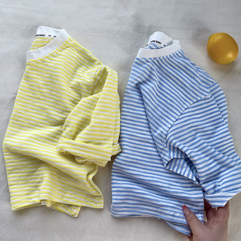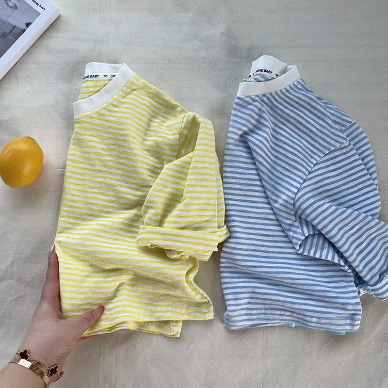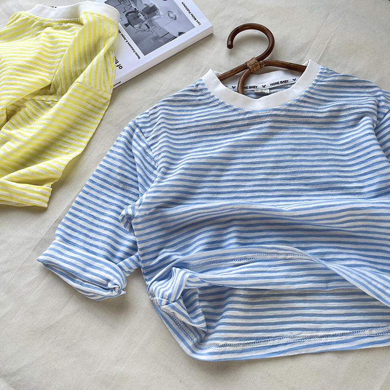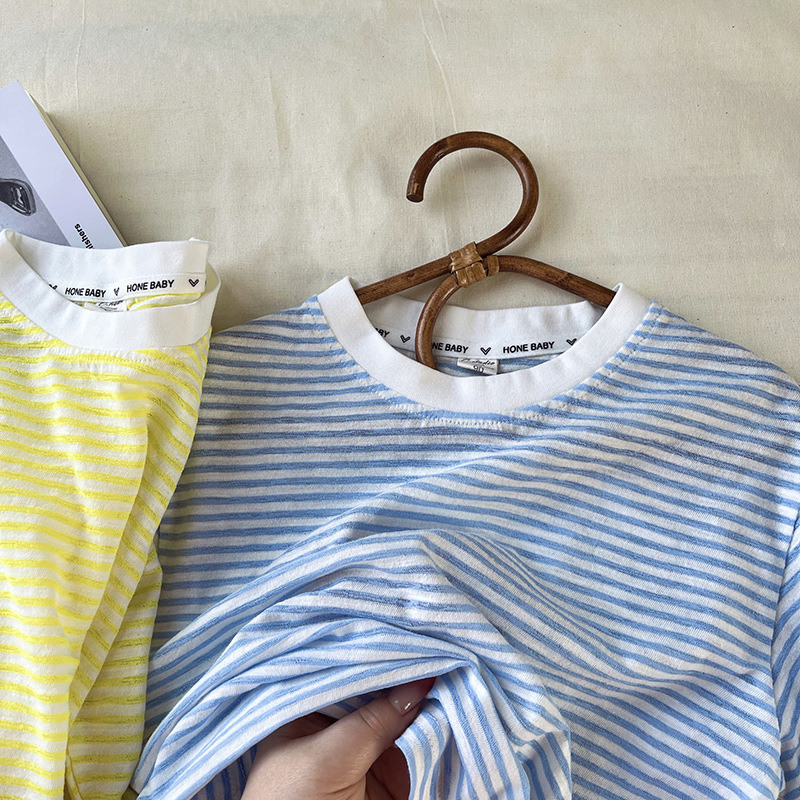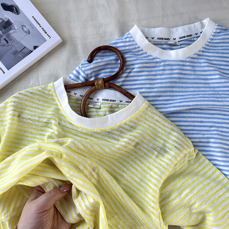 [산경] 아동용 티셔츠 2026 여름 신상품 남아 여아 스트라이프 긴팔 티셔츠 유아용 신축성 있는 자외선 차단 티셔츠 얇은 티셔츠