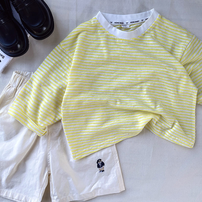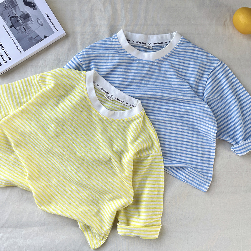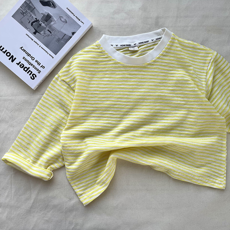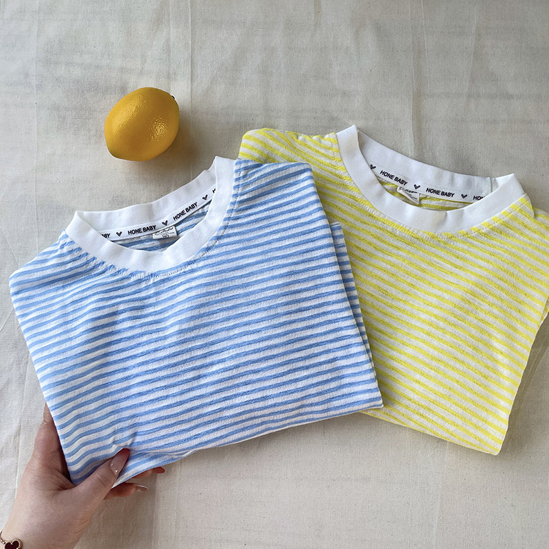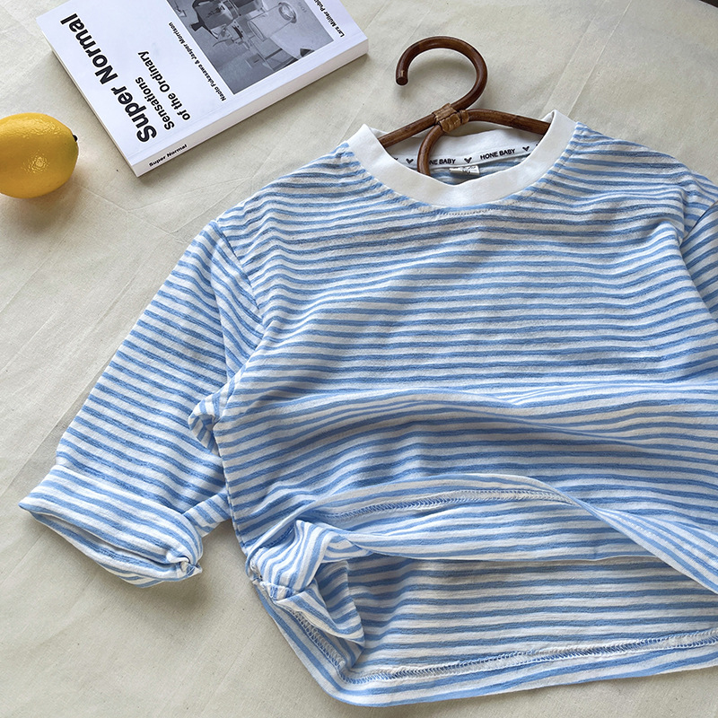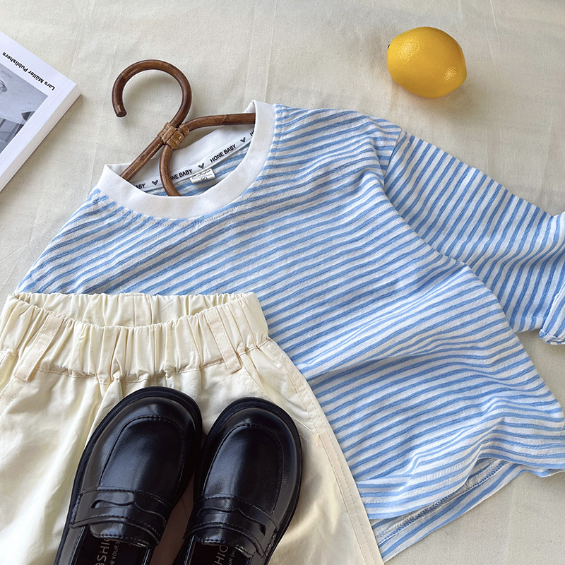 [산경] 아동용 티셔츠 2026 여름 신상품 남아 여아 스트라이프 긴팔 티셔츠 유아용 신축성 있는 자외선 차단 티셔츠 얇은 티셔츠